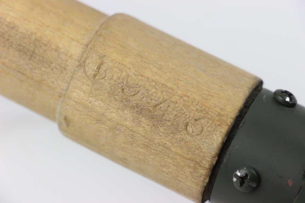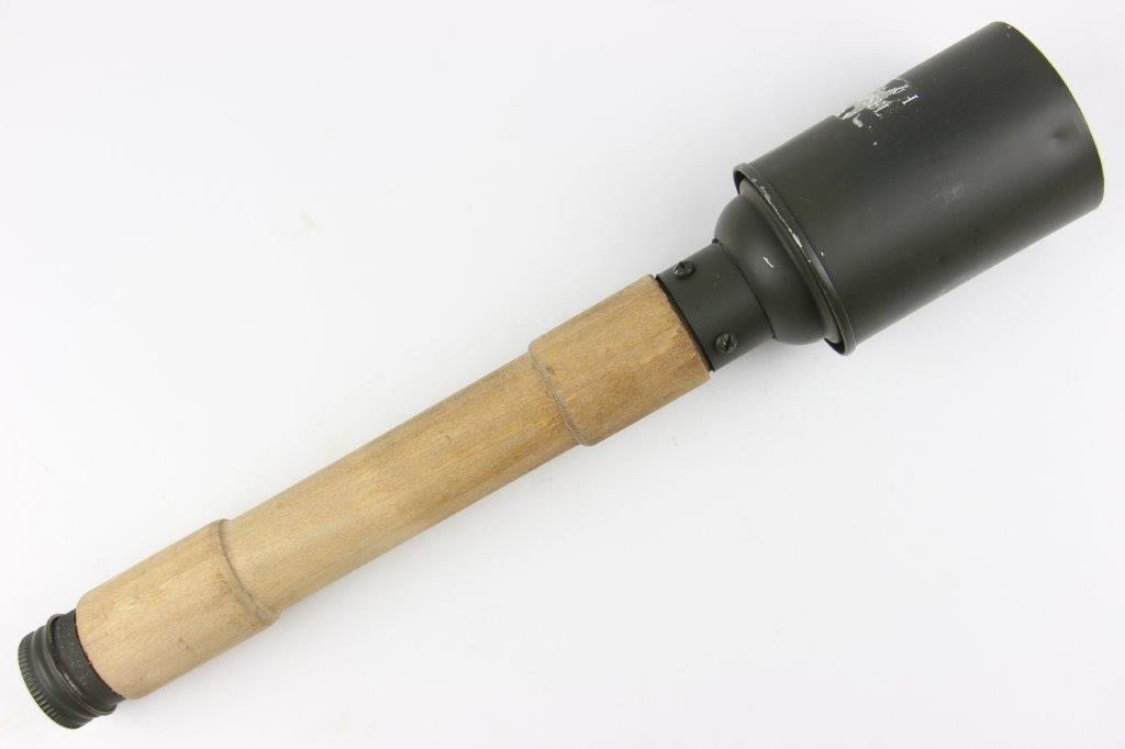 10/8/24 – This is a quality reproduction German M24 style Stick Grenade. The grenade is inert and makes for great display or used for re-enactors. The grenade features an internal string and a metal base that pulls off. The wood handle is excellent and stamped “1943”. The metal top has olive green paint and minimal edge wear / paint loss. The label is mostly intact as well. Full sized replica.