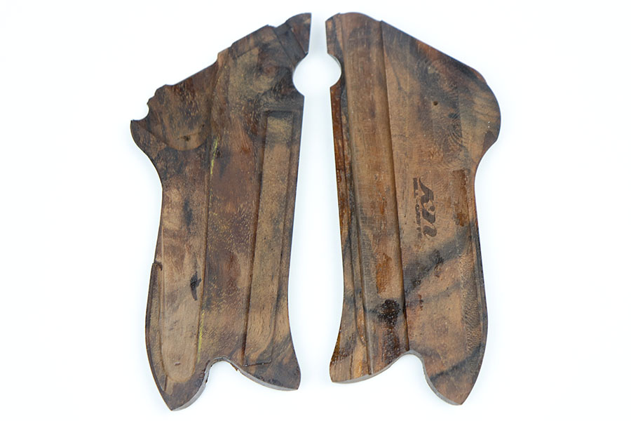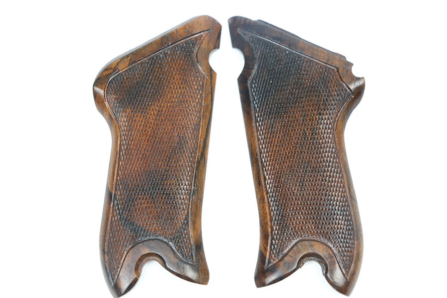 4/5/21 – This is an excellent condition and quality reproduction pair of luger grips in a style appropriate for an early M1900 Luger. Excellent and crisp checkering on the front and maker marked on the reverse as shown.
