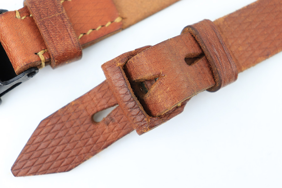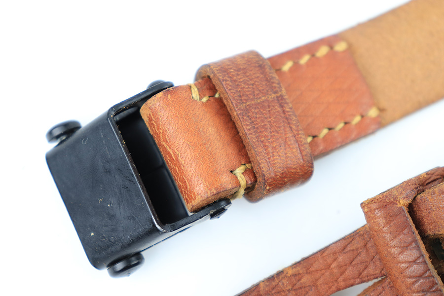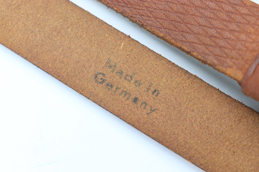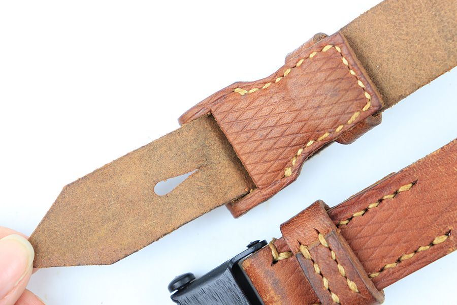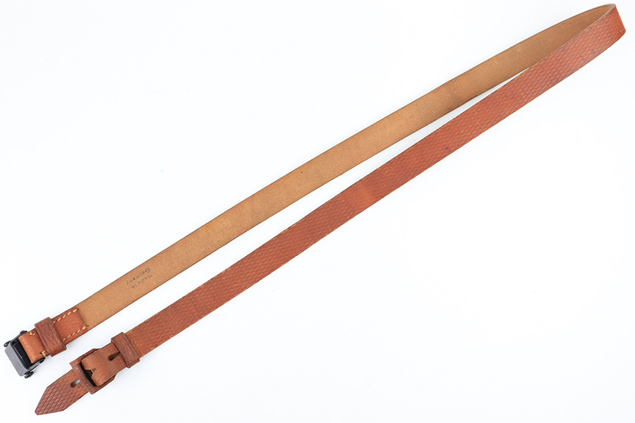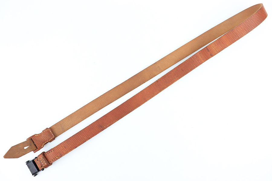 8/21/23 – This is a high quality German reproduction K98 leather rifle sling. The leather is clean and strong with no major issues. Ink stamped “Made in Germany” on the interior. Comes complete with metal fixtures, leather tab, and all stitching intact.