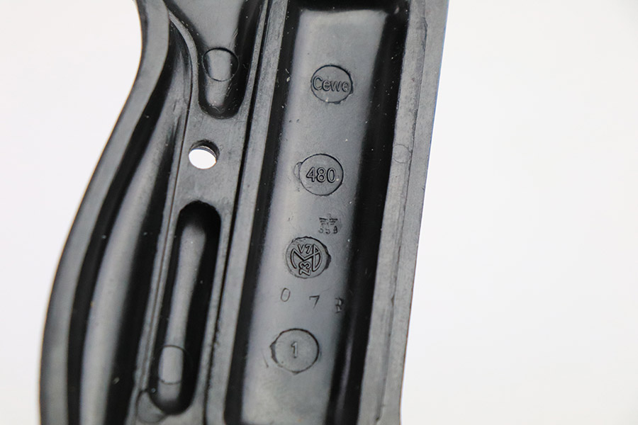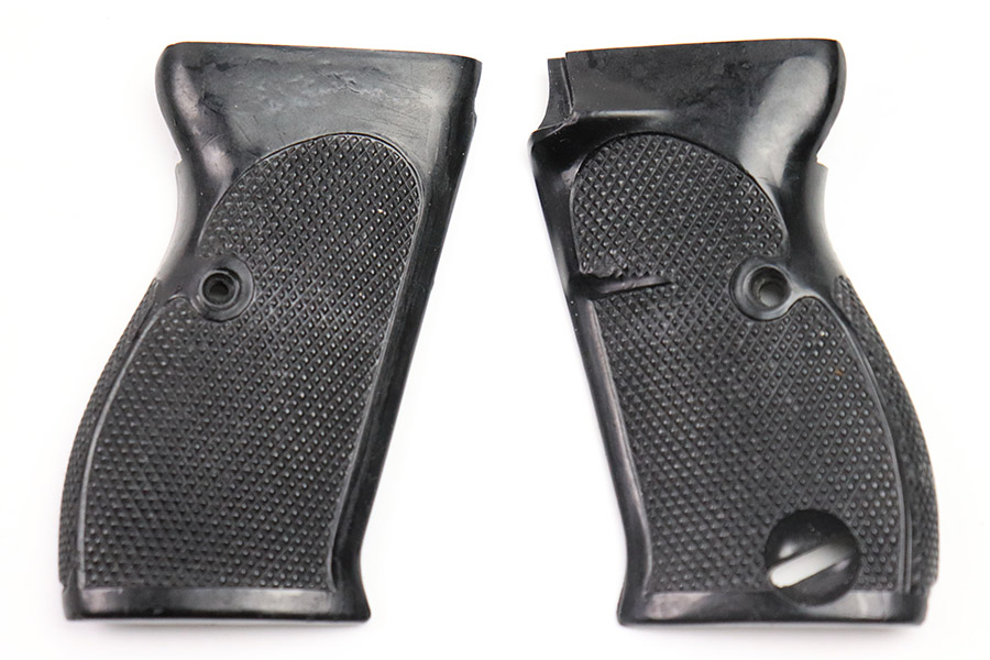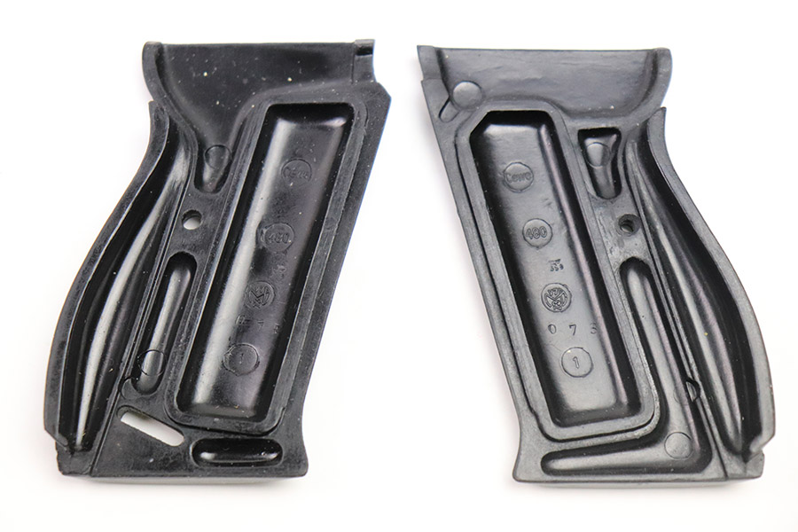 10/31/22 – This is an excellent set of reproduction zero series P.38 grips. There is a small patch of rub wear on the left-hand grip next to the screw hole but there is otherwise minimal handling wear throughout. The grips do not include a grip screw or escutcheon. Both grips are eagle 359 proof marked and serial numbered “073”. High quality reproduction grips make for a great placeholder or “shooter” pair of grips.