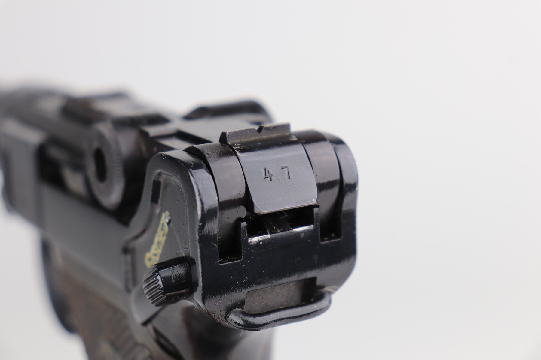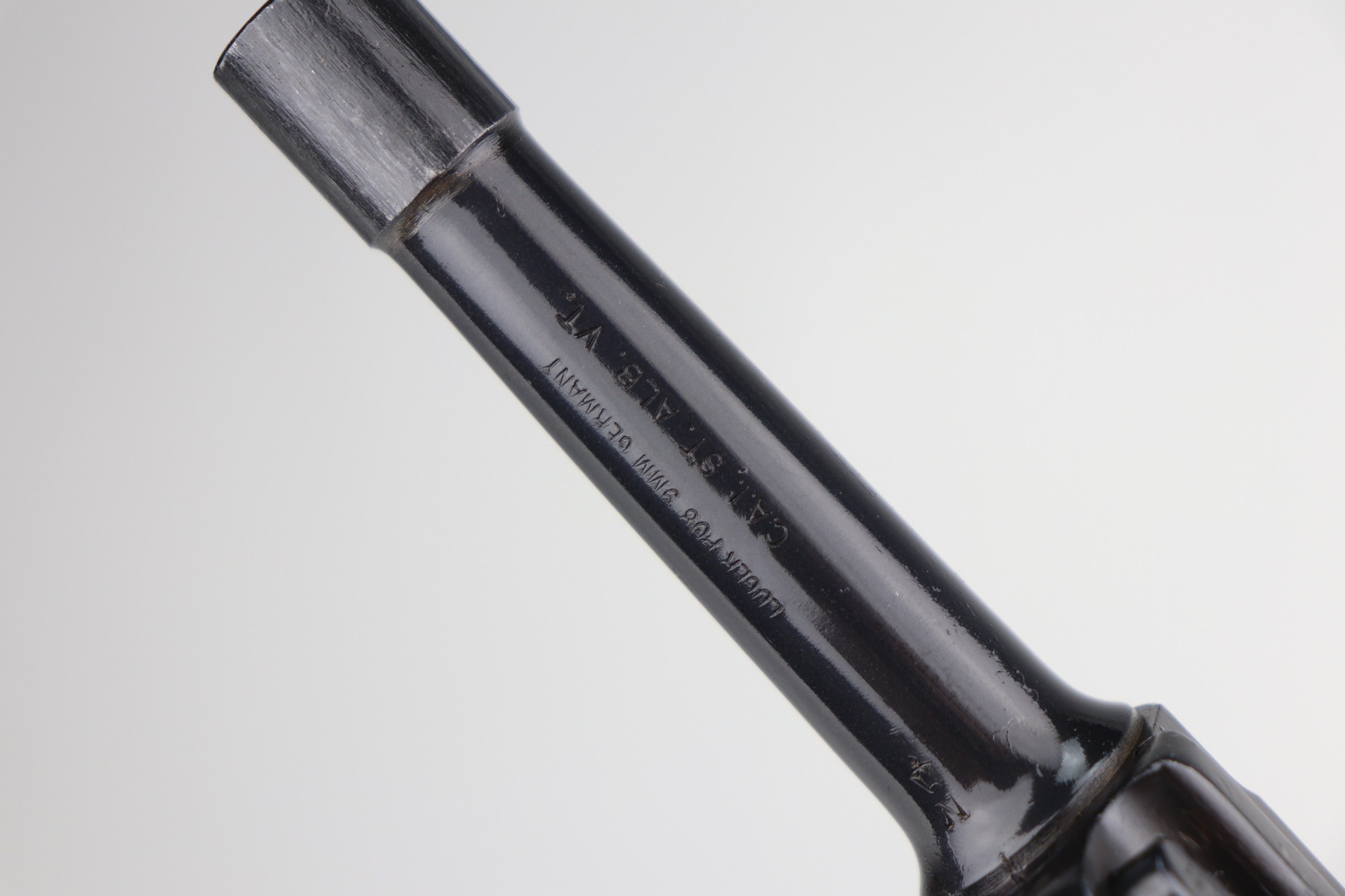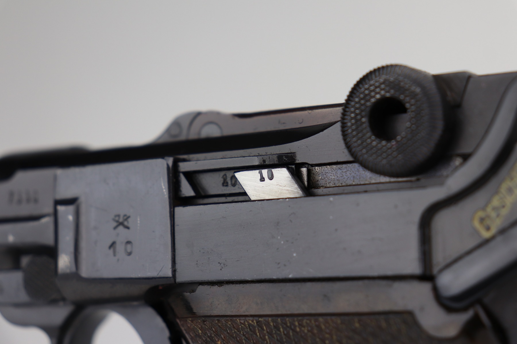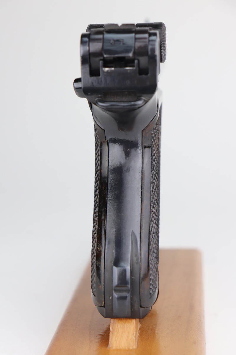 3/15/21 – This pistol has an interesting history. It started its life as a K Date Mauser Luger issued to the Nazi military in 1934. It has the proper K Date proofs and a faint K Date on the chamber. It was then likely reworked by the East German police after WW2. These are often known as “VoPo” Lugers. It is mostly matching (except for the rear toggle), but some of the parts have been re-numbered to match. This was likely done at the police arsenal. Also at the police arsenal, the gun was refinished, given a set of post war grips, and a matching post-war magazine. There is an import mark on the barrel. It has retained virtually all of its bluing with minor wear on the side plate and front edges of the frame. Spotty oxidation on the straps. Very nice bore – shiny with good rifling.