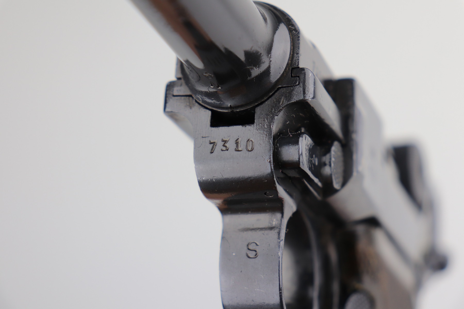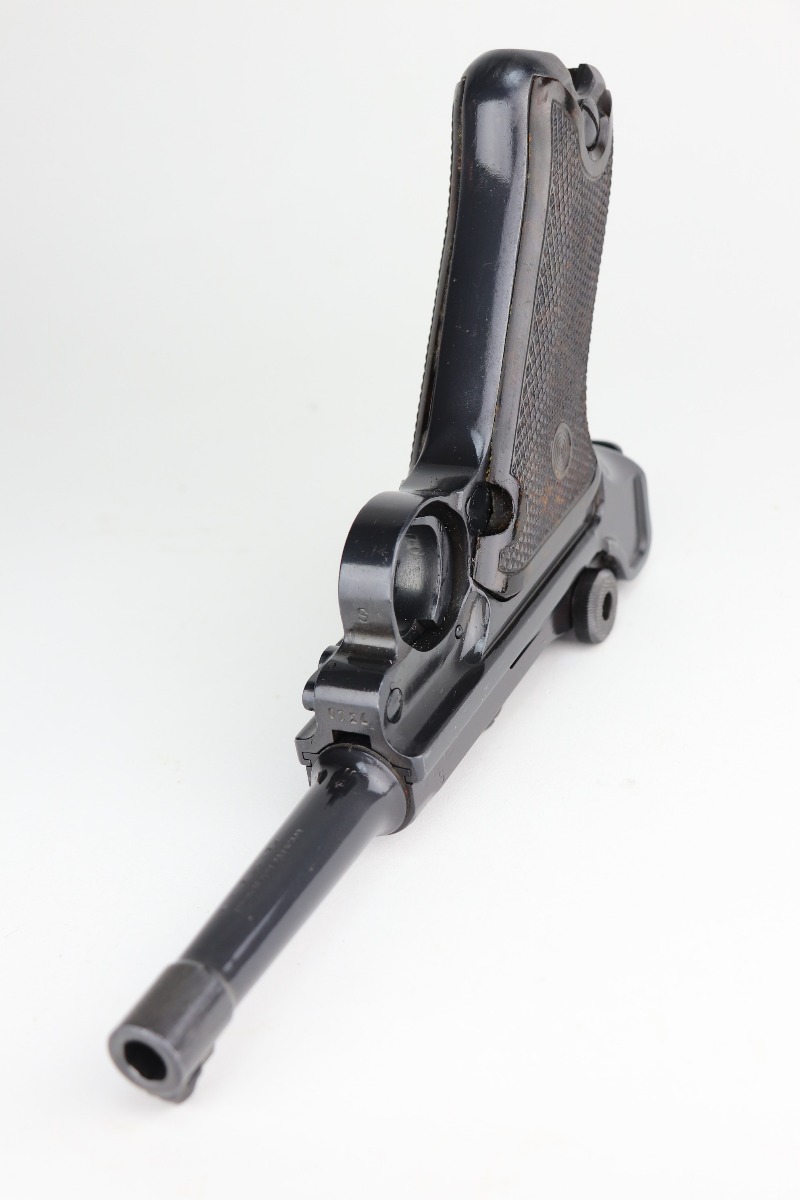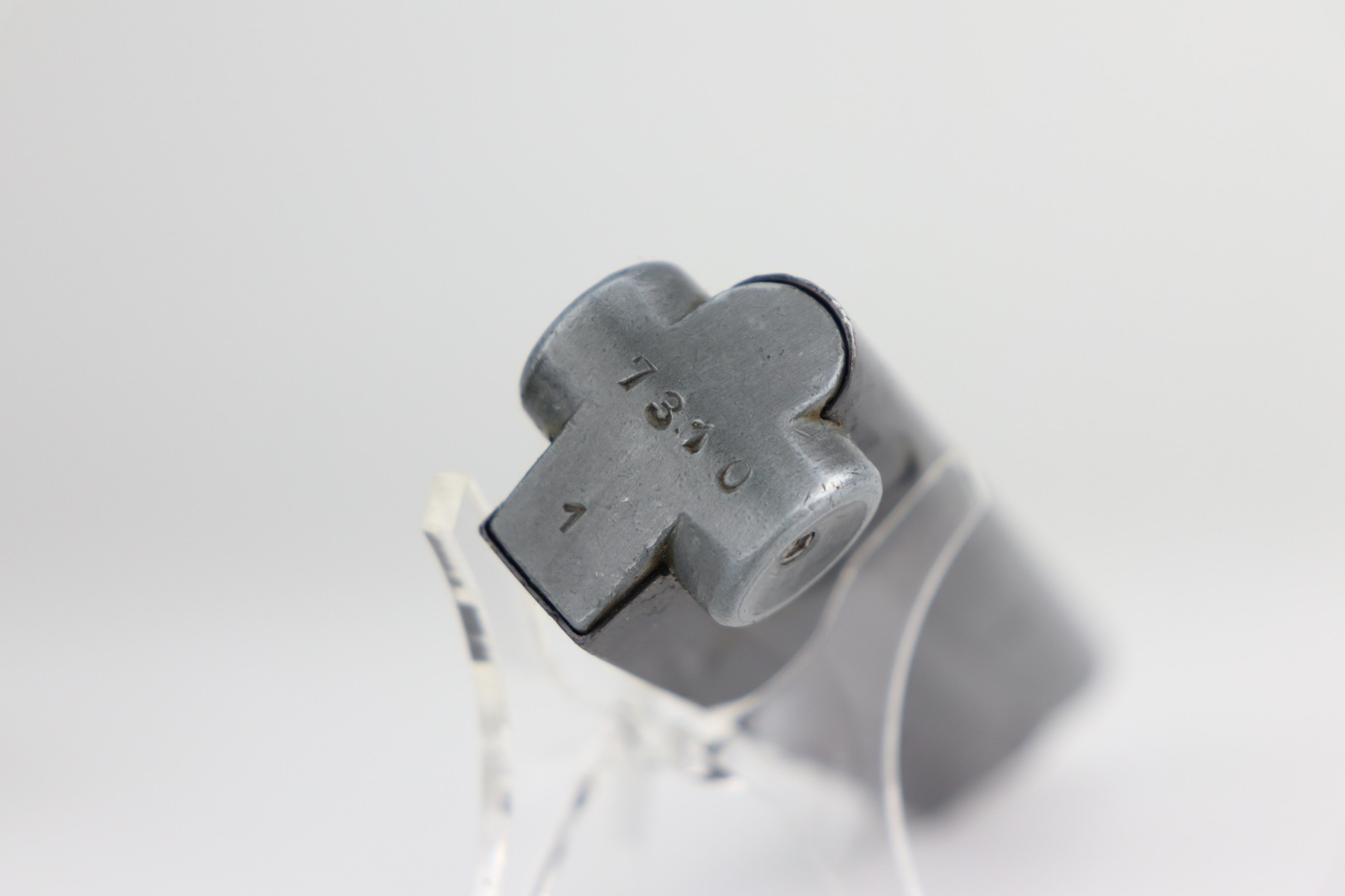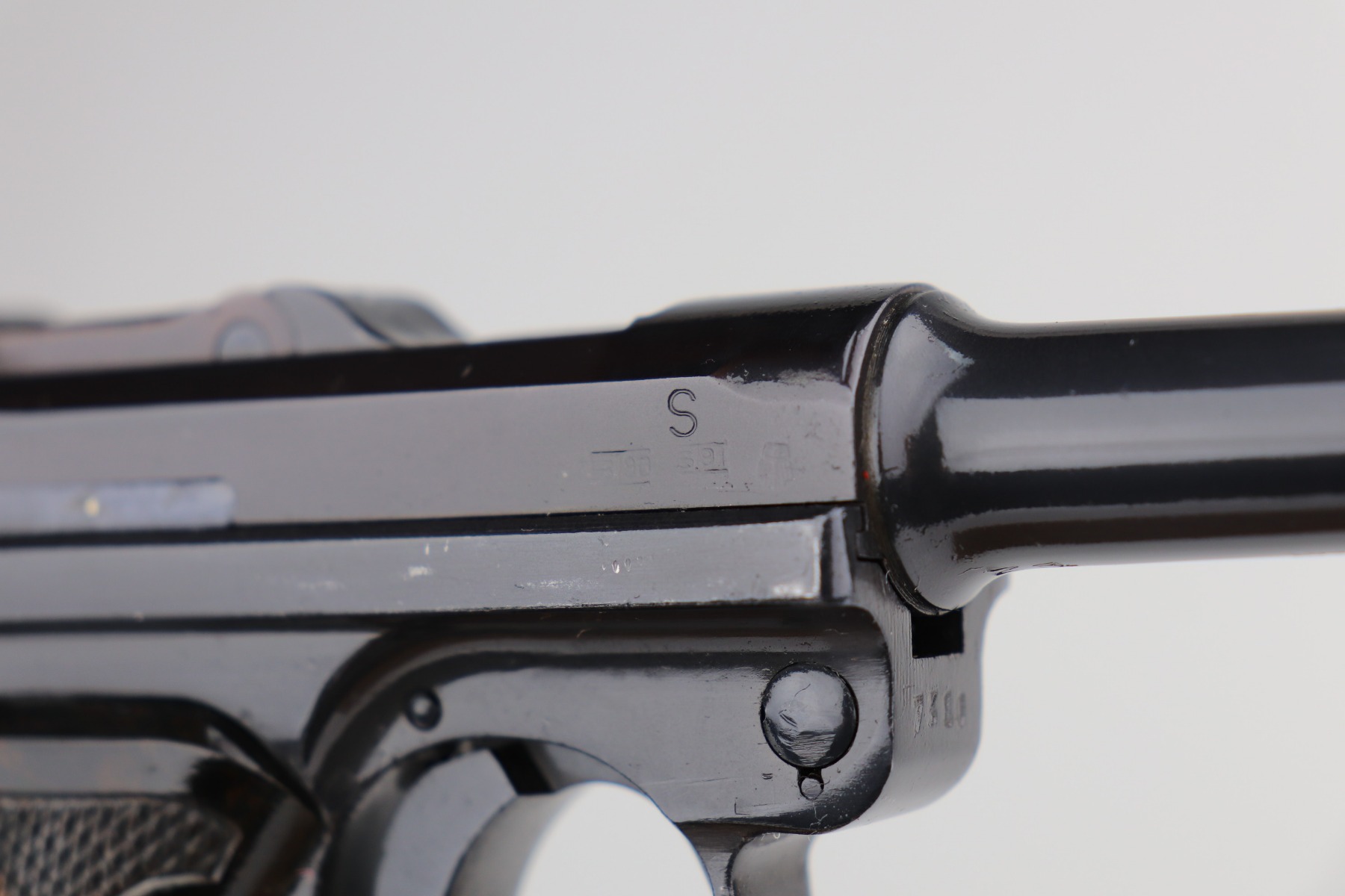 3/15/21 – This pistol has an interesting history. It started its life as a K Date Mauser Luger issued to the Nazi military in 1934. It has the proper K Date proofs and a faint K Date on the chamber. It was then likely reworked by the East German police after WW2. These are often known as “VoPo” Lugers. It is mostly matching (except for the rear toggle), but some of the parts have been re-numbered to match. This was likely done at the police arsenal. Also at the police arsenal, the gun was refinished, given a set of post war grips, and a matching post-war magazine. There is an import mark on the barrel. It has retained virtually all of its bluing with minor wear on the side plate and front edges of the frame. Spotty oxidation on the straps. Very nice bore – shiny with good rifling.