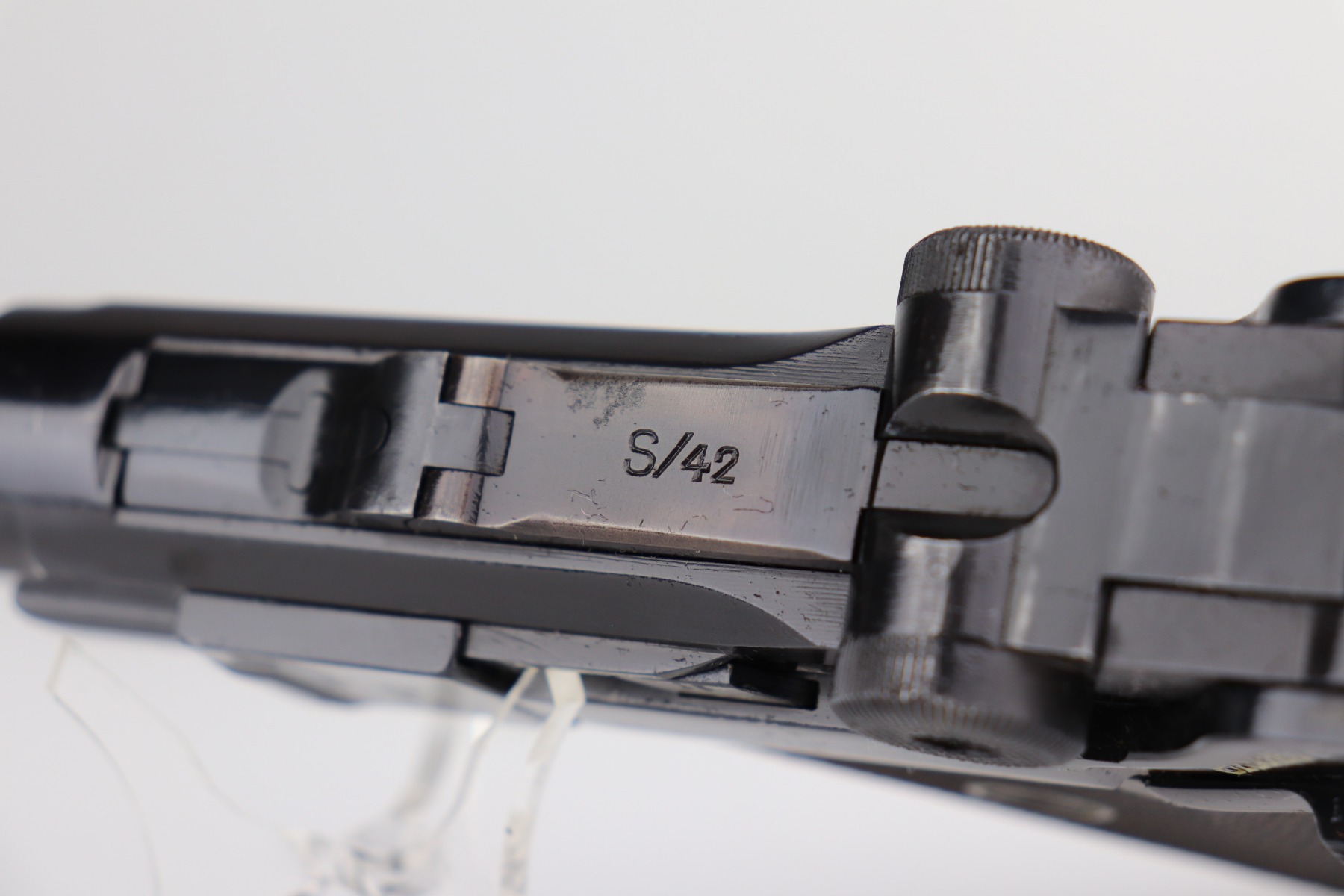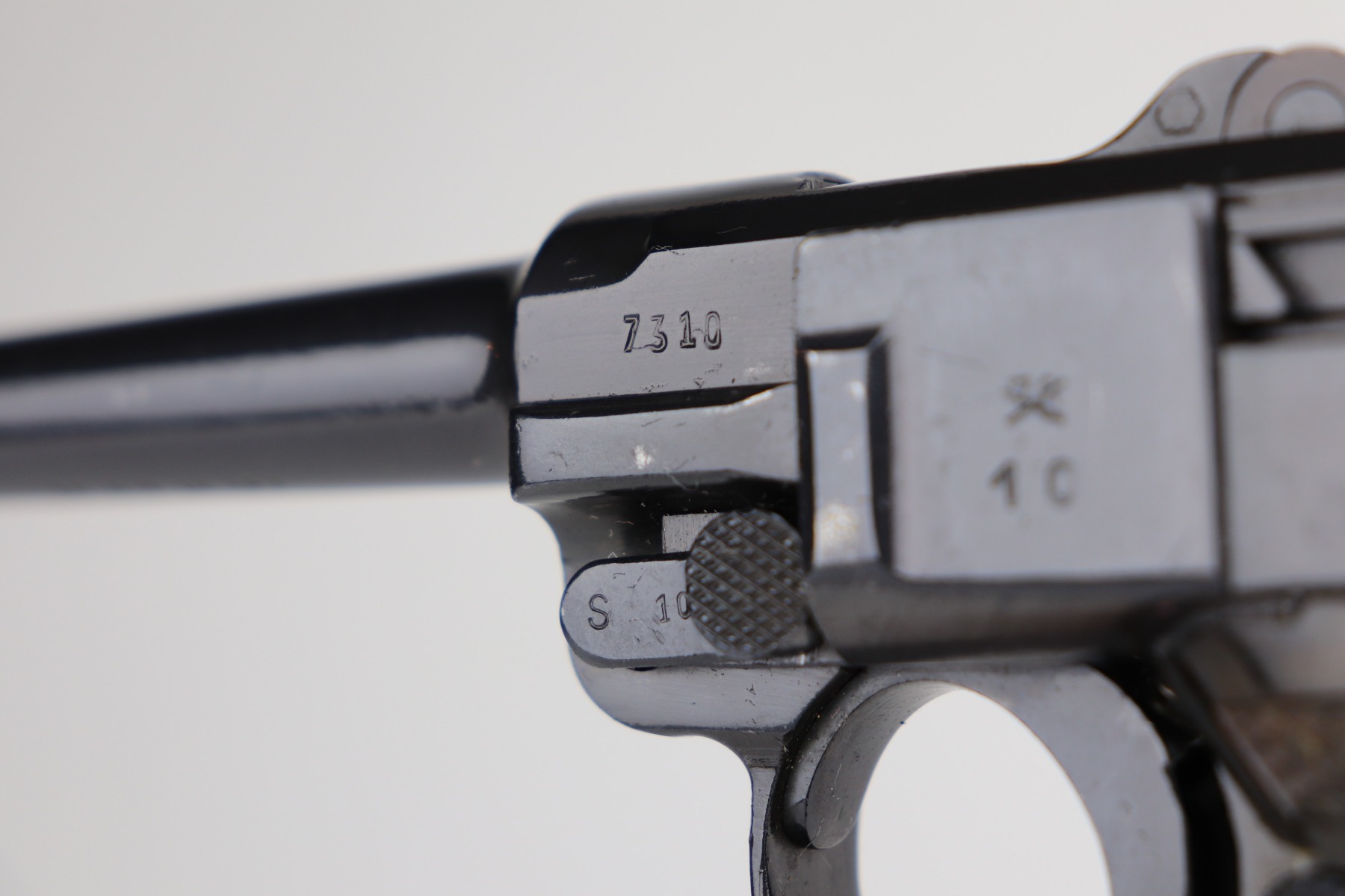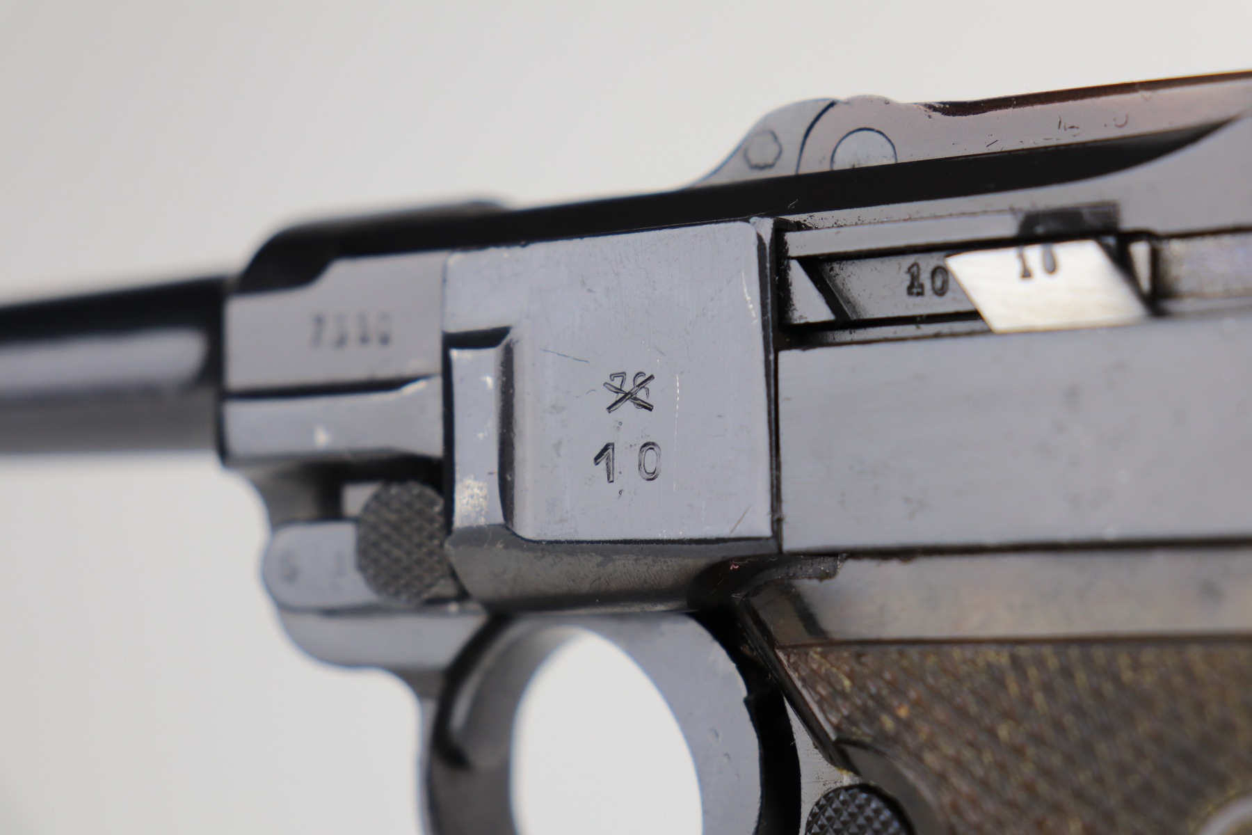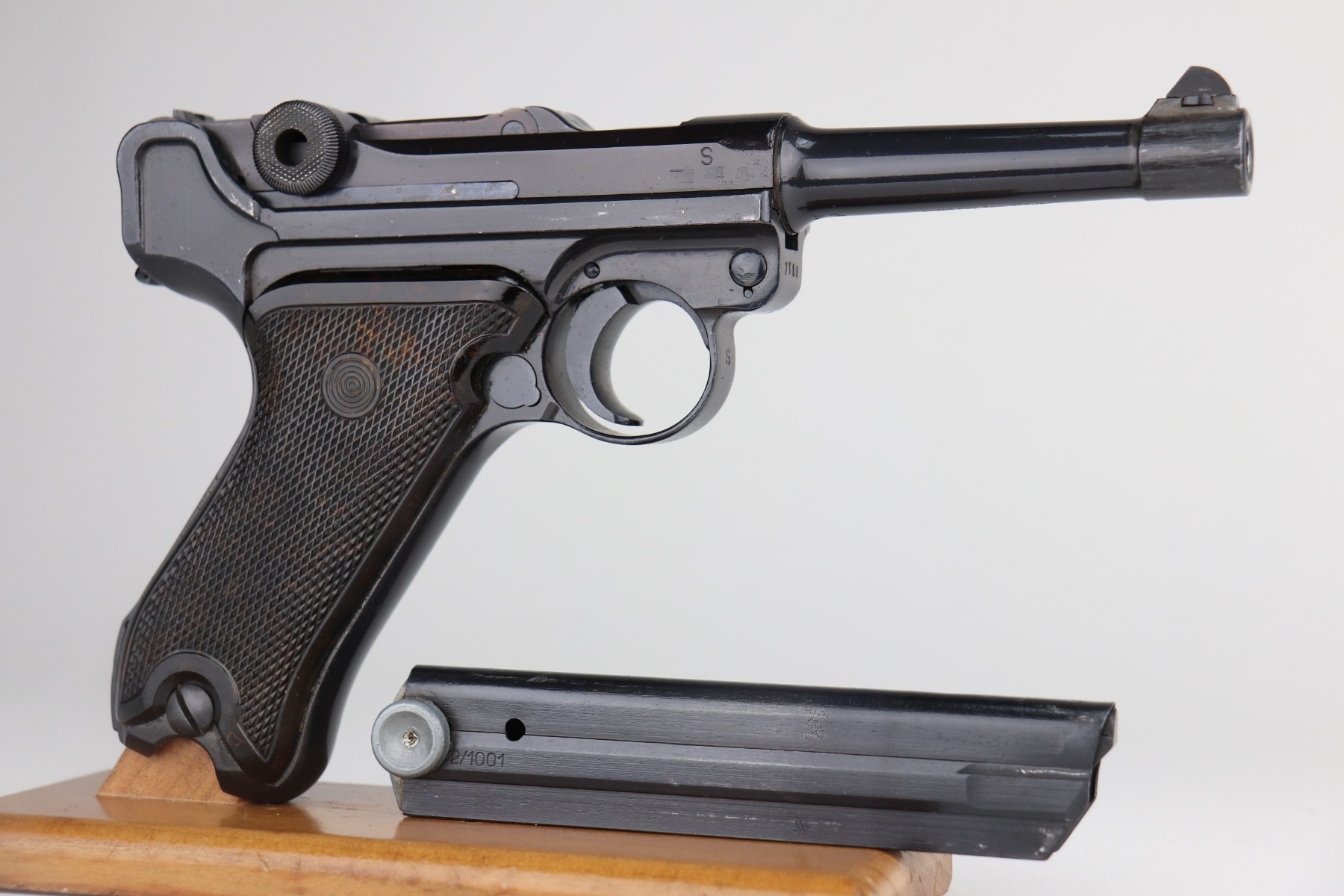 3/15/21 – This pistol has an interesting history. It started its life as a K Date Mauser Luger issued to the Nazi military in 1934. It has the proper K Date proofs and a faint K Date on the chamber. It was then likely reworked by the East German police after WW2. These are often known as “VoPo” Lugers. It is mostly matching (except for the rear toggle), but some of the parts have been re-numbered to match. This was likely done at the police arsenal. Also at the police arsenal, the gun was refinished, given a set of post war grips, and a matching post-war magazine. There is an import mark on the barrel. It has retained virtually all of its bluing with minor wear on the side plate and front edges of the frame. Spotty oxidation on the straps. Very nice bore – shiny with good rifling.