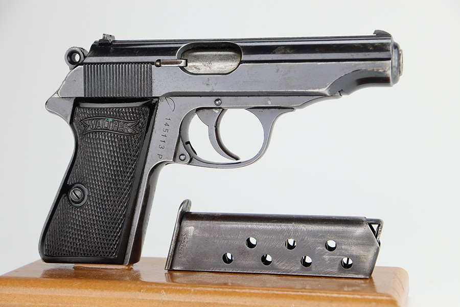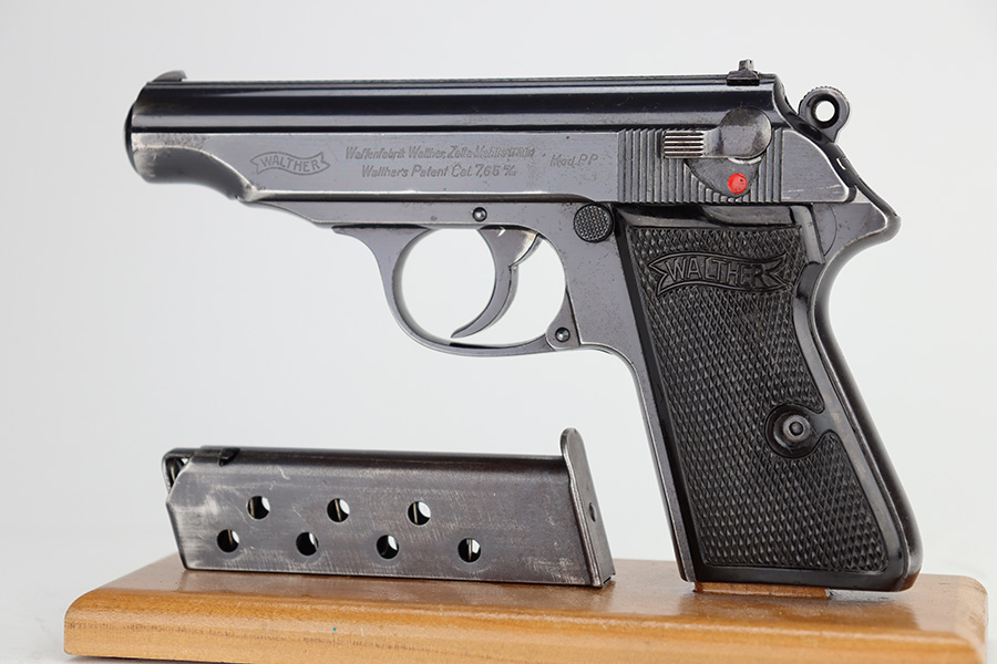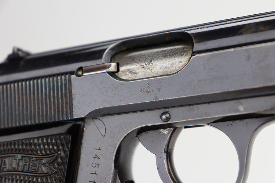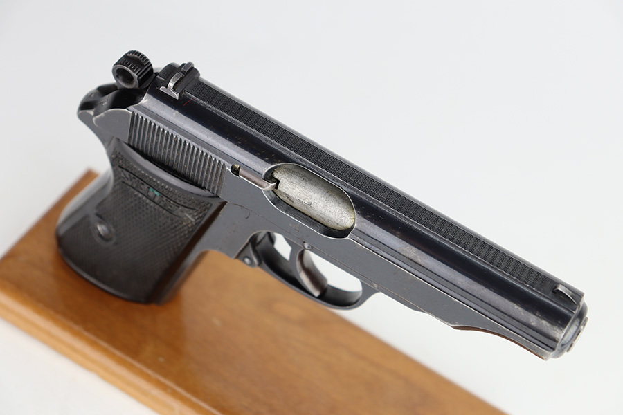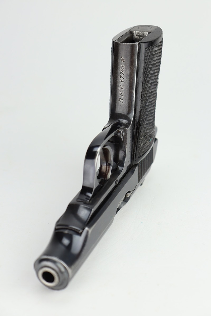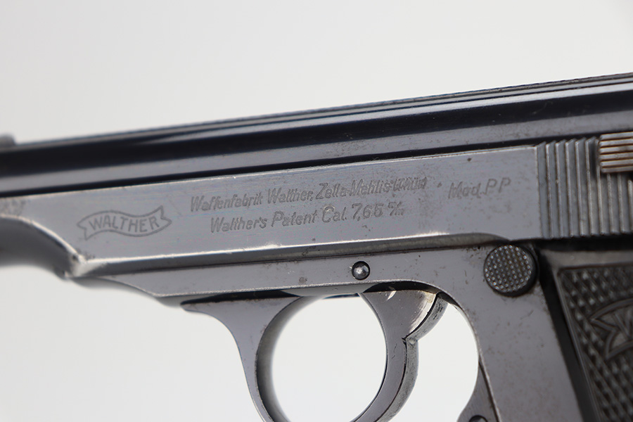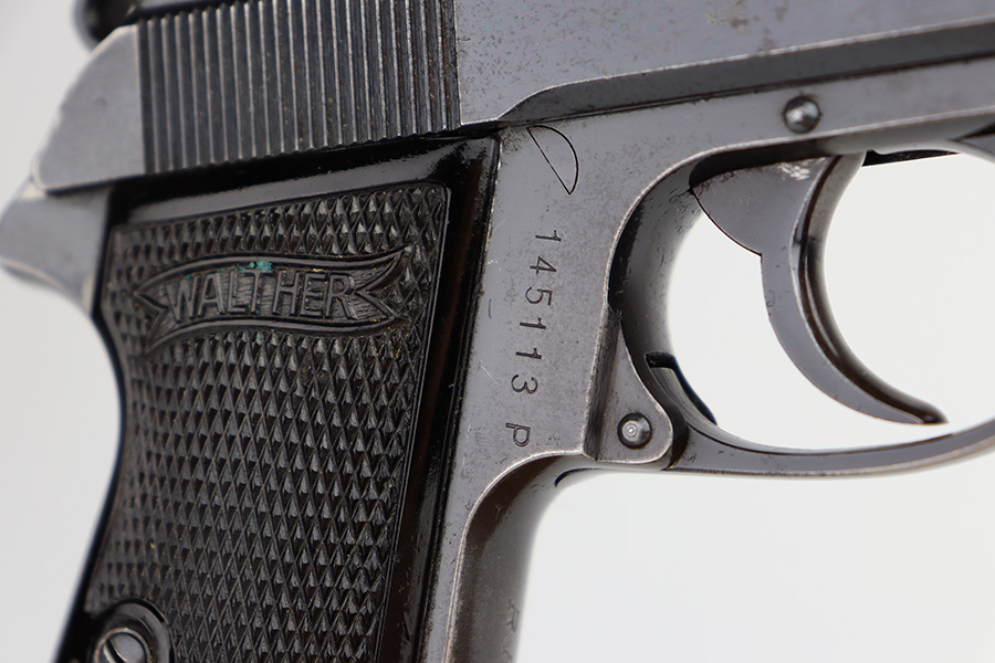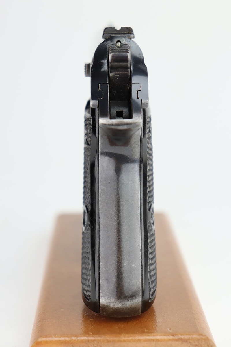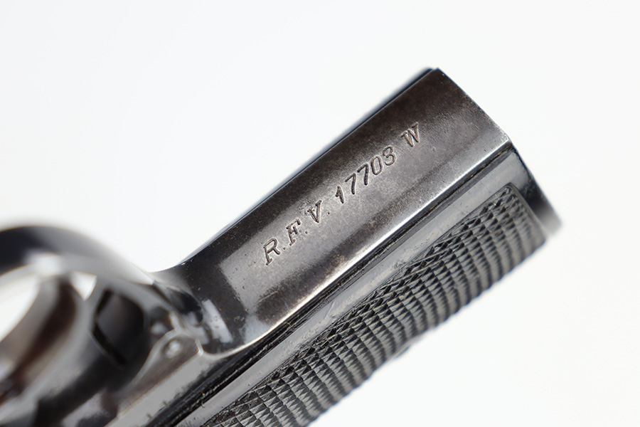 12/1/23 – This is a Walther PP designated for the Reichs Finanz Verwaltung. It is marked “R.F.V. 17703 W” on the front strap. This Third Reich department was in charge of the borders as well as government financial matters – much like our own IRS and border police. This one has retained somewhere between 85-90% of its original finish. There is wear around the muzzle, some spotty wear along the right side of the slide, and some thinning on the grip straps. Fitted with black bakelite grips and comes with a Walther banner-only magazine. Minty bore.