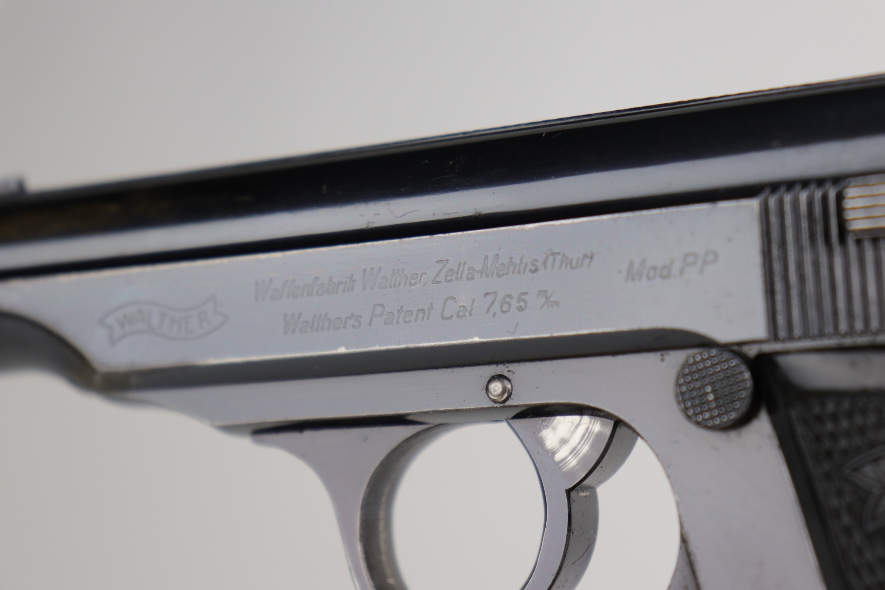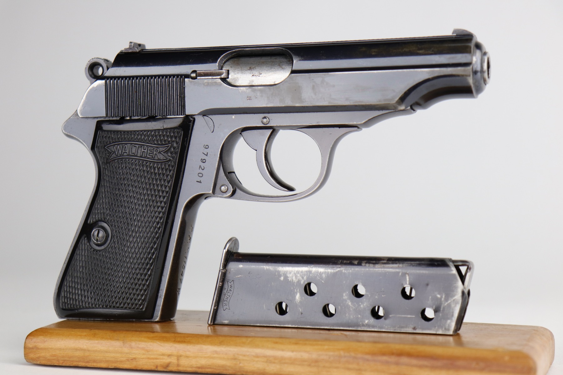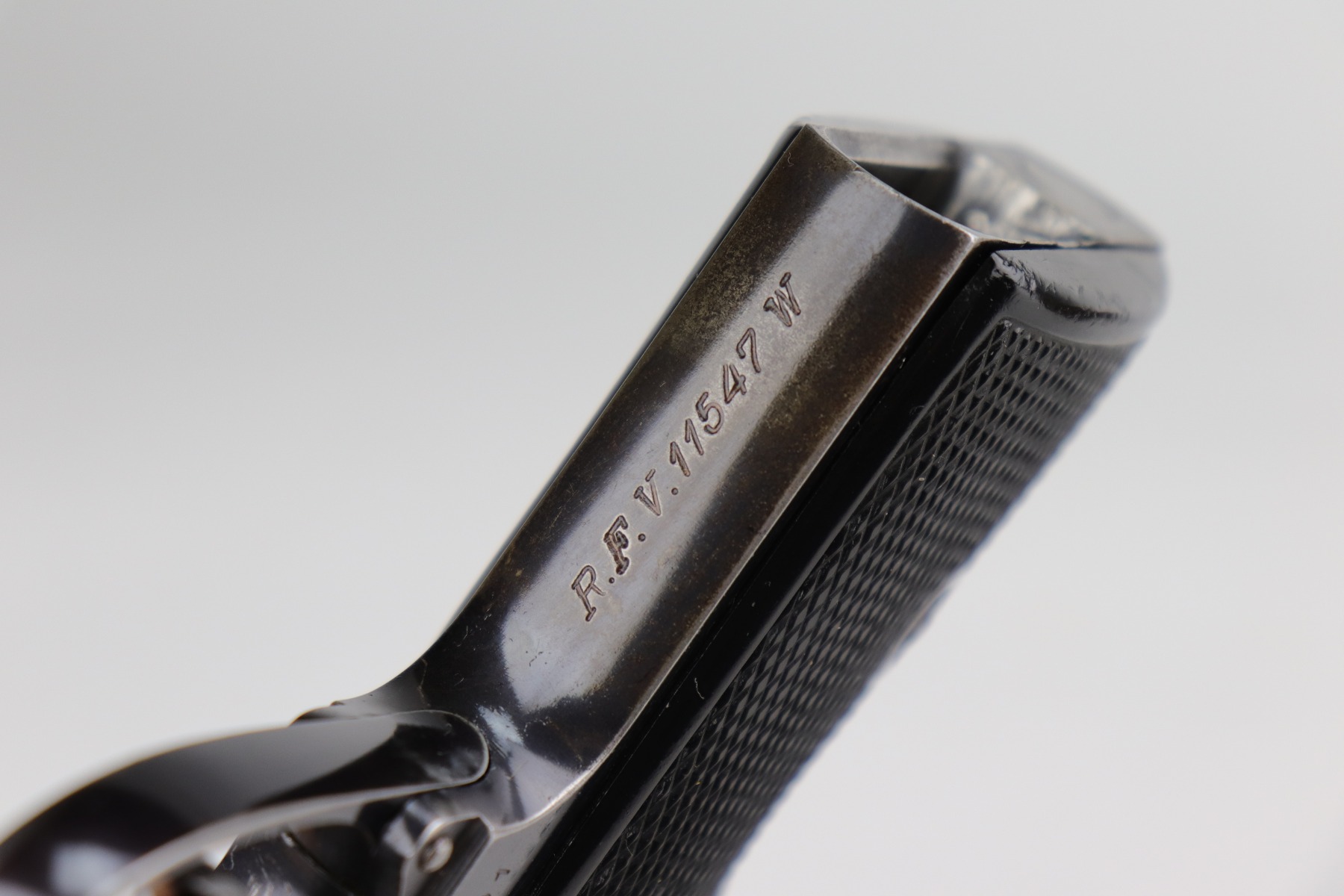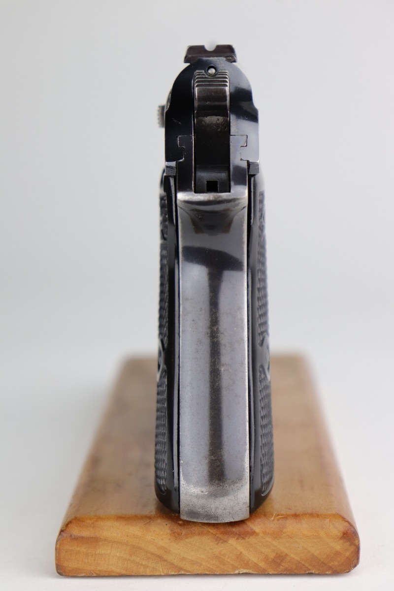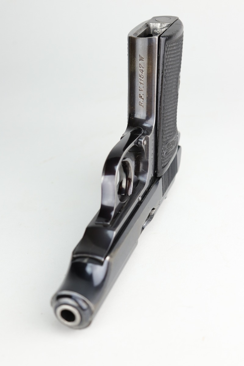 12/4/20 – This is a very nice example of a Walther PP that was issued to the Finance Bureau of the Third Reich in 1938. It is characterized by the “RFV” marking on the front strap. It is all matching and has retained roughly 85% of its bluing. There is minor high edge wear and spotty wear along both sides of the slide. There is thinning and spotty patina on the straps. One area of wear at the base of the back strap. It comes with excellent Walther grips and a Walther banner-only magazine. The bore is mint.
