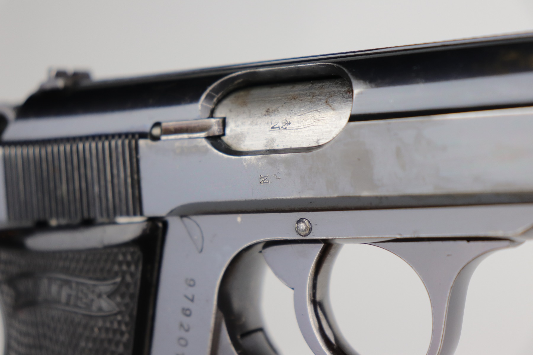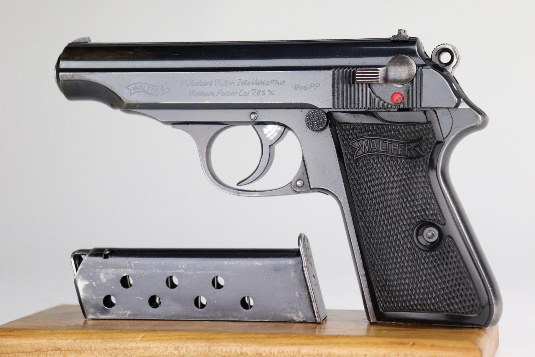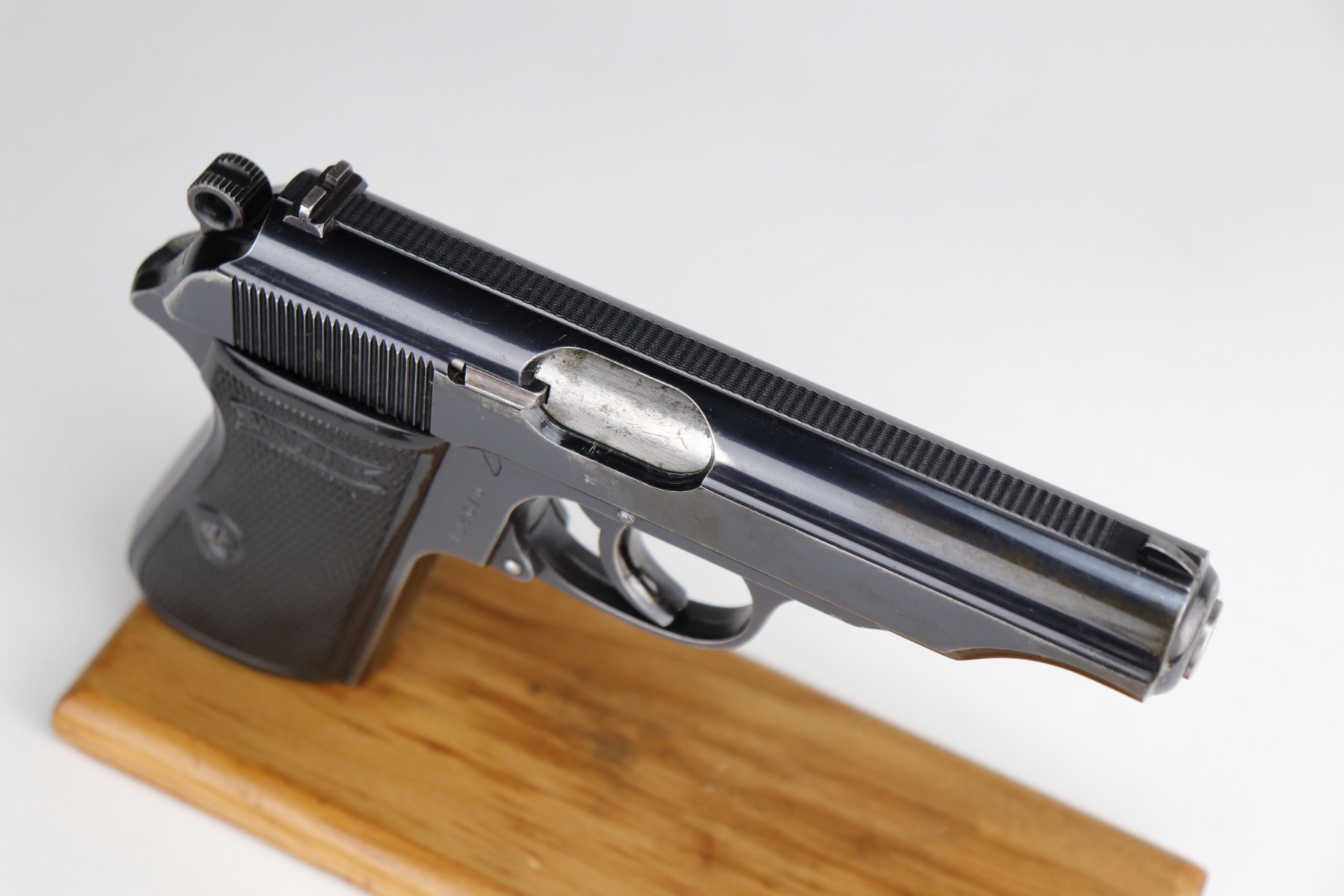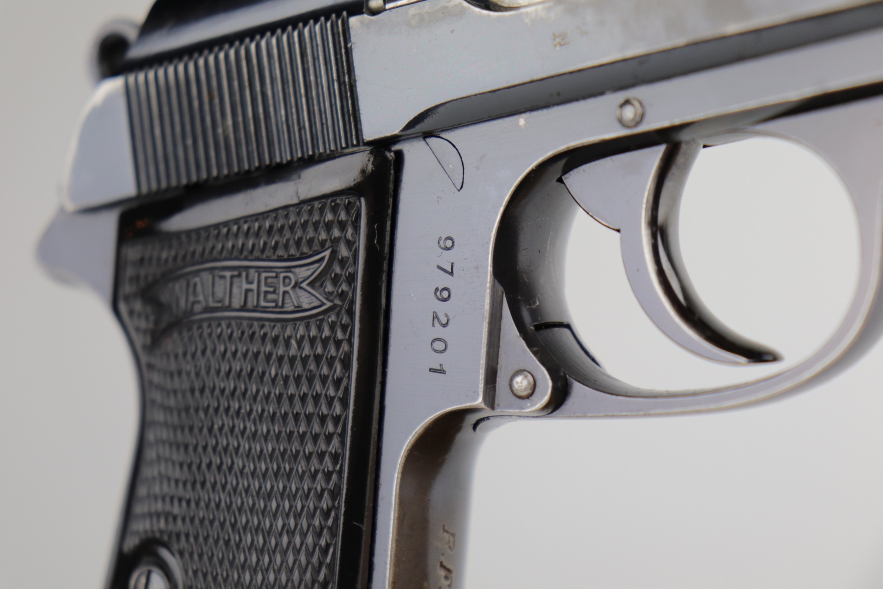 12/4/20 – This is a very nice example of a Walther PP that was issued to the Finance Bureau of the Third Reich in 1938. It is characterized by the “RFV” marking on the front strap. It is all matching and has retained roughly 85% of its bluing. There is minor high edge wear and spotty wear along both sides of the slide. There is thinning and spotty patina on the straps. One area of wear at the base of the back strap. It comes with excellent Walther grips and a Walther banner-only magazine. The bore is mint.