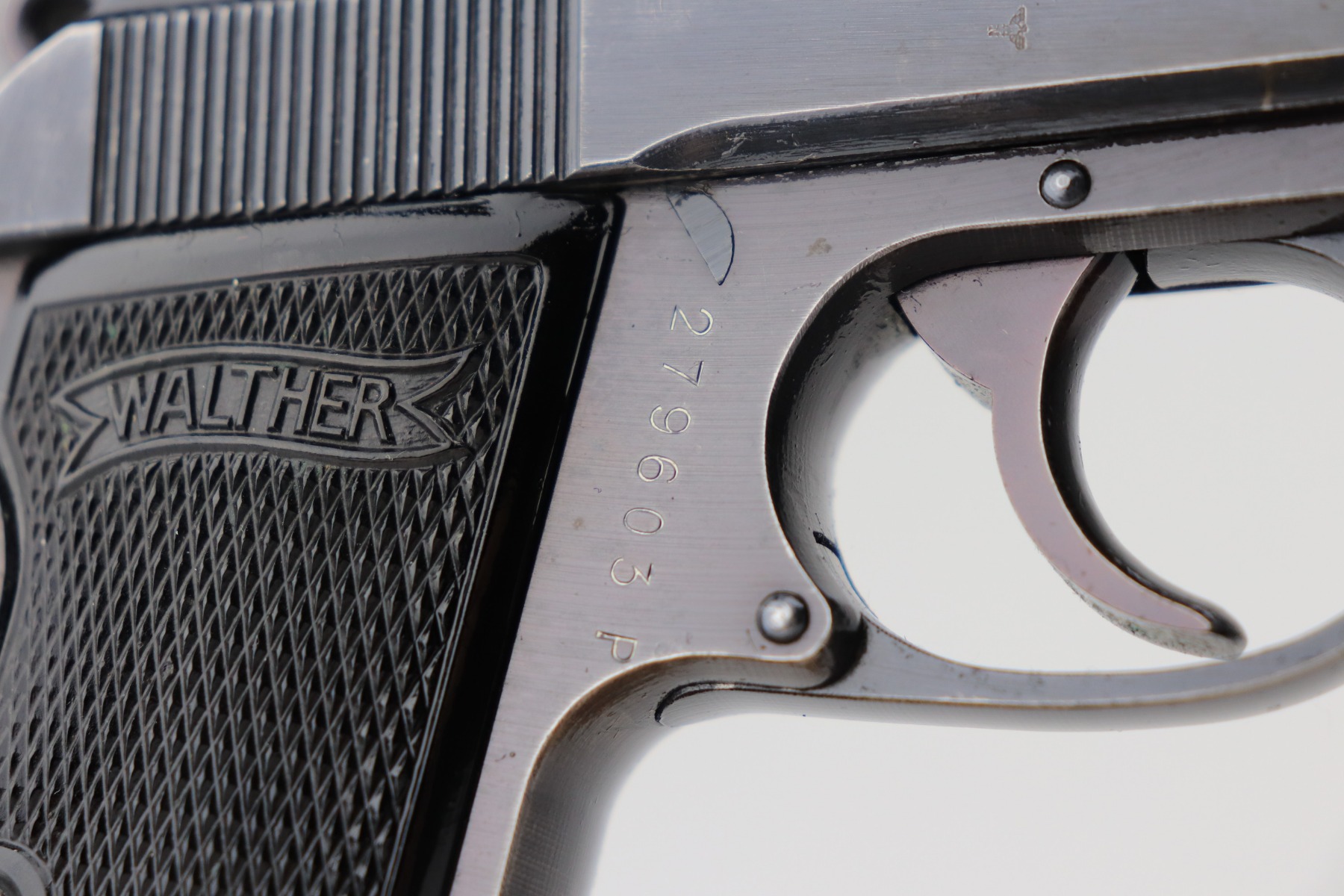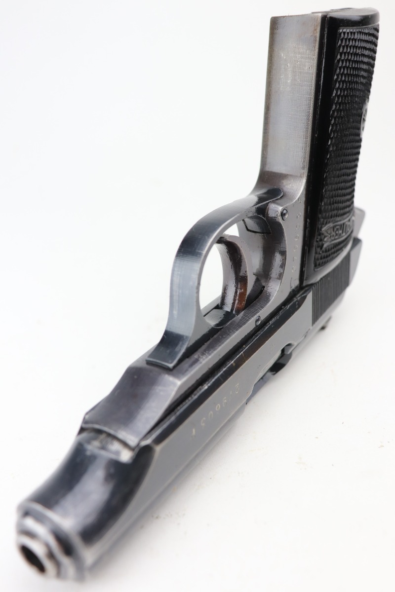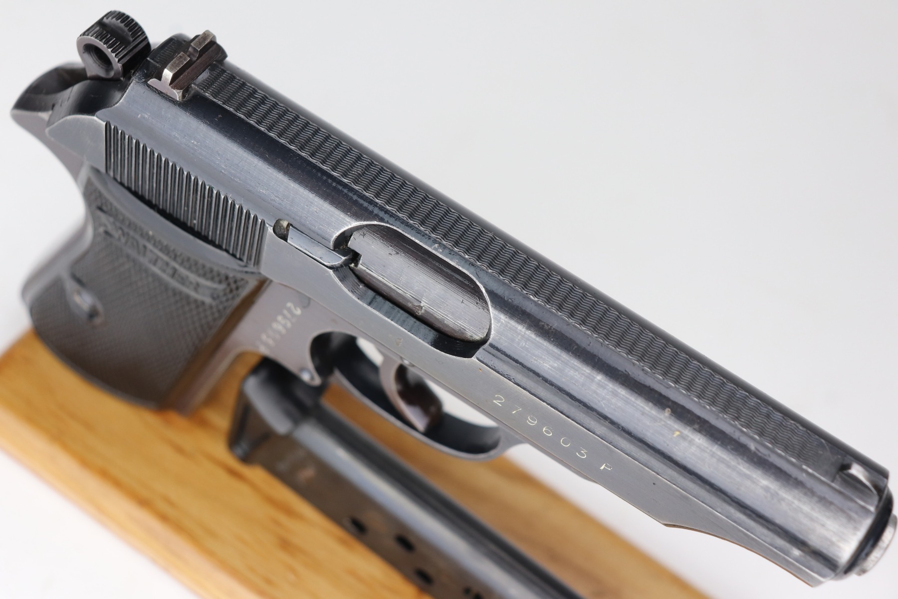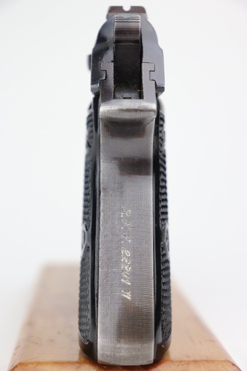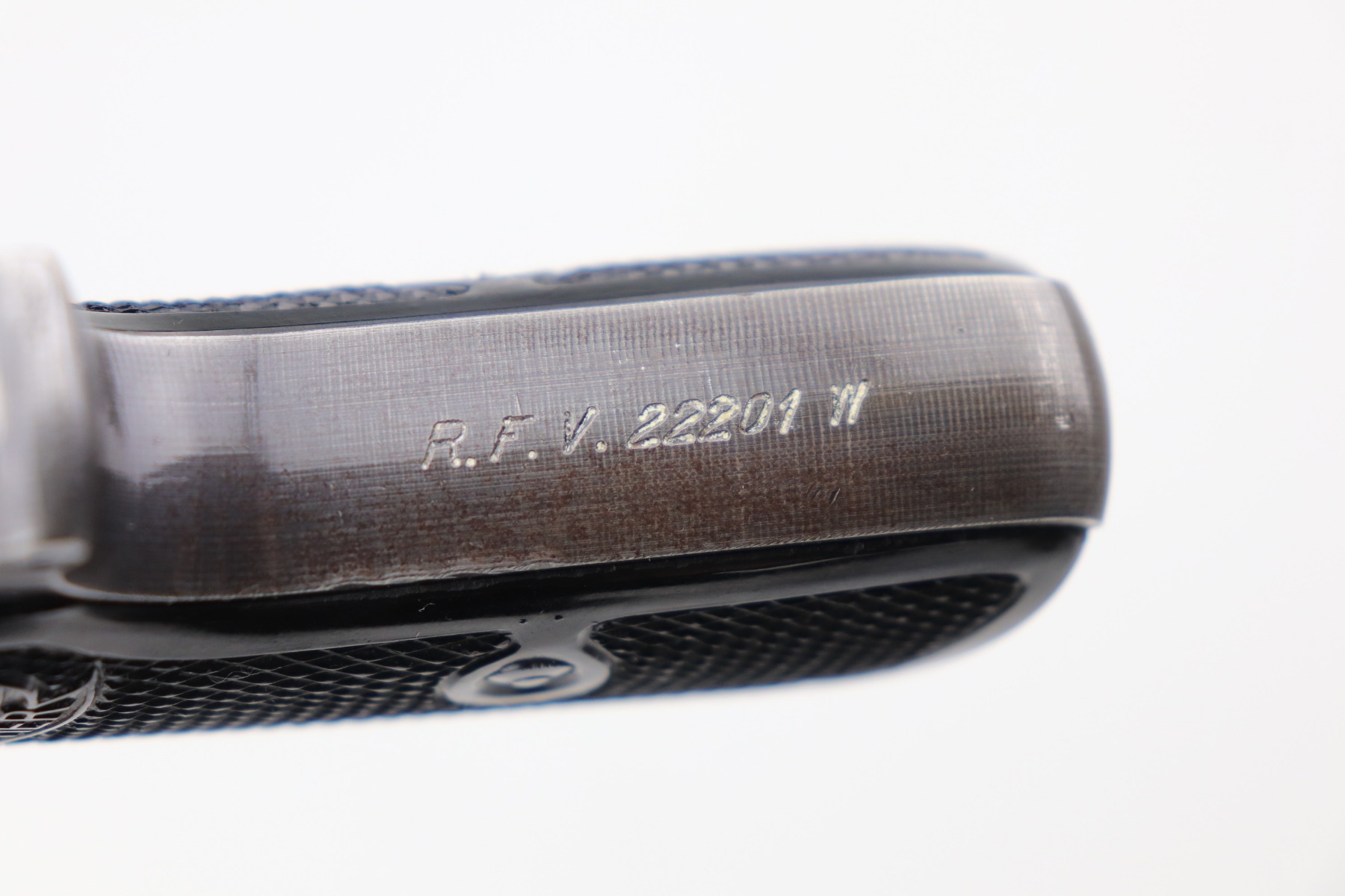 2/24/21 – This is a very nice example of an “RFV”-marked Walther PP manufactured in 1942. The “RFV” indicates that this gun was issued to the Reichs Finance Bureau. The gun is all matching, has an “RFV” marking on the back strap, and “Eagle N” firing proofs. It has retained about 90% of its original finish. Generally, there is wear around the muzzle and high edges of the slide. Minor thinning on the straps. Comes with excellent grips and a wartime finger extension magazine. The bore is very nice – shiny with great rifling.
