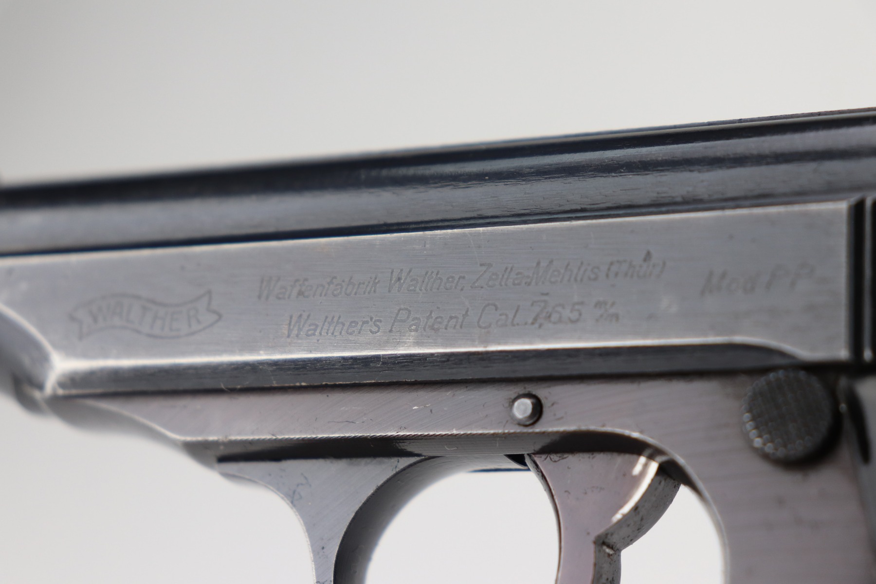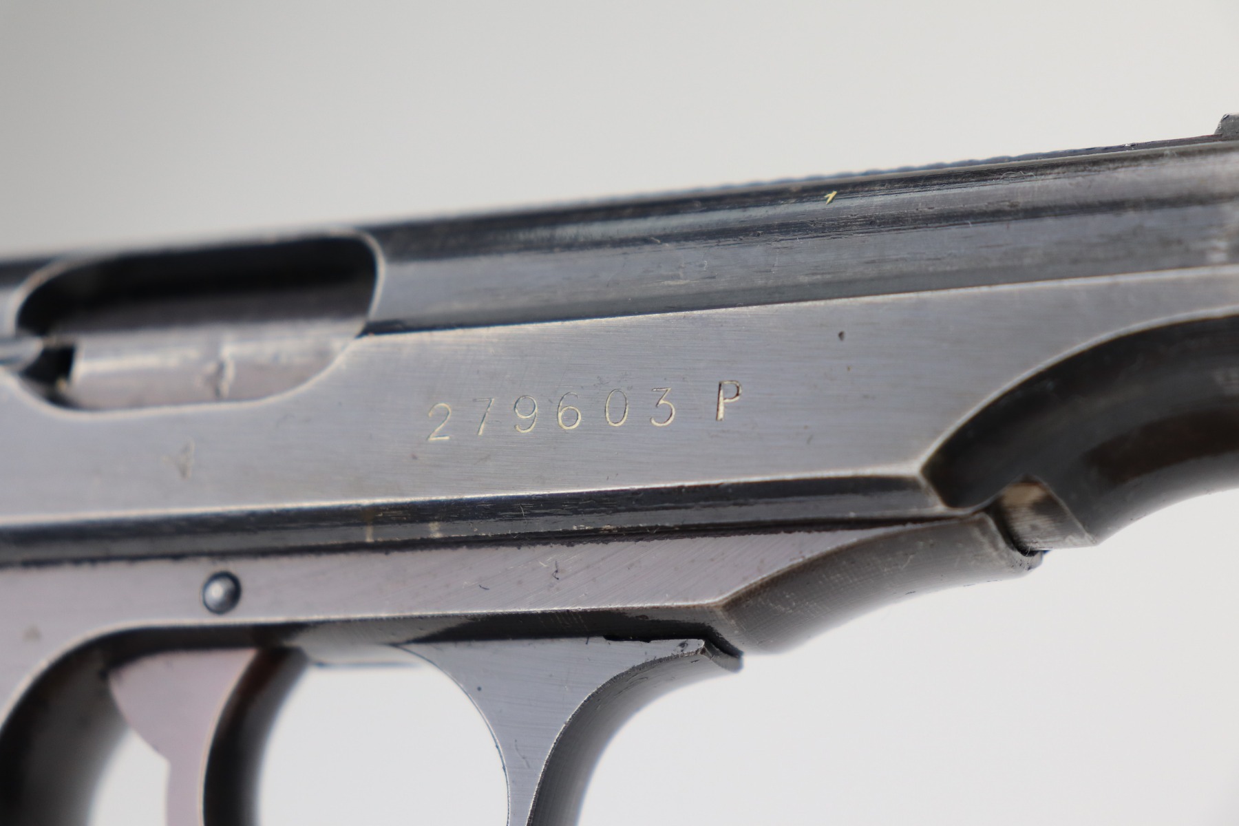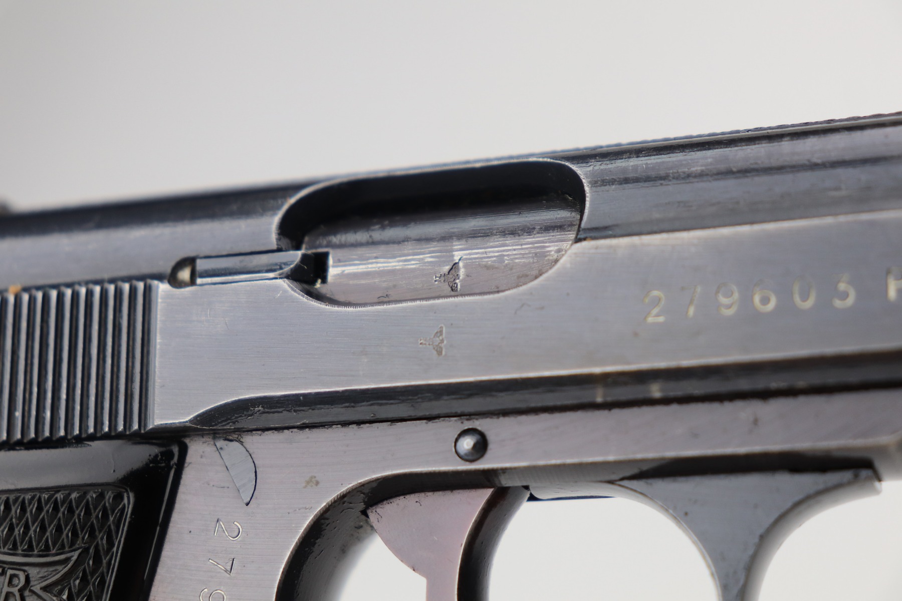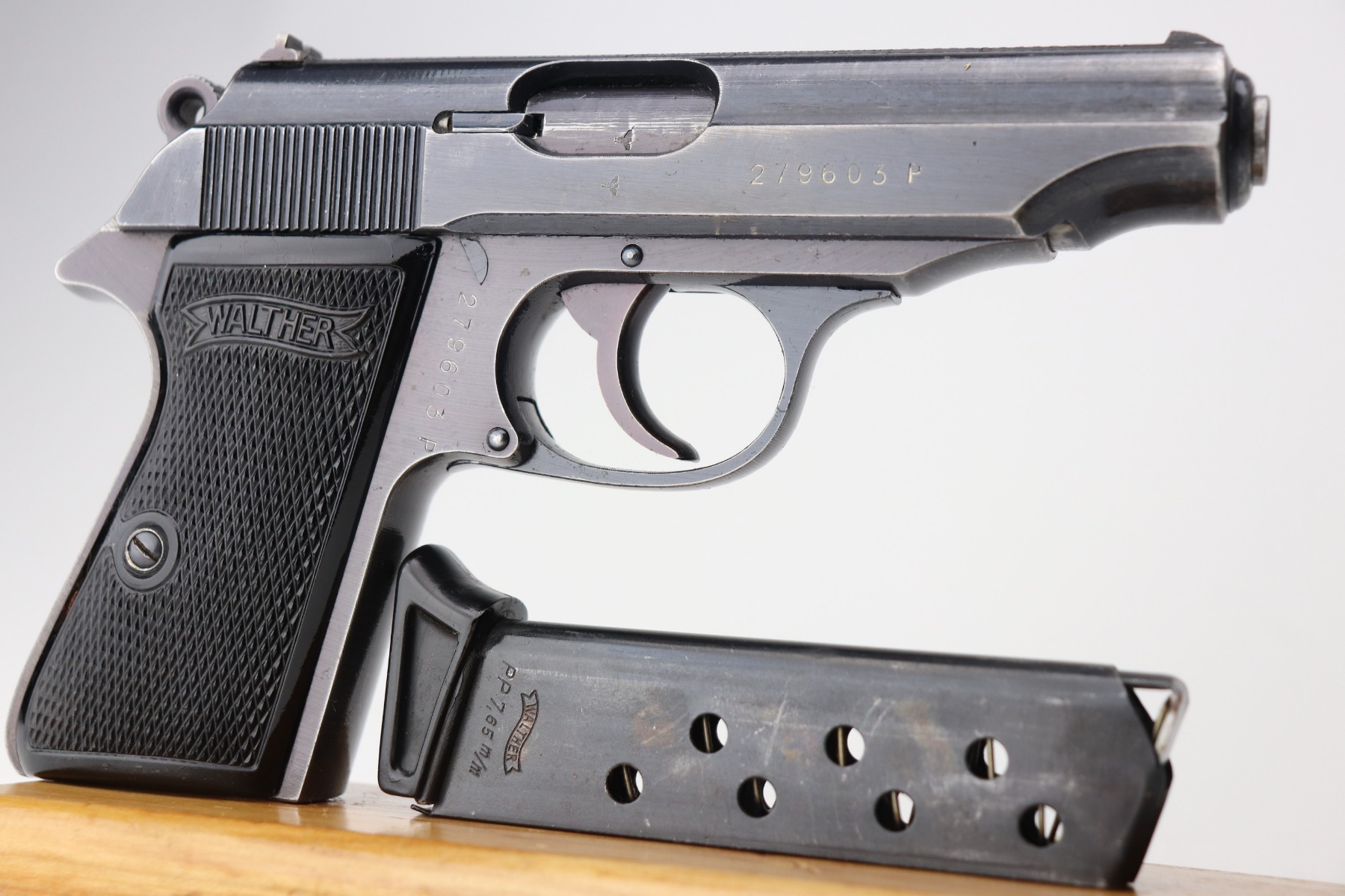 2/24/21 – This is a very nice example of an “RFV”-marked Walther PP manufactured in 1942. The “RFV” indicates that this gun was issued to the Reichs Finance Bureau. The gun is all matching, has an “RFV” marking on the back strap, and “Eagle N” firing proofs. It has retained about 90% of its original finish. Generally, there is wear around the muzzle and high edges of the slide. Minor thinning on the straps. Comes with excellent grips and a wartime finger extension magazine. The bore is very nice – shiny with great rifling.