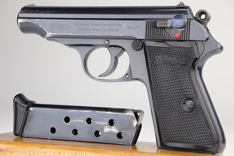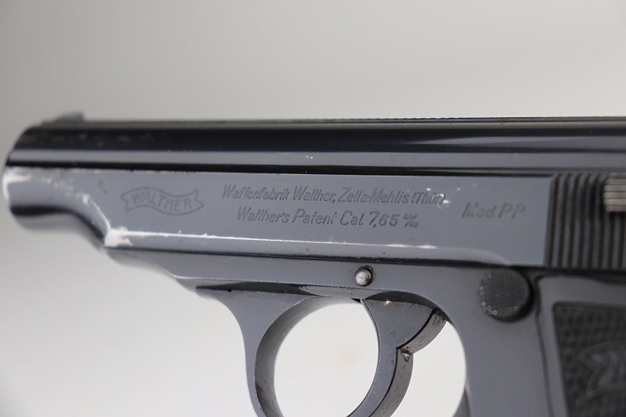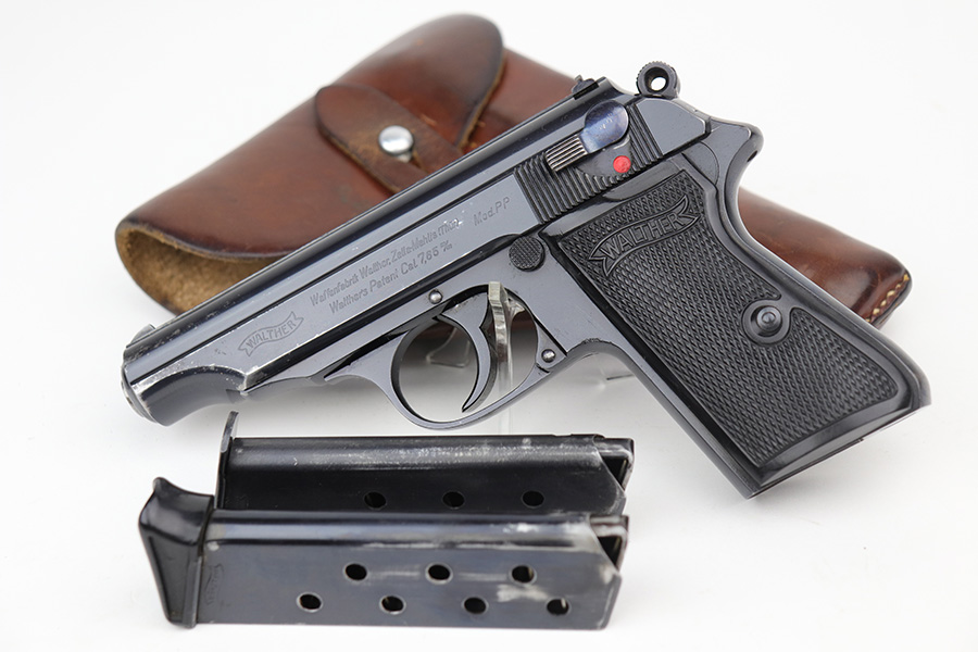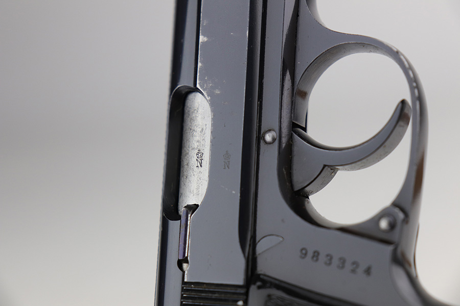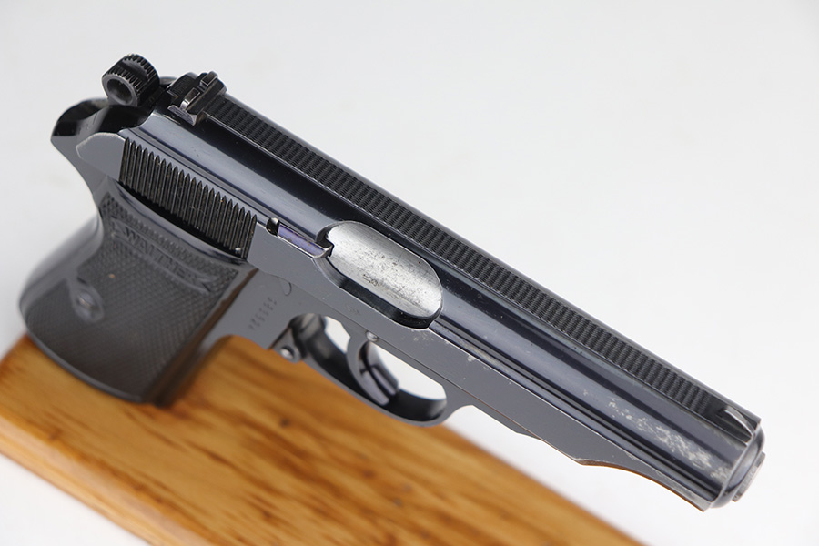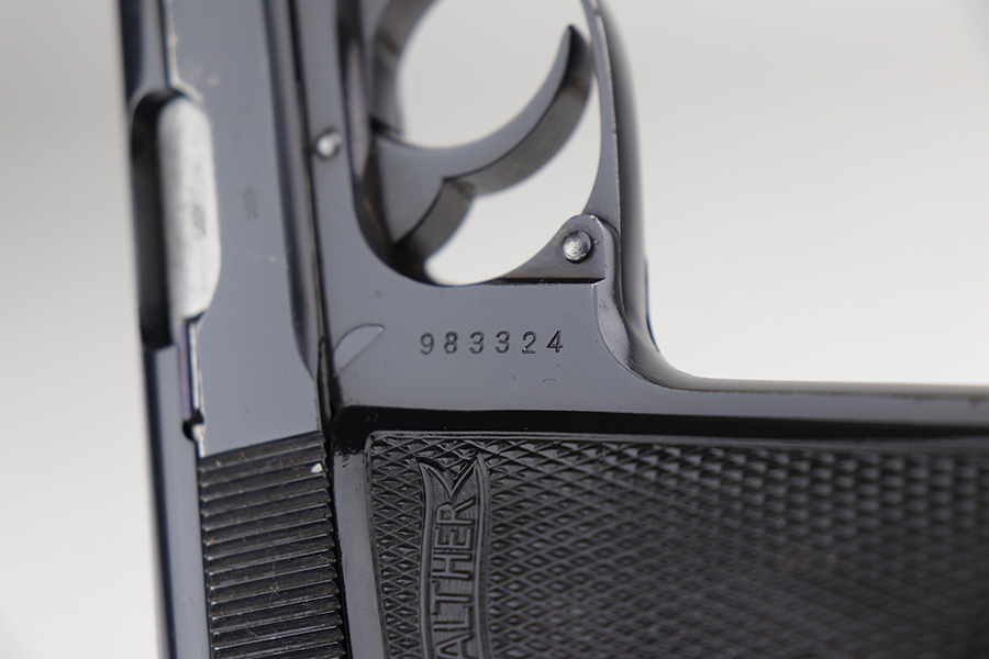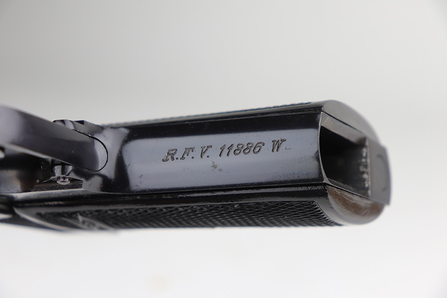 10/15/21 – This is a very nice example of a Walther PP rig manufactured in early 1938. This one has an “RFV” marking on the front strap, indicating it was issued to the Finance Bureau of the Third Reich. It is all matching and has the proper “Crown N” proofs. It comes with a nice unmarked holster, one finger extension magazine, and one flat-bottom magazine. It has retained about 92-93% of its high polish finish. Most of the wear is on either side of the slide, around the muzzle and edges. Also a little more on the bottom of the back strap. Excellent grips with no cracks. Minty bore.