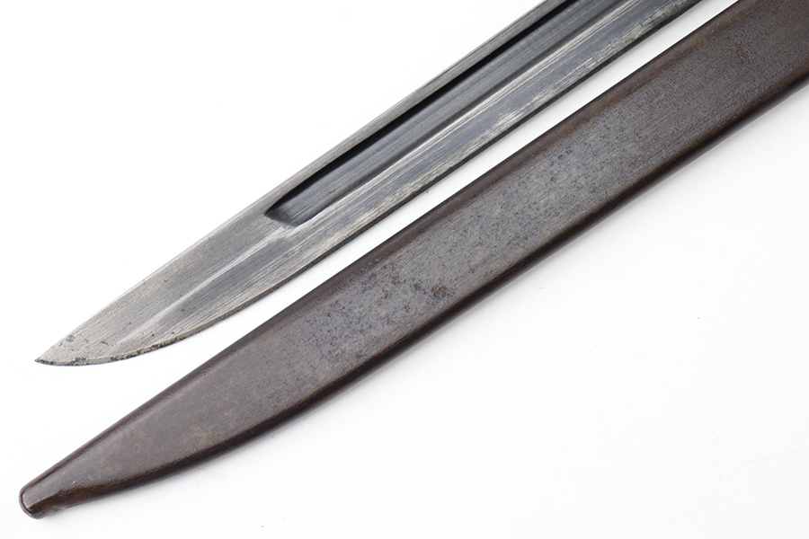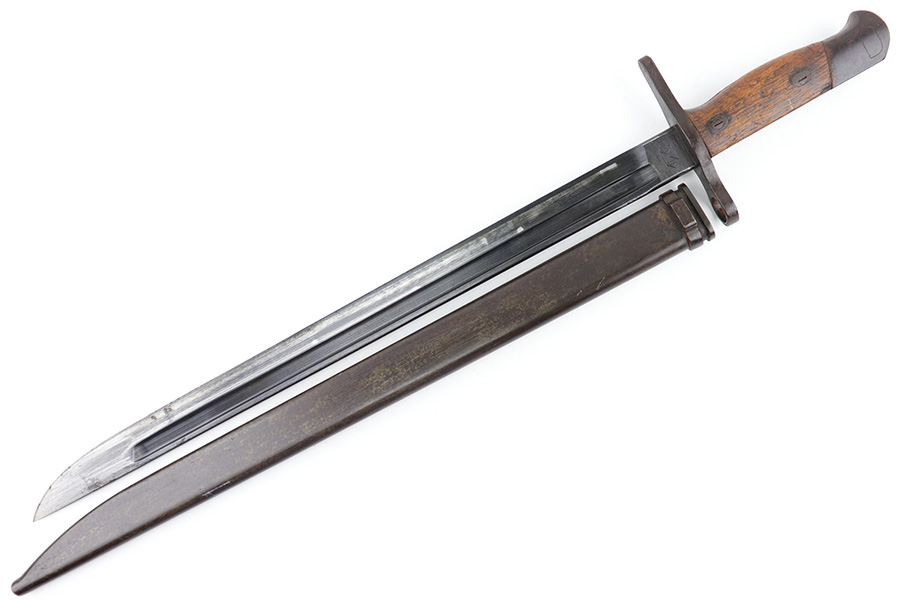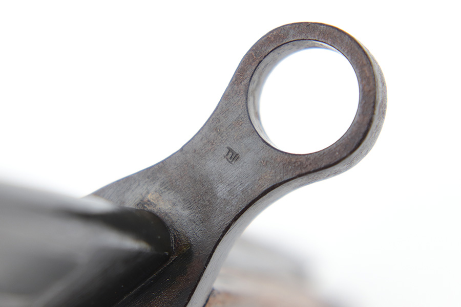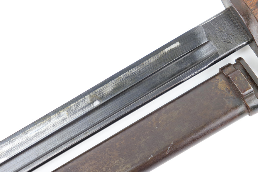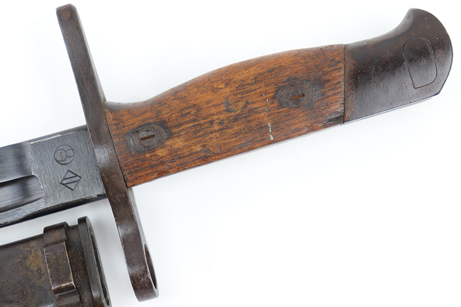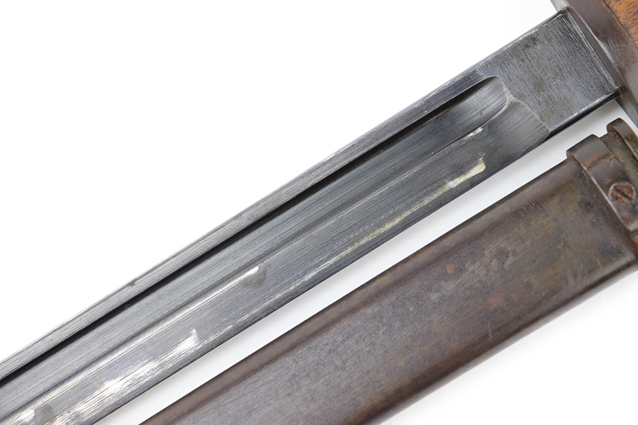 7/10/23 – This is an original WW2 production Japanese T30 bayonet. The bayonet is made by Riken Kourzai Arsenal (under Nagoya supervision). Cited in Labar’s book as a Variation D, LB 126. The bayonet features an excellent blued, fullered blade that has some mild finish loss and surface patina mostly located near the tip of the blade. The straight cross guard has dark patina mixed within the finish and has no rust or pitting. The bird’s head pommel has some spotty surface rust and light patina throughout. The wood grips are contoured with 2 screws and washers. There’s one small chip in the left side of the grip, near the cross guard. Comes with a metal cone-tipped scabbard. A great wartime production example.