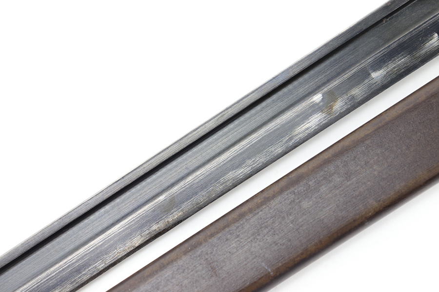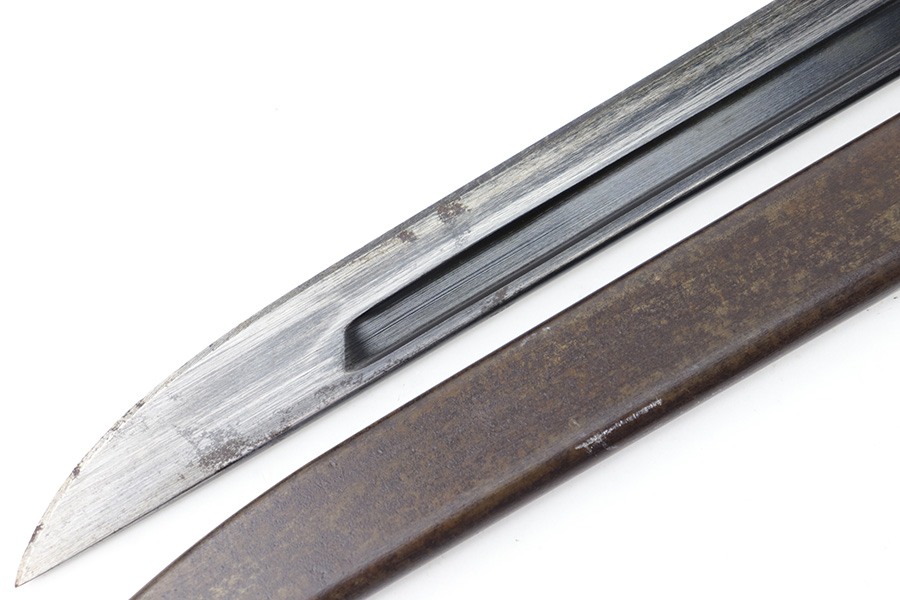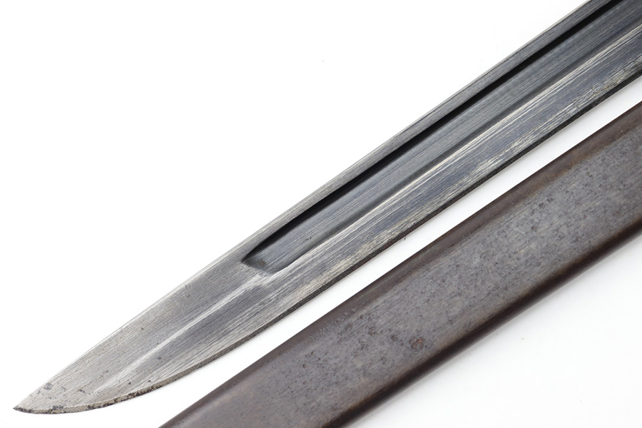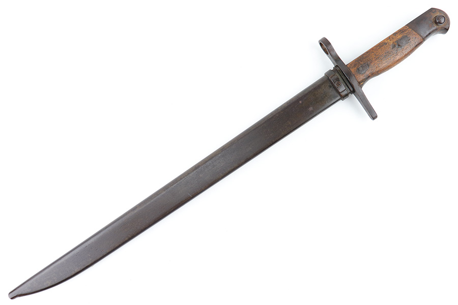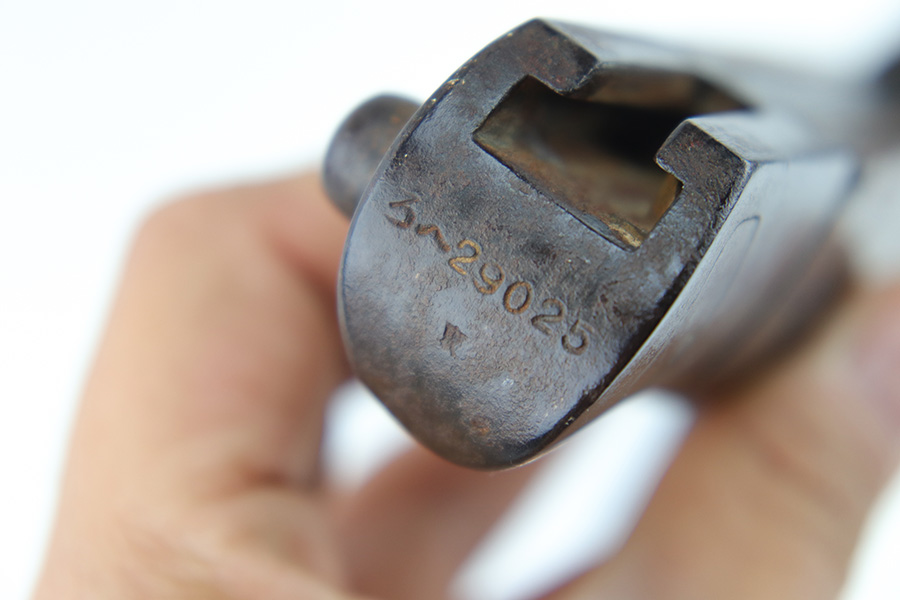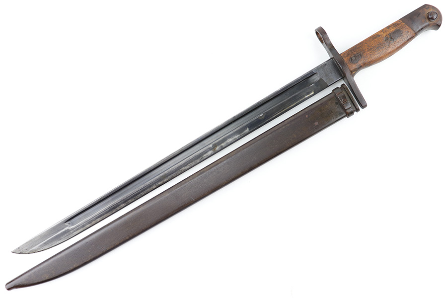 7/10/23 – This is an original WW2 production Japanese T30 bayonet. The bayonet is made by Riken Kourzai Arsenal (under Nagoya supervision). Cited in Labar’s book as a Variation D, LB 126. The bayonet features an excellent blued, fullered blade that has some mild finish loss and surface patina mostly located near the tip of the blade. The straight cross guard has dark patina mixed within the finish and has no rust or pitting. The bird’s head pommel has some spotty surface rust and light patina throughout. The wood grips are contoured with 2 screws and washers. There’s one small chip in the left side of the grip, near the cross guard. Comes with a metal cone-tipped scabbard. A great wartime production example.