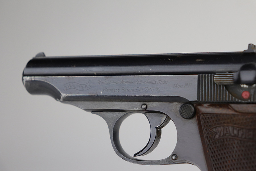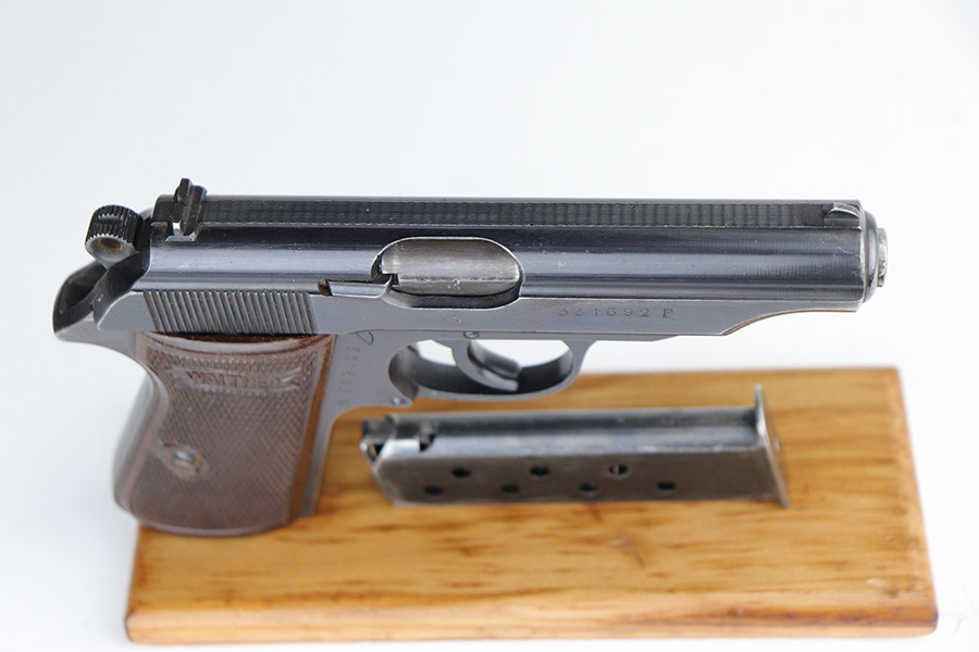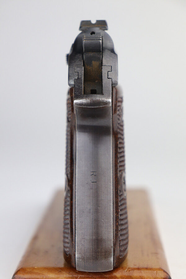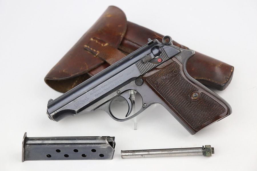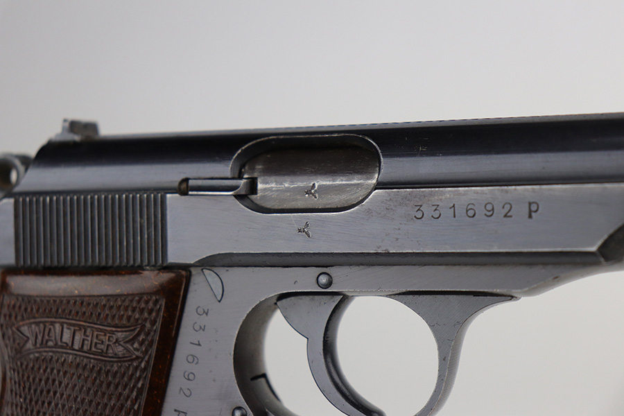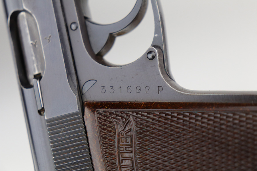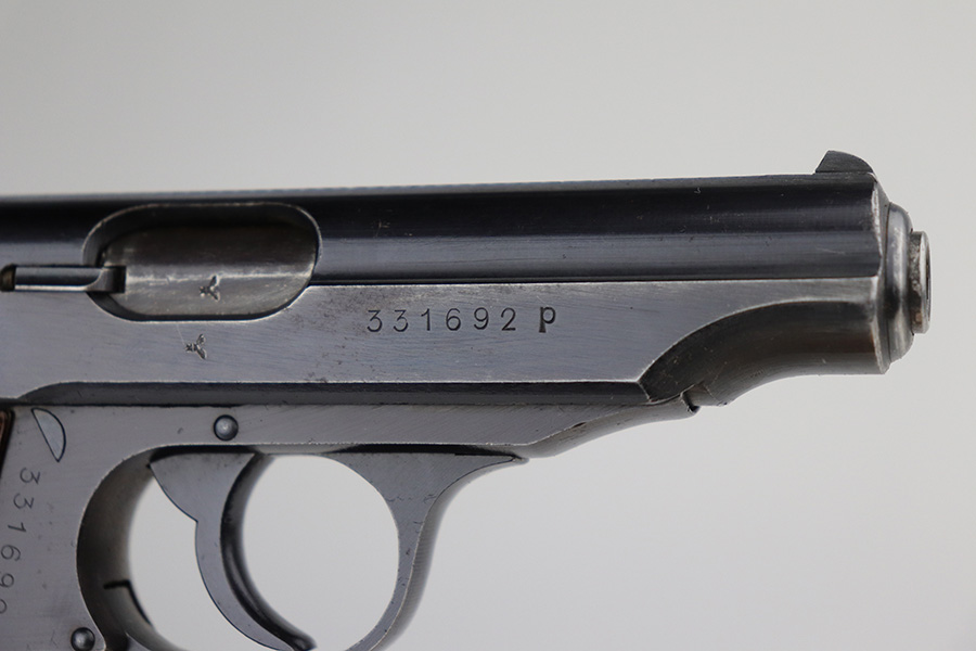 9/1/21 – This is an excellent example of a later-war Walther PP issued to the Third Reich Justice System in 1944. It is all matching, has the proper “Eagle N” proofs, and the proper “RJ” Reichs Justice marking on the back strap. It comes with a nice un-marked police-style holster, a proper magazine, rare reddish Walther grips, and a Walther-marked .22 caliber conversion barrel. The gun has retained about 94-95% of its wartime finish. There is minor wear on the high edges of the slide and around the muzzle. Some handling marks on the left side and top of the slide. Light patina on the straps. Mint bore.