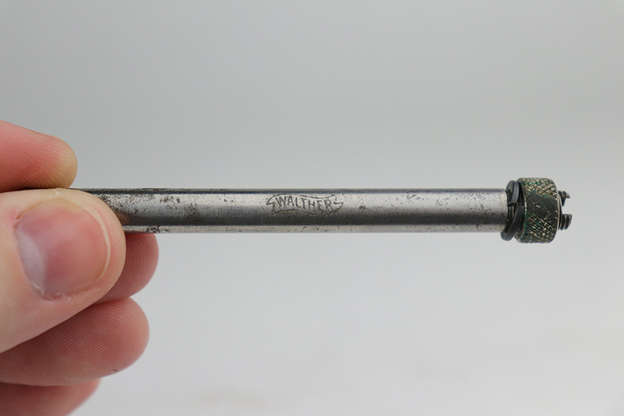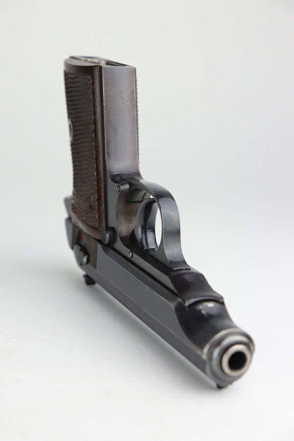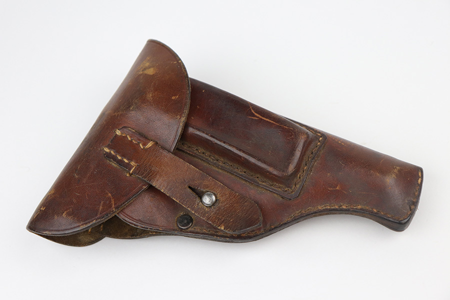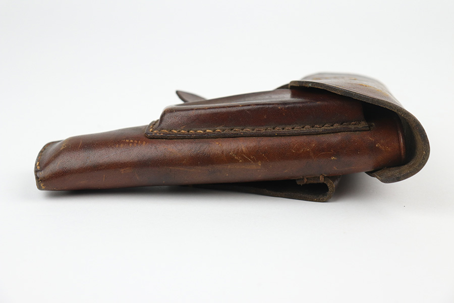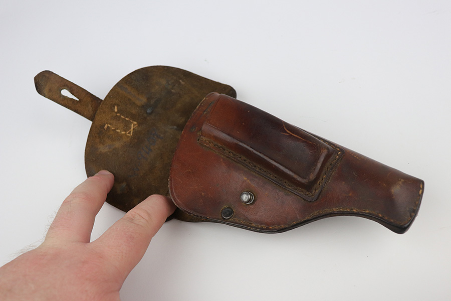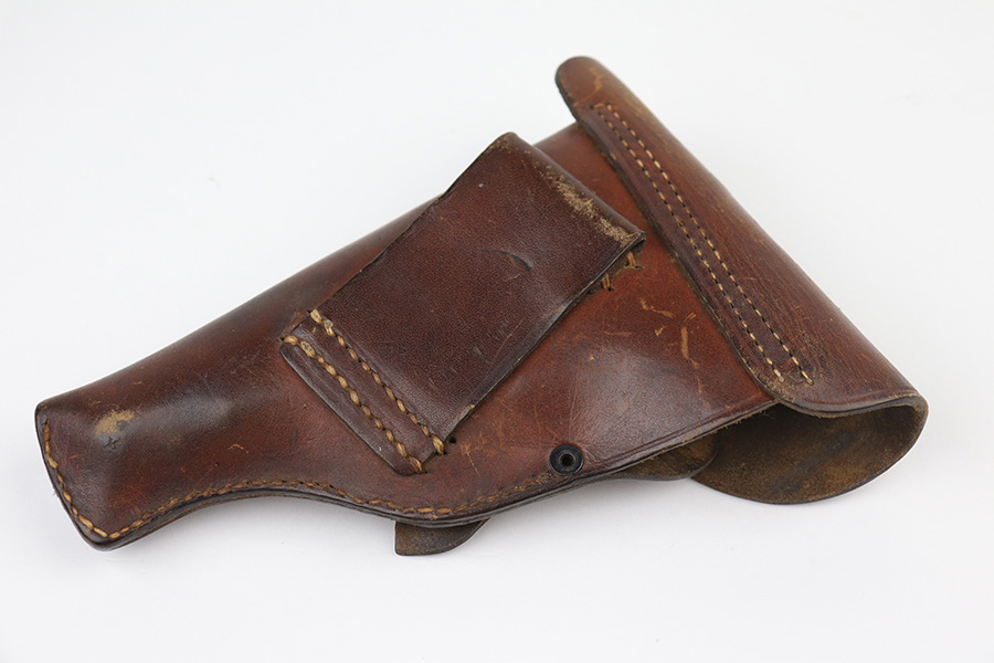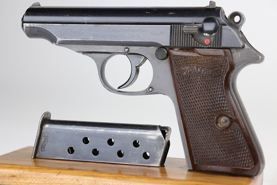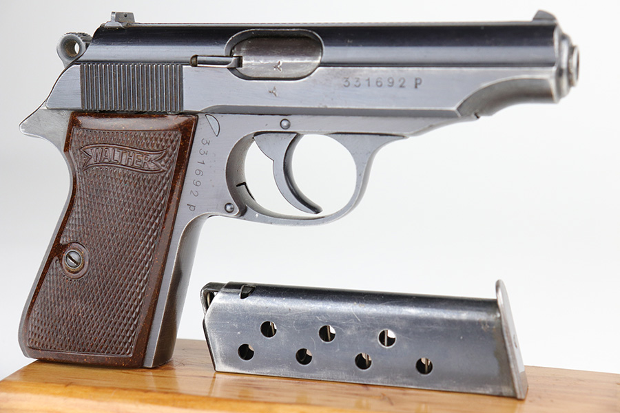 9/1/21 – This is an excellent example of a later-war Walther PP issued to the Third Reich Justice System in 1944. It is all matching, has the proper “Eagle N” proofs, and the proper “RJ” Reichs Justice marking on the back strap. It comes with a nice un-marked police-style holster, a proper magazine, rare reddish Walther grips, and a Walther-marked .22 caliber conversion barrel. The gun has retained about 94-95% of its wartime finish. There is minor wear on the high edges of the slide and around the muzzle. Some handling marks on the left side and top of the slide. Light patina on the straps. Mint bore.