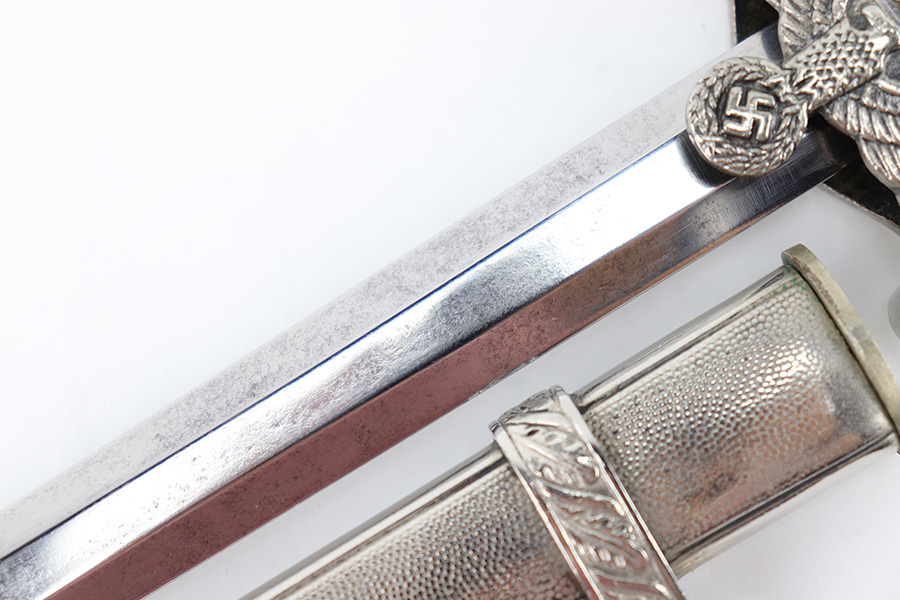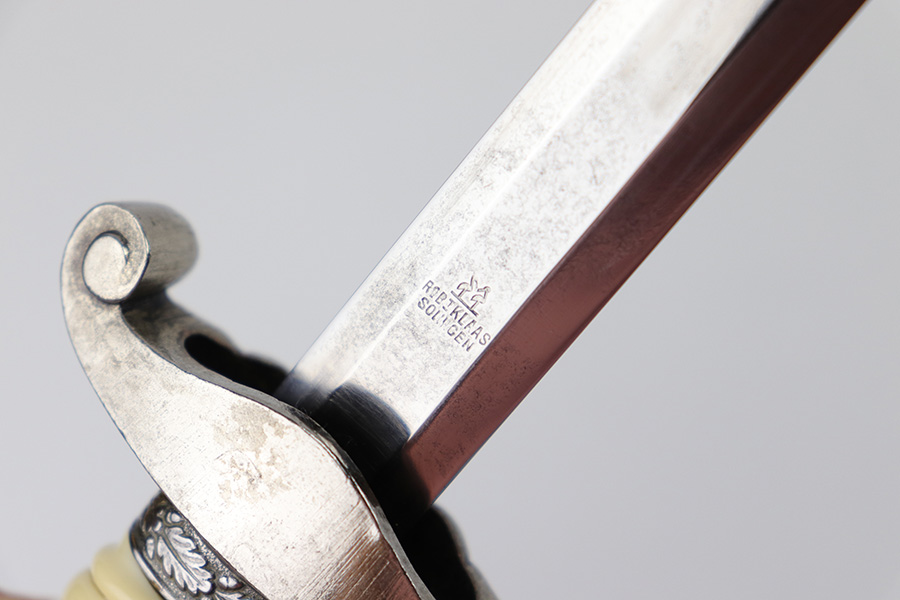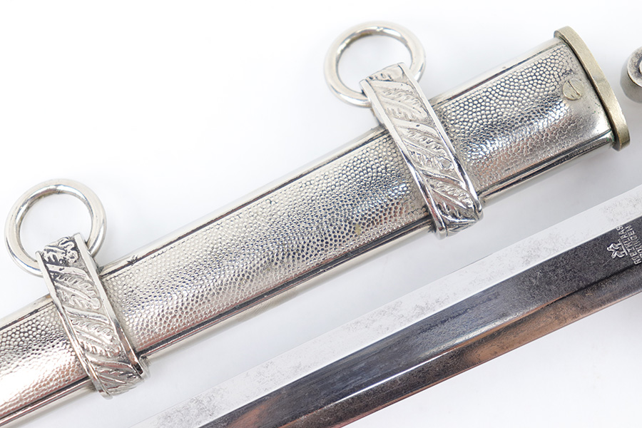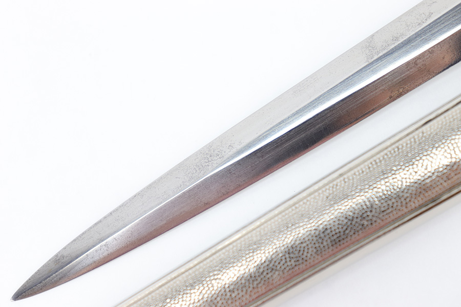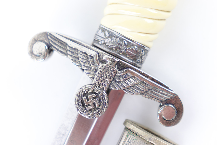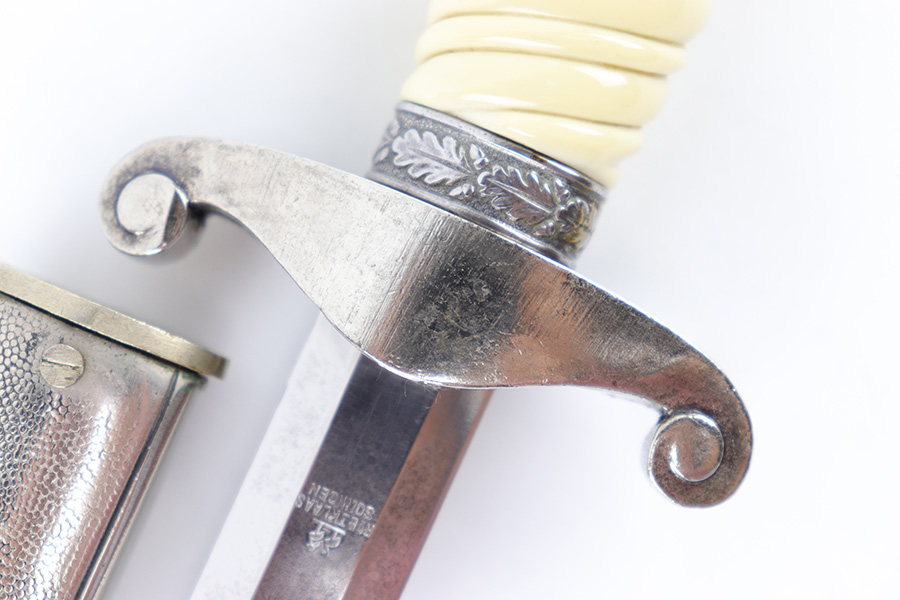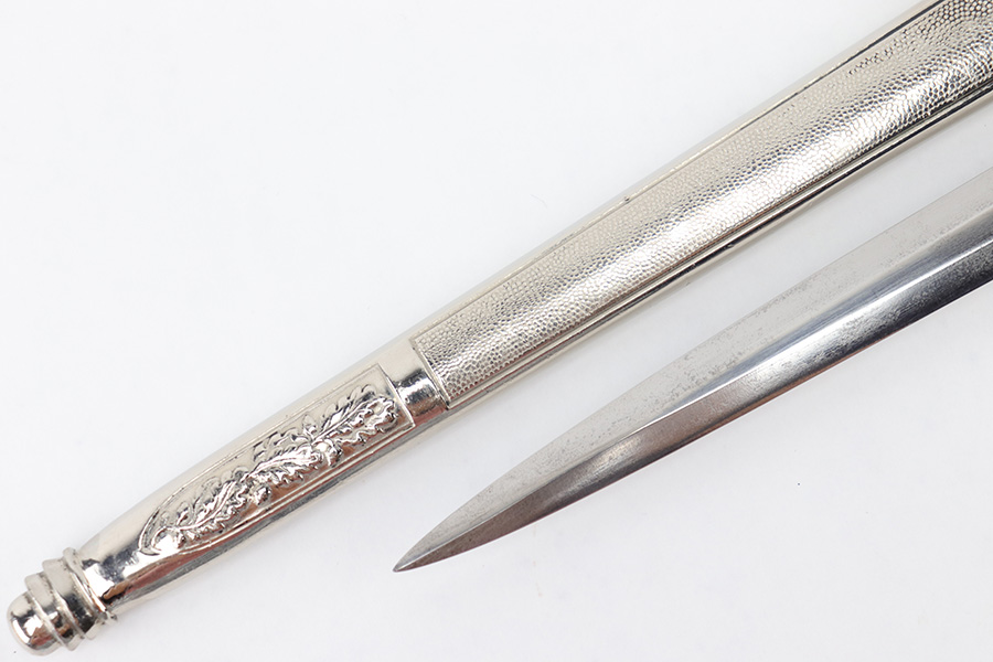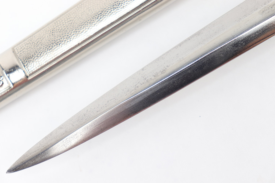 6/29/23 – This is an original German Army Dagger by Robert Klaas. The dagger comes with an original scabbard, but the scabbard has been chromed post-factory. The rest of the dagger is original, however and in very good overall condition. The blade shows mild speckling patina throughout, with traces of the original cross-graining still visible. The blade is maker stamped by Robert Klaas as shown. The hand guard has typical surface patina throughout, as does the pommel, with only traces of the original finish. The beige colored handle is excellent with no cracks or chips.