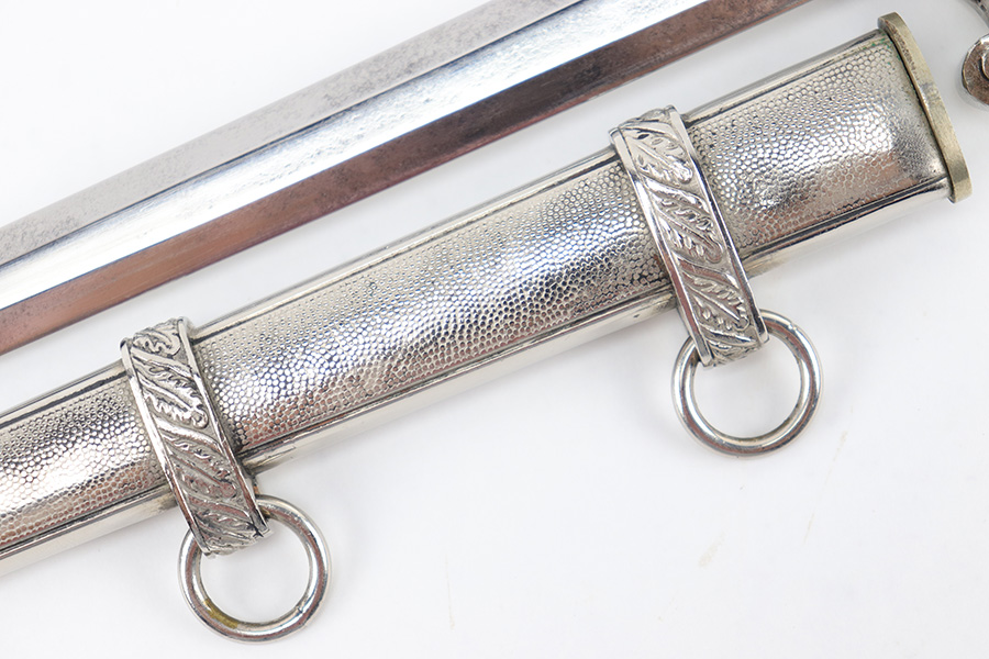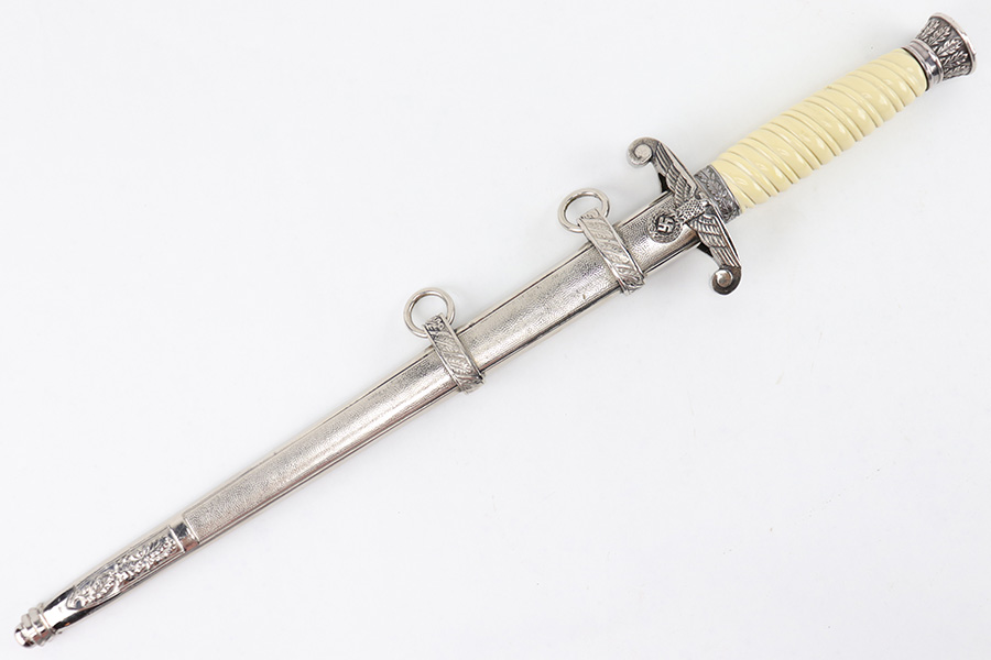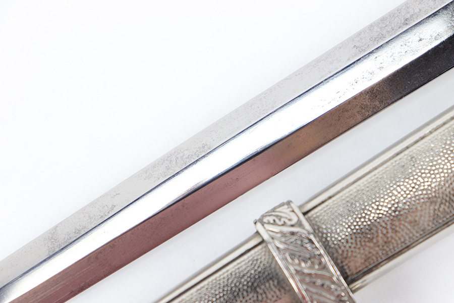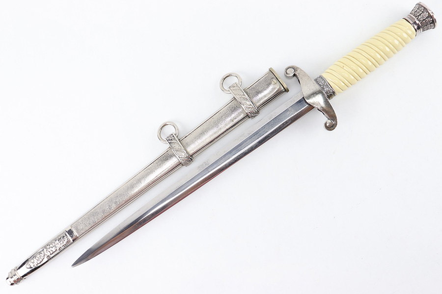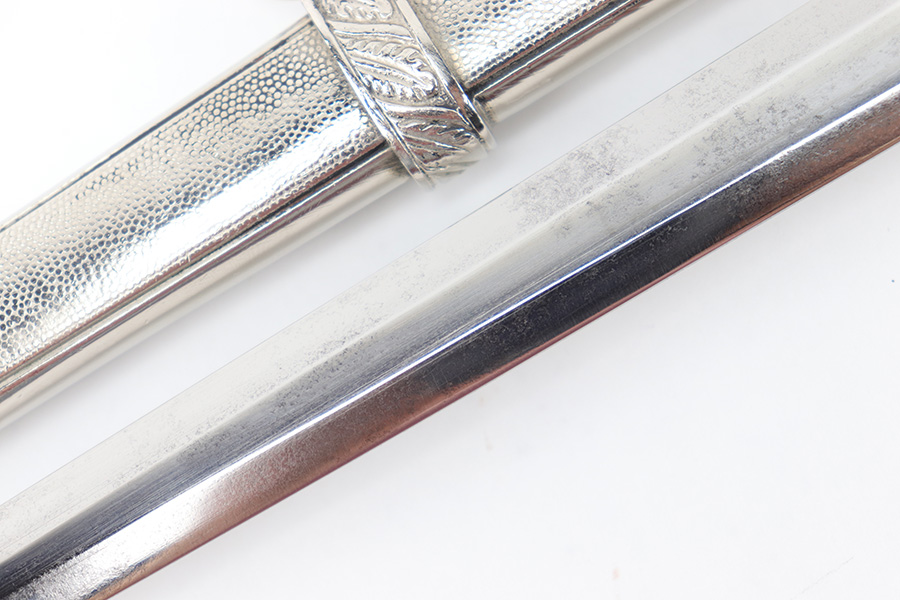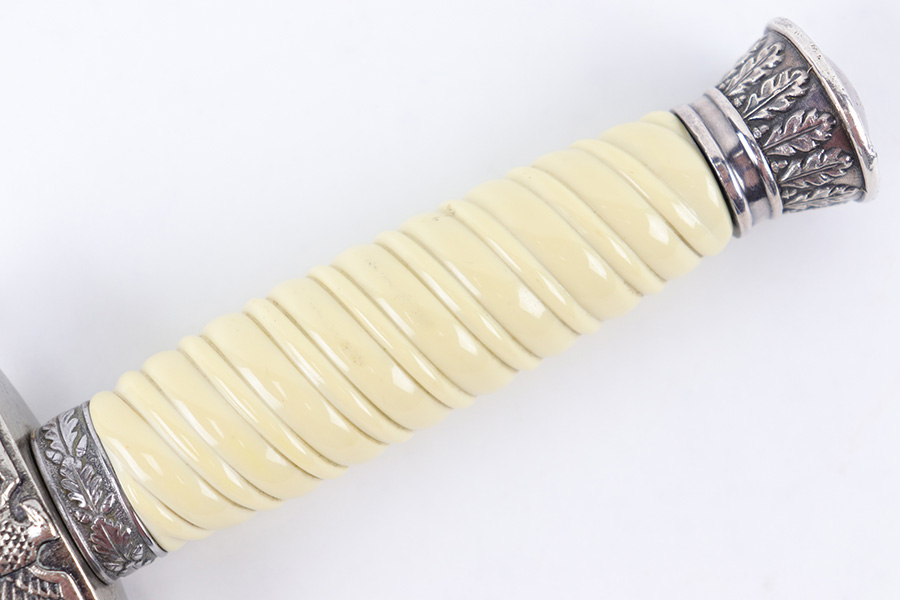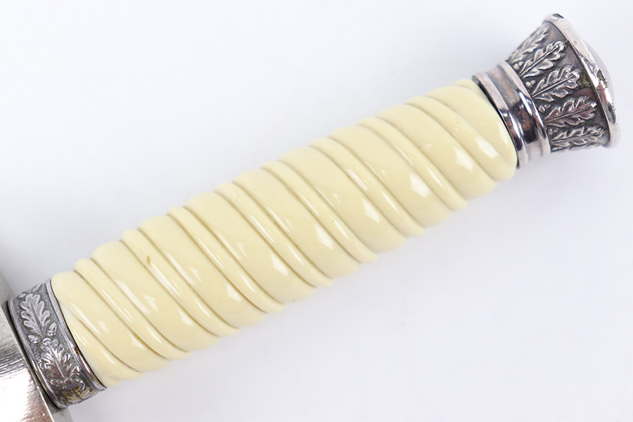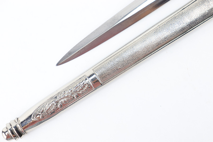 6/29/23 – This is an original German Army Dagger by Robert Klaas. The dagger comes with an original scabbard, but the scabbard has been chromed post-factory. The rest of the dagger is original, however and in very good overall condition. The blade shows mild speckling patina throughout, with traces of the original cross-graining still visible. The blade is maker stamped by Robert Klaas as shown. The hand guard has typical surface patina throughout, as does the pommel, with only traces of the original finish. The beige colored handle is excellent with no cracks or chips.