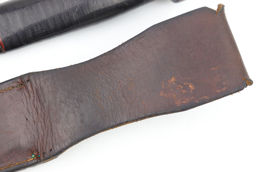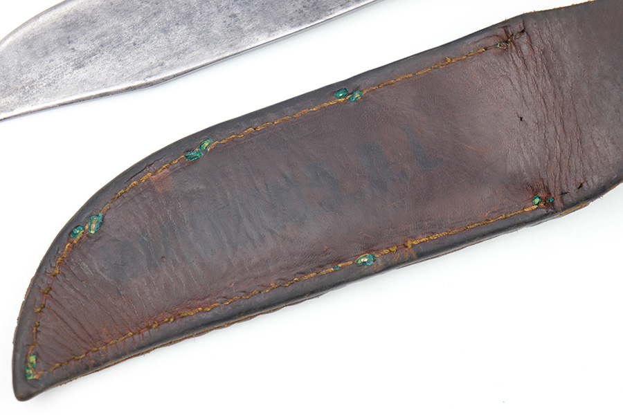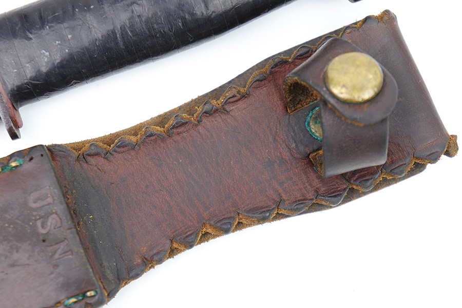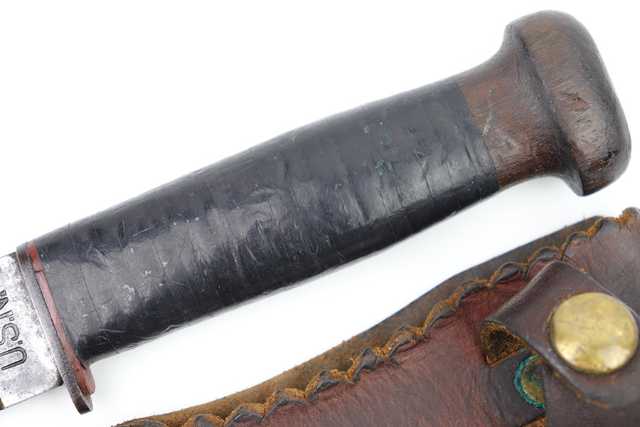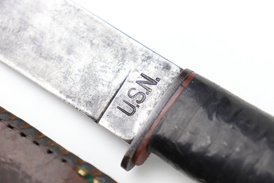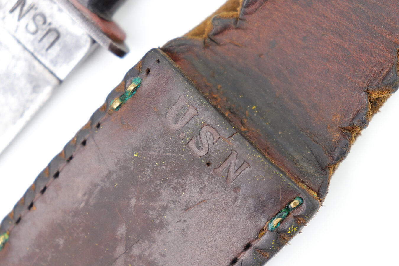3/13/23 – This is an original WW2 era production Robeson No. 20 US Navy issued combat / utility knife. Also known as a Mark 1 fighting knife. This example features a wood pommel and red spacer on the handle. The leather grip is tight and in great shape. The blade is USN designation stamped and maker stamped on the ricasso. The blade has dark surface patina throughout but this is mostly honest use and aging wear without excessive damage. The edge shows some light signs of sharpening but this is mild. Comes with a USN stamped leather scabbard.