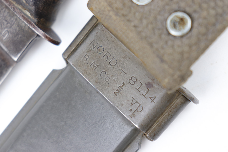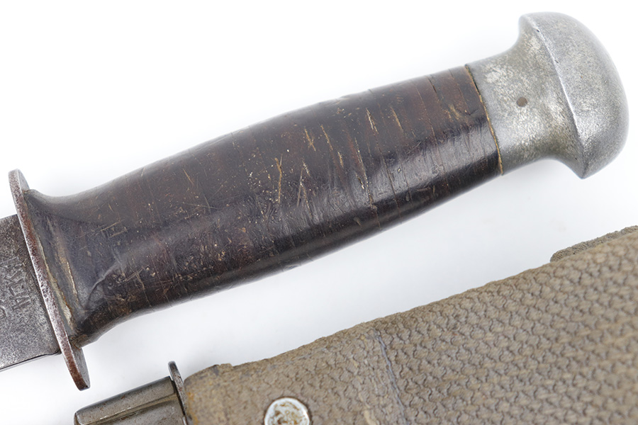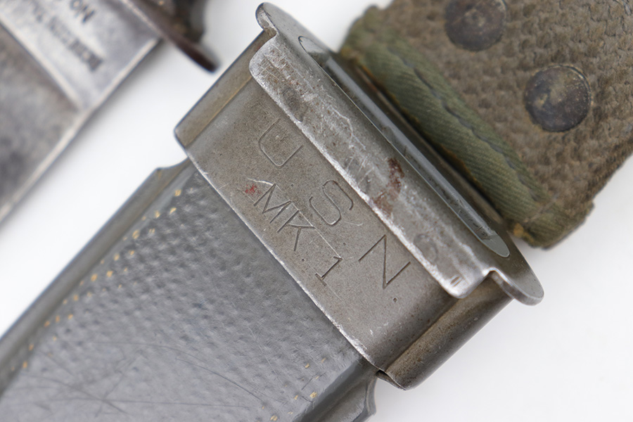 3/30/23 – This is an original WW2 era production Robeson No. 20 US Navy issued combat / utility knife. Also known as a Mk 1 fighting knife. This example features an aluminum pommel and comes with an original USN Mk 1 scabbard. The leather grip is tight and in great condition. The blade is USN Mk 1 designation stamped on one side, and maker stamped on the other. The blade has dark surface patina throughout. The edge shows some light signs of use and a few mild nicks and dings. Natural patina throughout but a good, honest example overall.