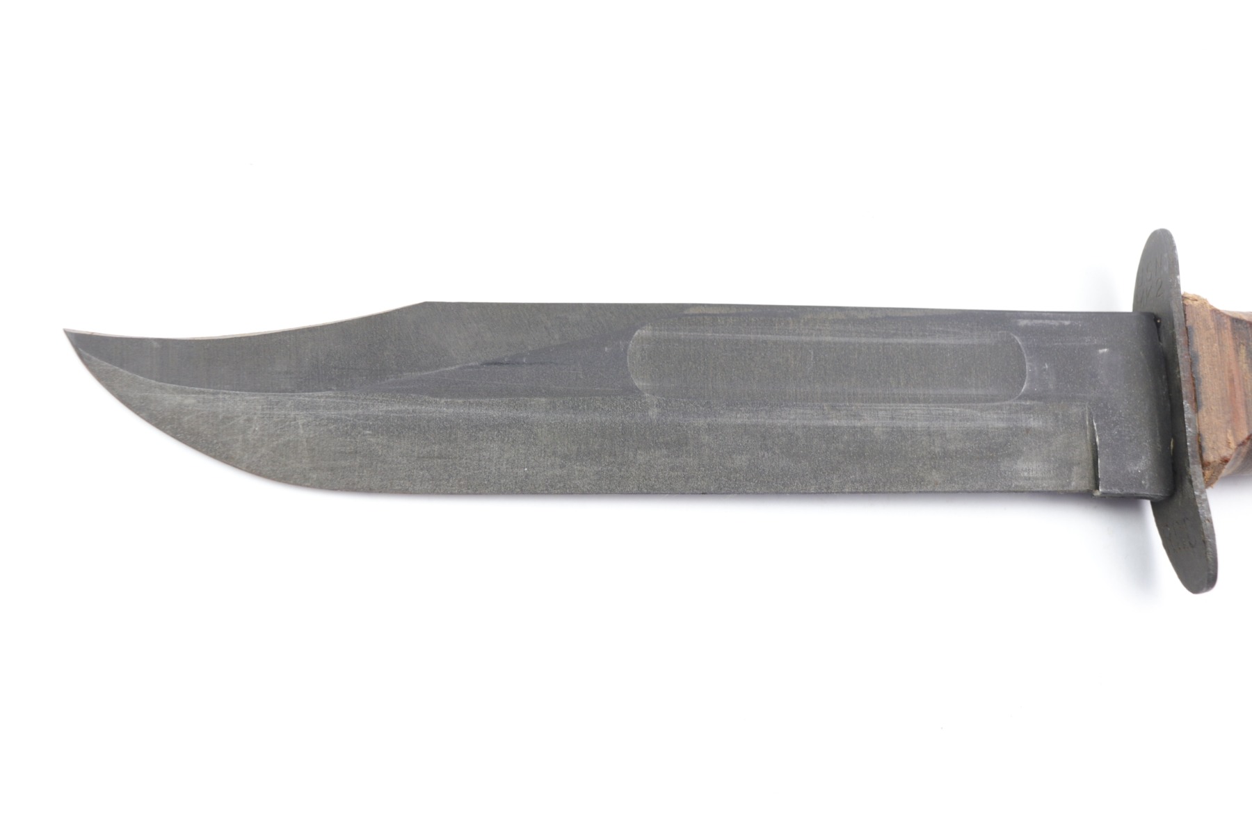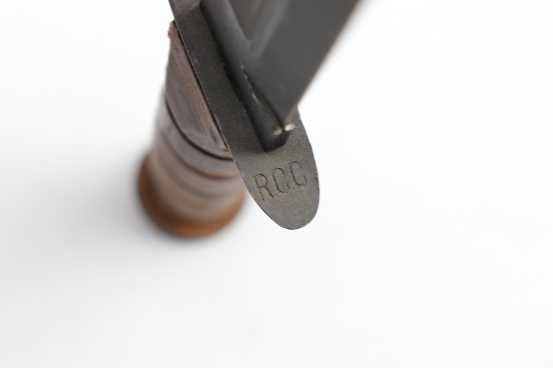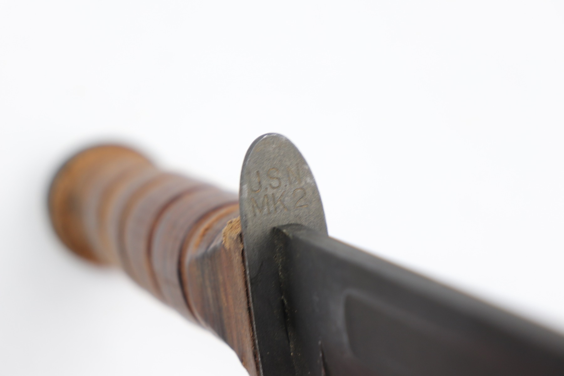 12/23/20 – This is an original WW2 era production Robeson USN Mk 2 knife. Comes with a scabbard that has the original wax paper still in tact over the upper metal. The blade is in minty condition as shown, as is the handle. The hand guard is maker stamped “R.C.C.” and “USN MK 2”. The blade has never been sharpened.