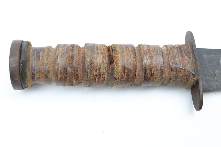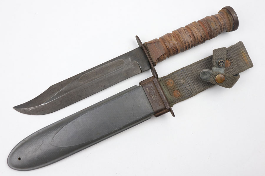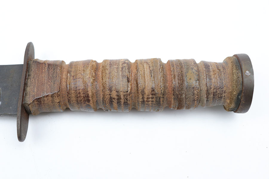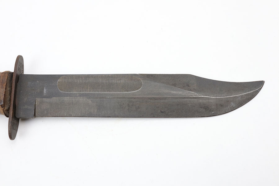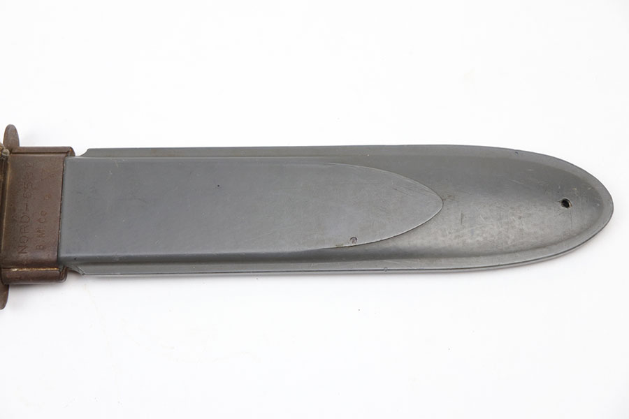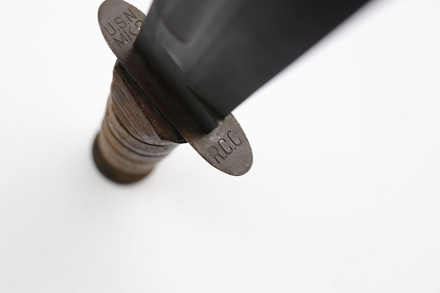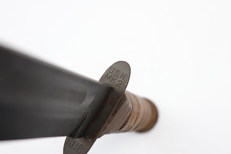 11/30/20 – This is an original USN MK II fighting knife made by Robeson. The hand guard is marked “USN MK 2” and “R.C.C.”. The blade has some light surface patina nd signs of aging but no serious rust or pitting. Also no signs of sharpening. The leather handle is in great condition overall with no loose sections. The pommel is unmarked and has a fair amount of patina. Comes with a USN scabbard with no major flaws and light surface wear on the metal fixtures. All original and authentic.