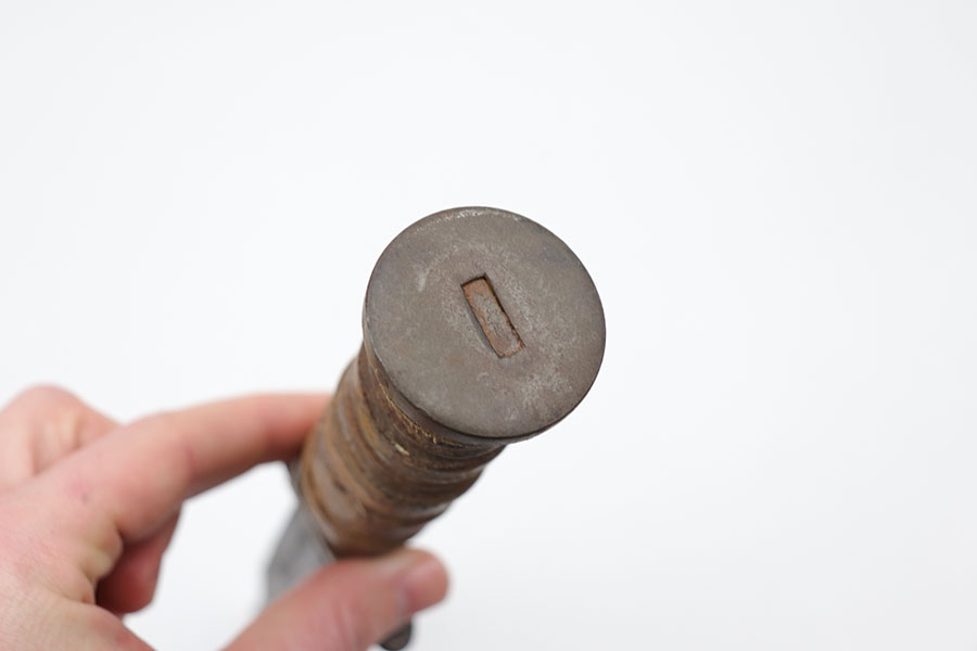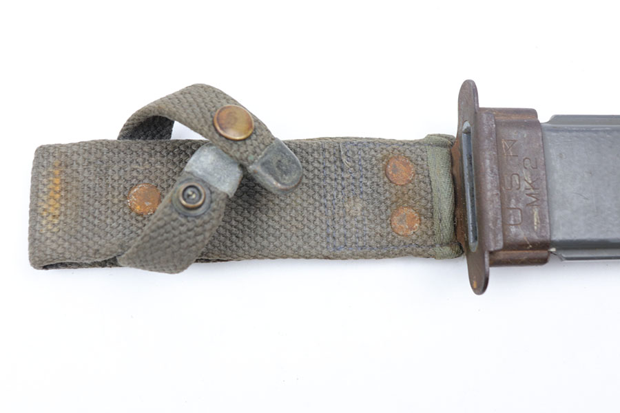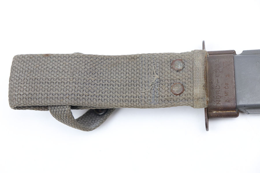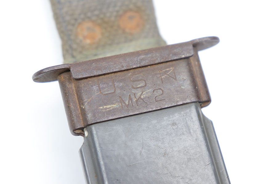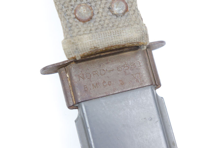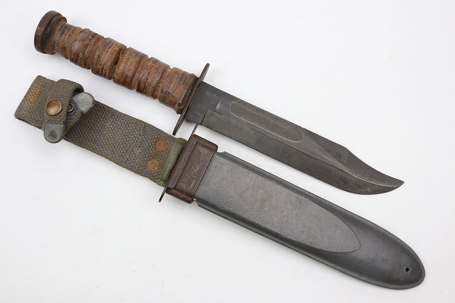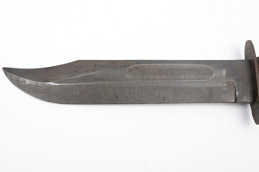 11/30/20 – This is an original USN MK II fighting knife made by Robeson. The hand guard is marked “USN MK 2” and “R.C.C.”. The blade has some light surface patina nd signs of aging but no serious rust or pitting. Also no signs of sharpening. The leather handle is in great condition overall with no loose sections. The pommel is unmarked and has a fair amount of patina. Comes with a USN scabbard with no major flaws and light surface wear on the metal fixtures. All original and authentic.