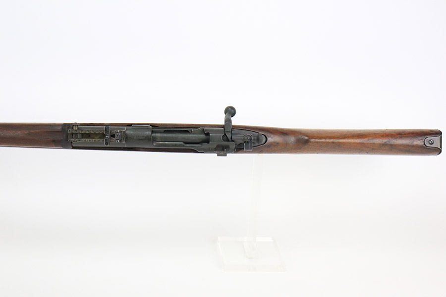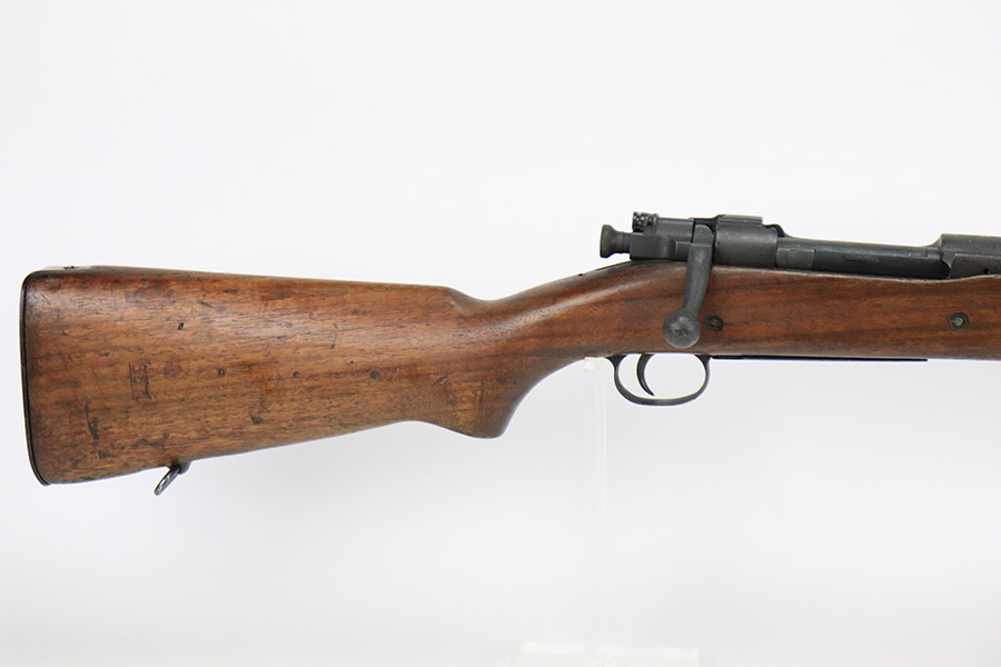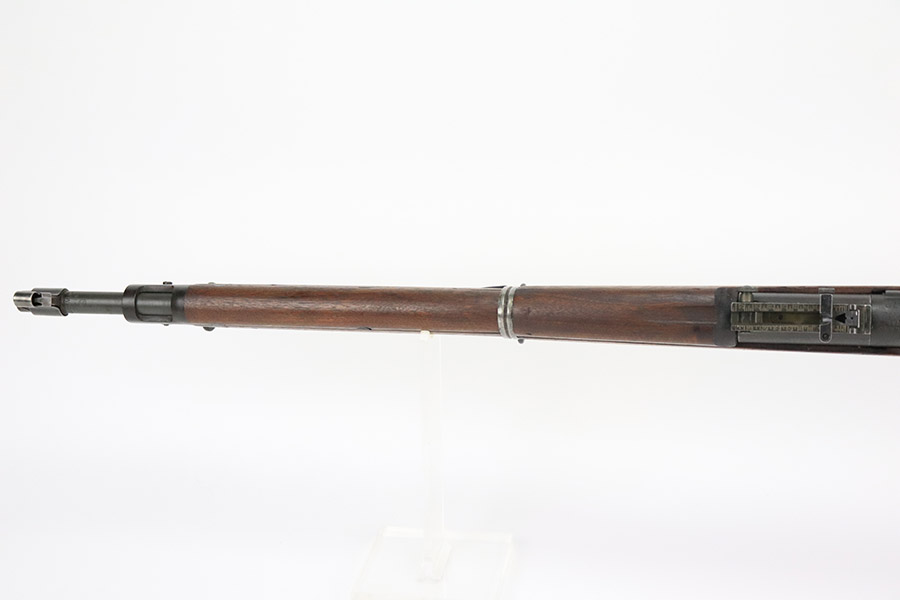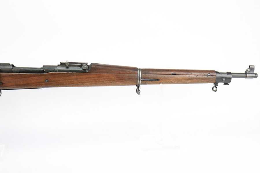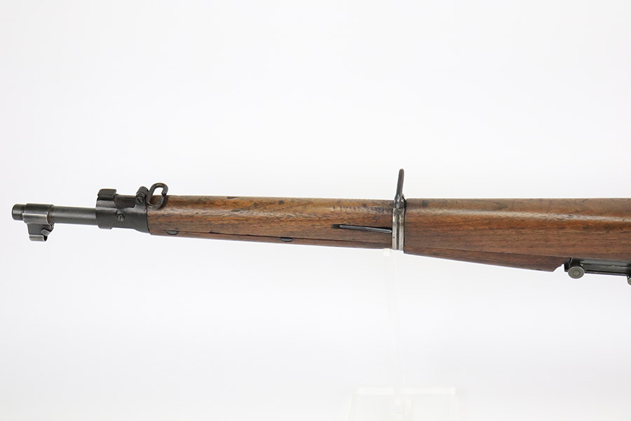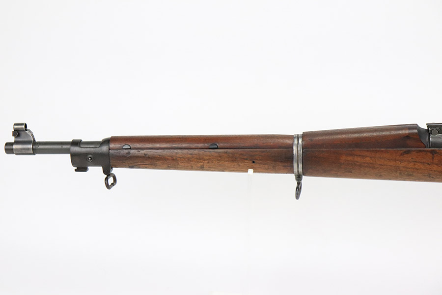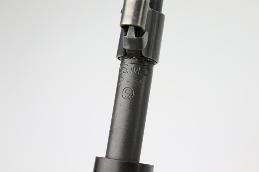 11/18/22 – This is a nice example of a Rock Island Arsenal Model 1903 rifle that was originally issued to the US military in 1918 and later reworked for use during WW2. This particular gun has some US Marine Corps attributes, such as the punch next to the serial number on the receiver, hatcher hole on the left side of the receiver, and a February 1944-dated USMC barrel. However, there has been much debate in the collector community as to the authenticity of these barrels and markings. So we cannot say for sure that this is a USMC-issued gun. In any case, the gun has been parkerized, and there is very little actual finish loss. There are some minor scuffs on the receiver and floor plate / trigger group and some minor wear around the outer edges of the butt plate. Thinning on the rear barrel band (likely replaced). The wood stock has a very faint cross-canon cartouche near the left side of the receiver and a “3371” number on the right side of the butt stock. There is no major damage to the stock, but there are tiny dings and scratches throughout and a few tiny chips around the wrist. Mint bore. Comes with a front sight hood.