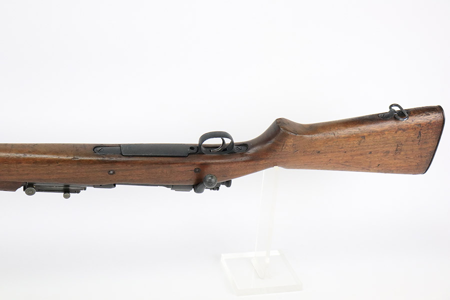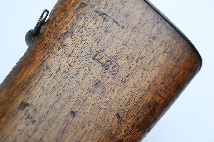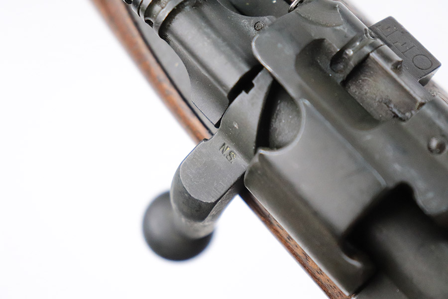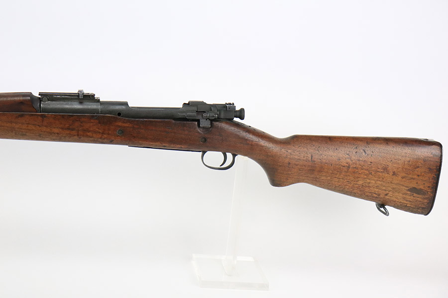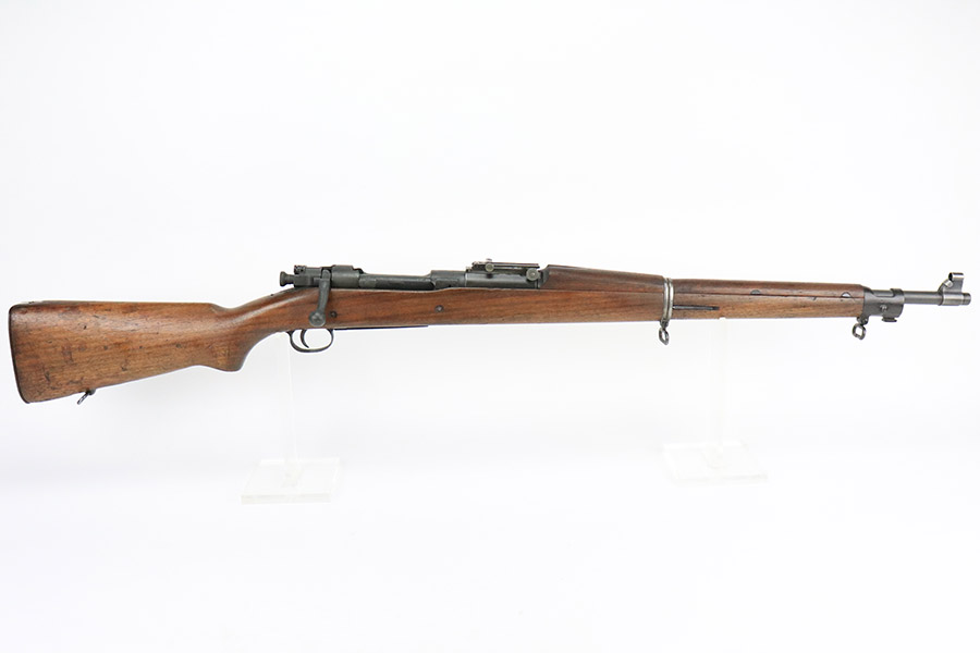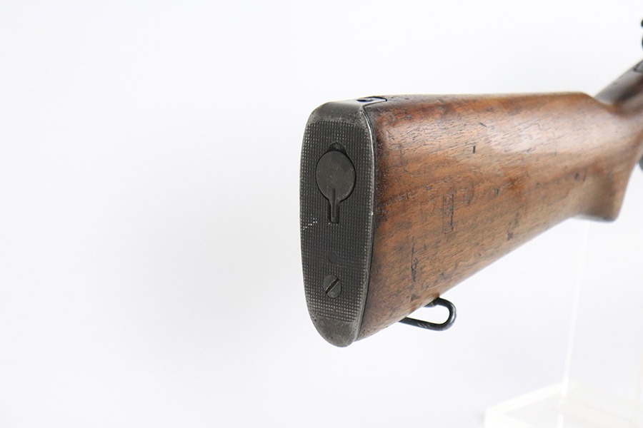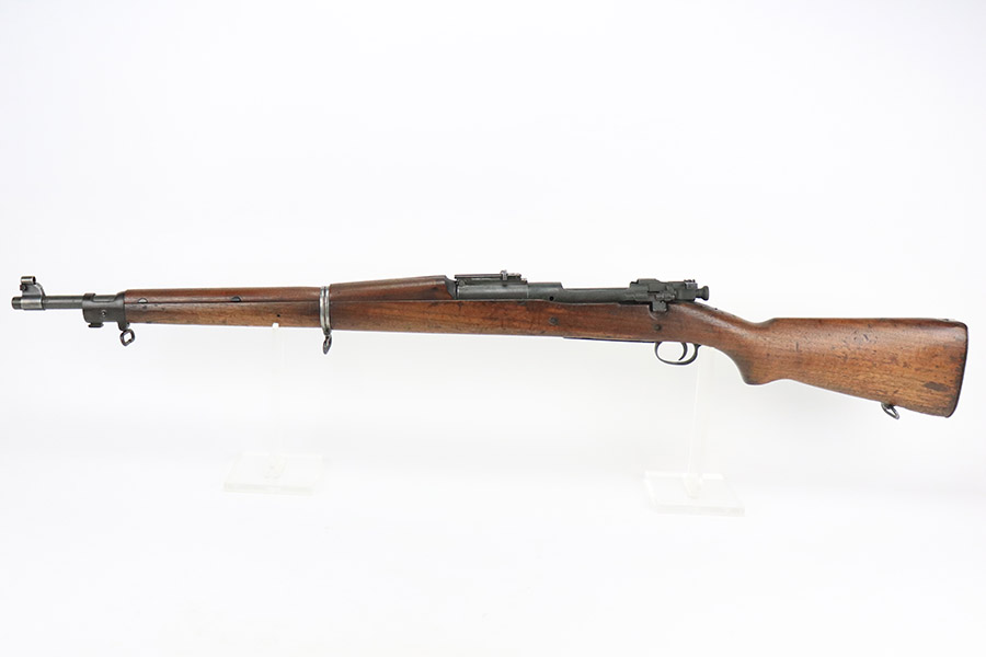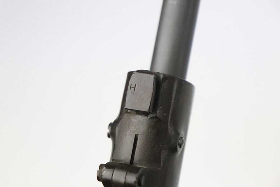 11/18/22 – This is a nice example of a Rock Island Arsenal Model 1903 rifle that was originally issued to the US military in 1918 and later reworked for use during WW2. This particular gun has some US Marine Corps attributes, such as the punch next to the serial number on the receiver, hatcher hole on the left side of the receiver, and a February 1944-dated USMC barrel. However, there has been much debate in the collector community as to the authenticity of these barrels and markings. So we cannot say for sure that this is a USMC-issued gun. In any case, the gun has been parkerized, and there is very little actual finish loss. There are some minor scuffs on the receiver and floor plate / trigger group and some minor wear around the outer edges of the butt plate. Thinning on the rear barrel band (likely replaced). The wood stock has a very faint cross-canon cartouche near the left side of the receiver and a “3371” number on the right side of the butt stock. There is no major damage to the stock, but there are tiny dings and scratches throughout and a few tiny chips around the wrist. Mint bore. Comes with a front sight hood.
