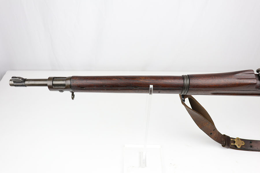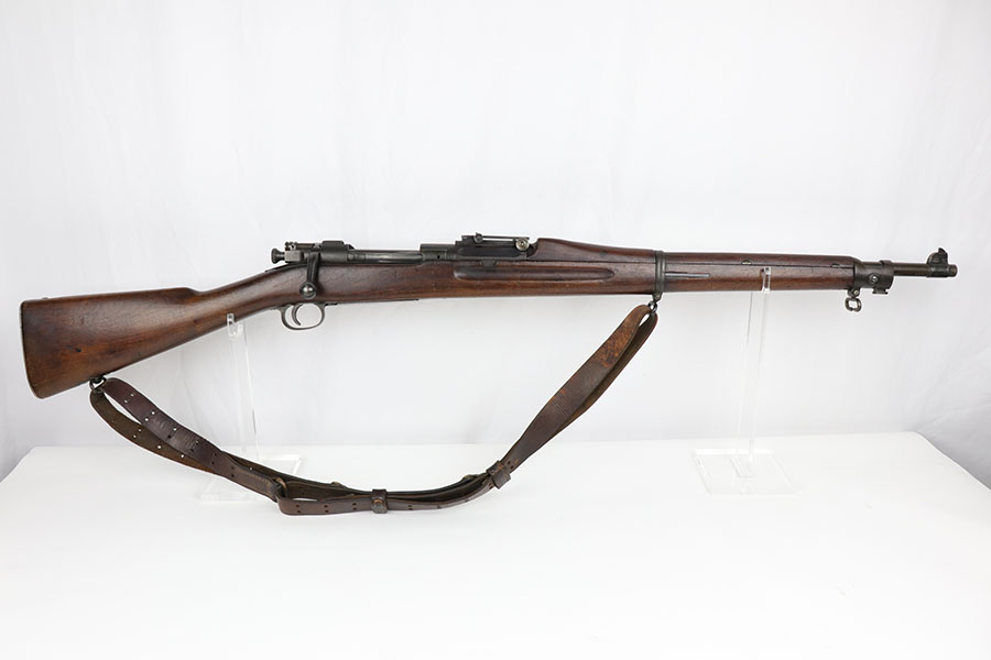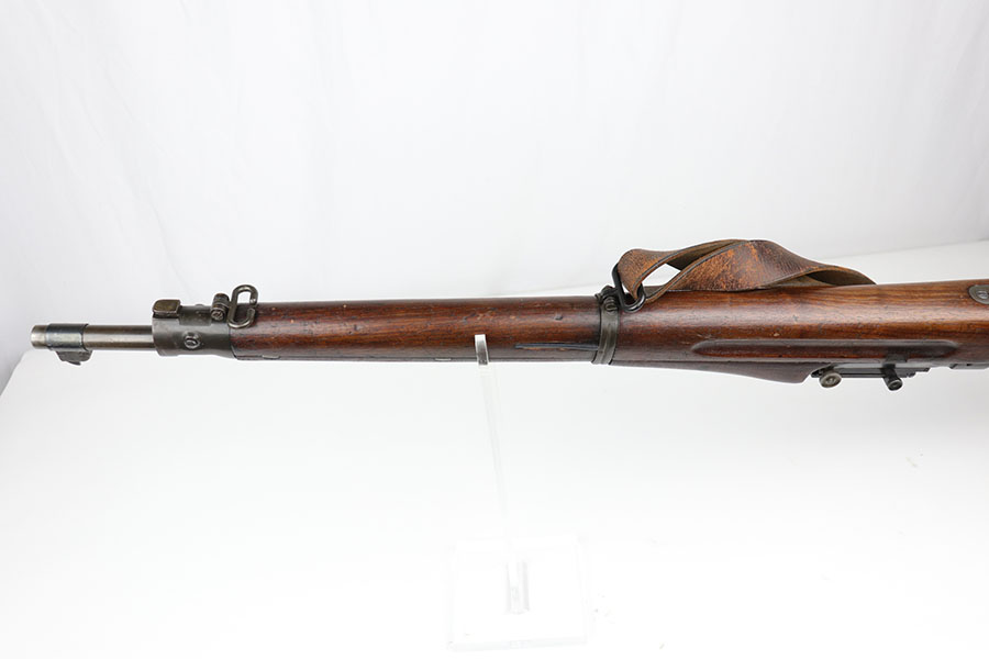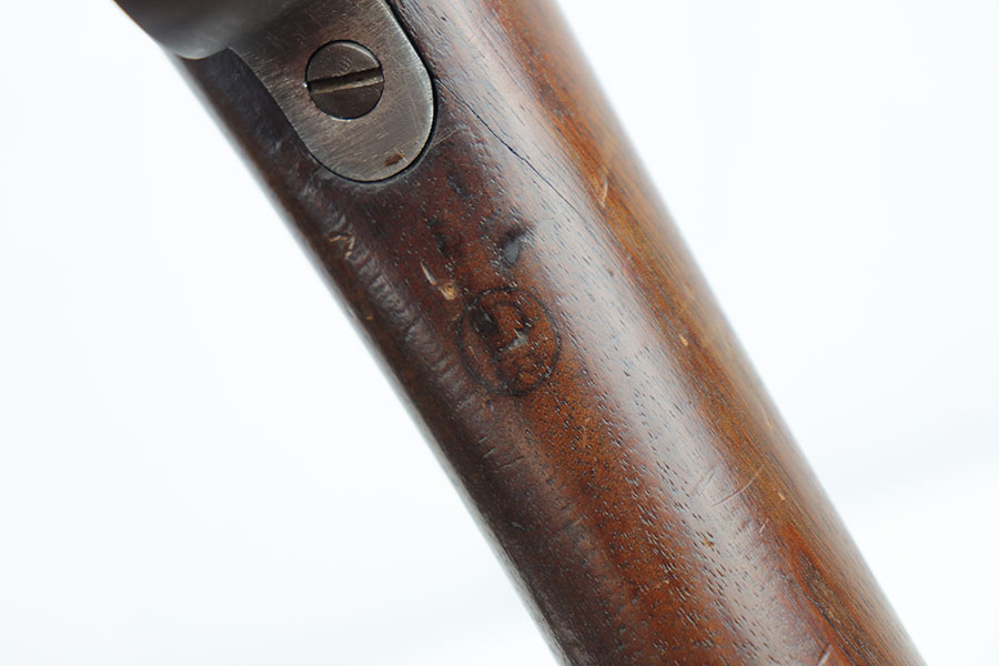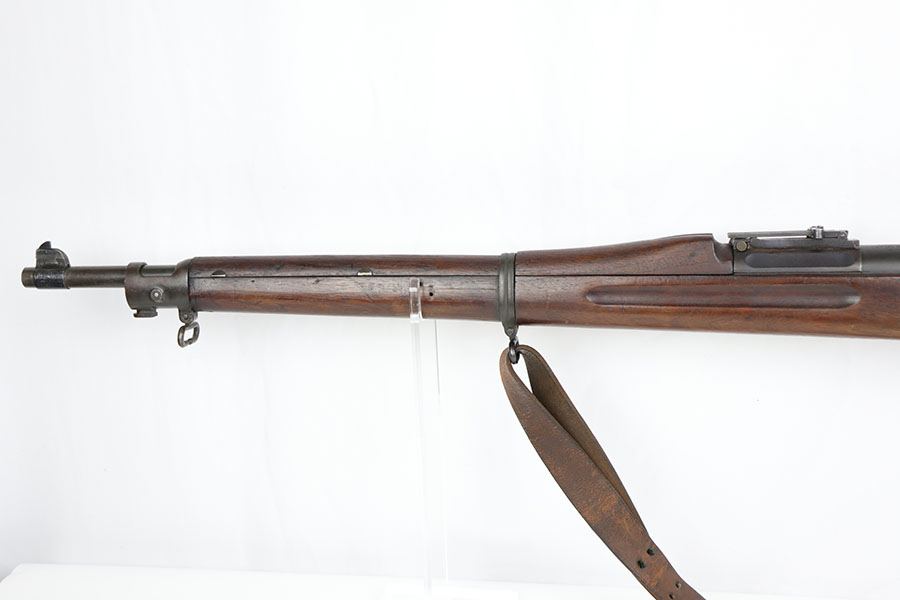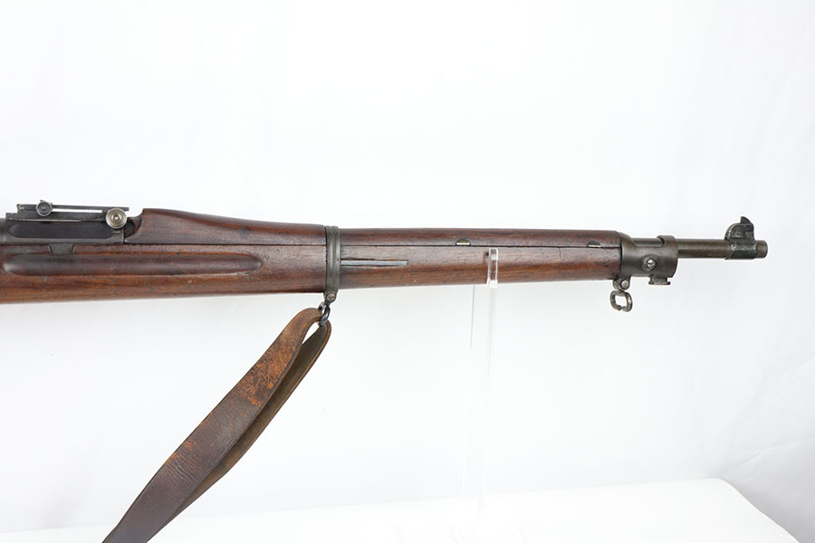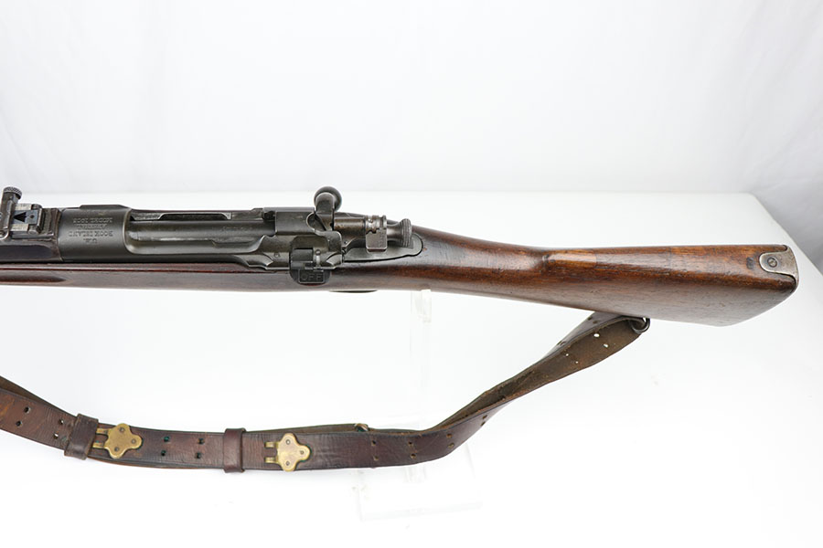 1/17/20 – This is a very early production model 1903 made by Rock Island Arsenal. The rifle is in excellent condition considering its’ age, and has all original parts and condition, except for the hand guard, which is replacement. The wood stock is very nice with a faint remnant of the original inspector stamp on the left side. There is a small repaired area of wood about 2.5 inches long and located on the top of the butt-end of the stock. This is a minor repair and appears to be professionally done. The metal shows light patina throughout, but a remarkable amount of original finish in tact. The bore is about 7/10 with some normal/expected wear and signs of use. There’s light patina throughout but strong rifling. Comes with an original leather sling in great condition as well.