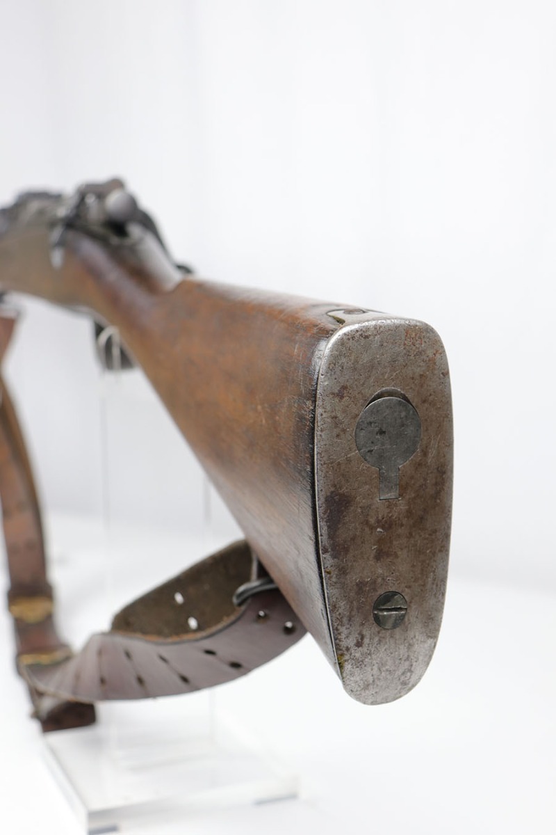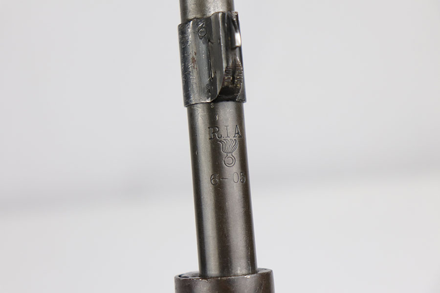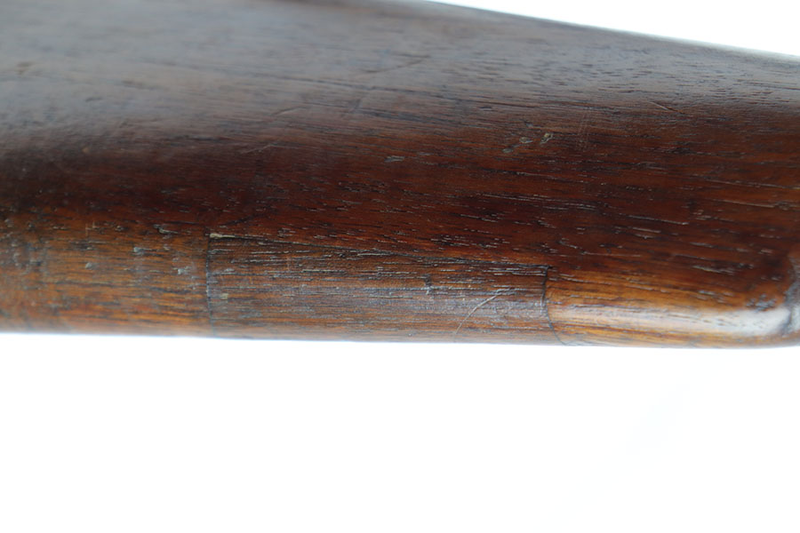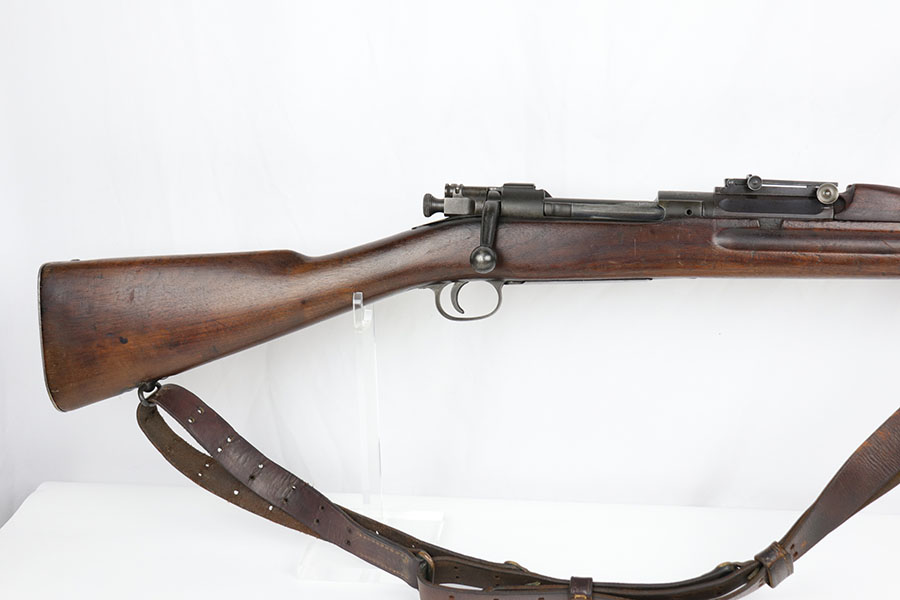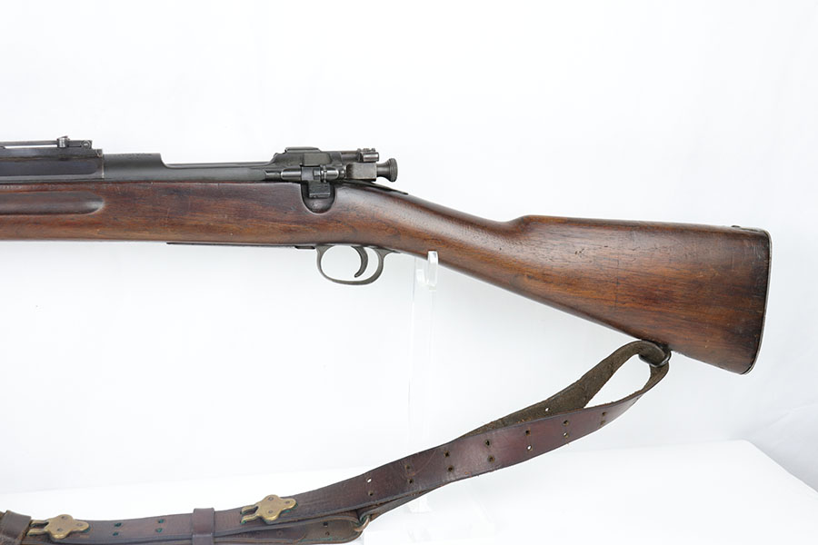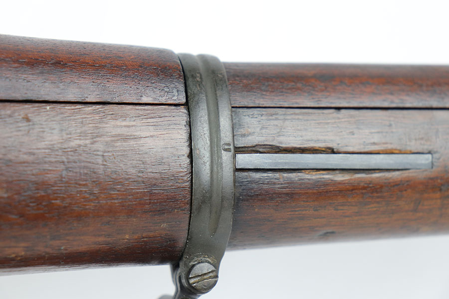 1/17/20 – This is a very early production model 1903 made by Rock Island Arsenal. The rifle is in excellent condition considering its’ age, and has all original parts and condition, except for the hand guard, which is replacement. The wood stock is very nice with a faint remnant of the original inspector stamp on the left side. There is a small repaired area of wood about 2.5 inches long and located on the top of the butt-end of the stock. This is a minor repair and appears to be professionally done. The metal shows light patina throughout, but a remarkable amount of original finish in tact. The bore is about 7/10 with some normal/expected wear and signs of use. There’s light patina throughout but strong rifling. Comes with an original leather sling in great condition as well.