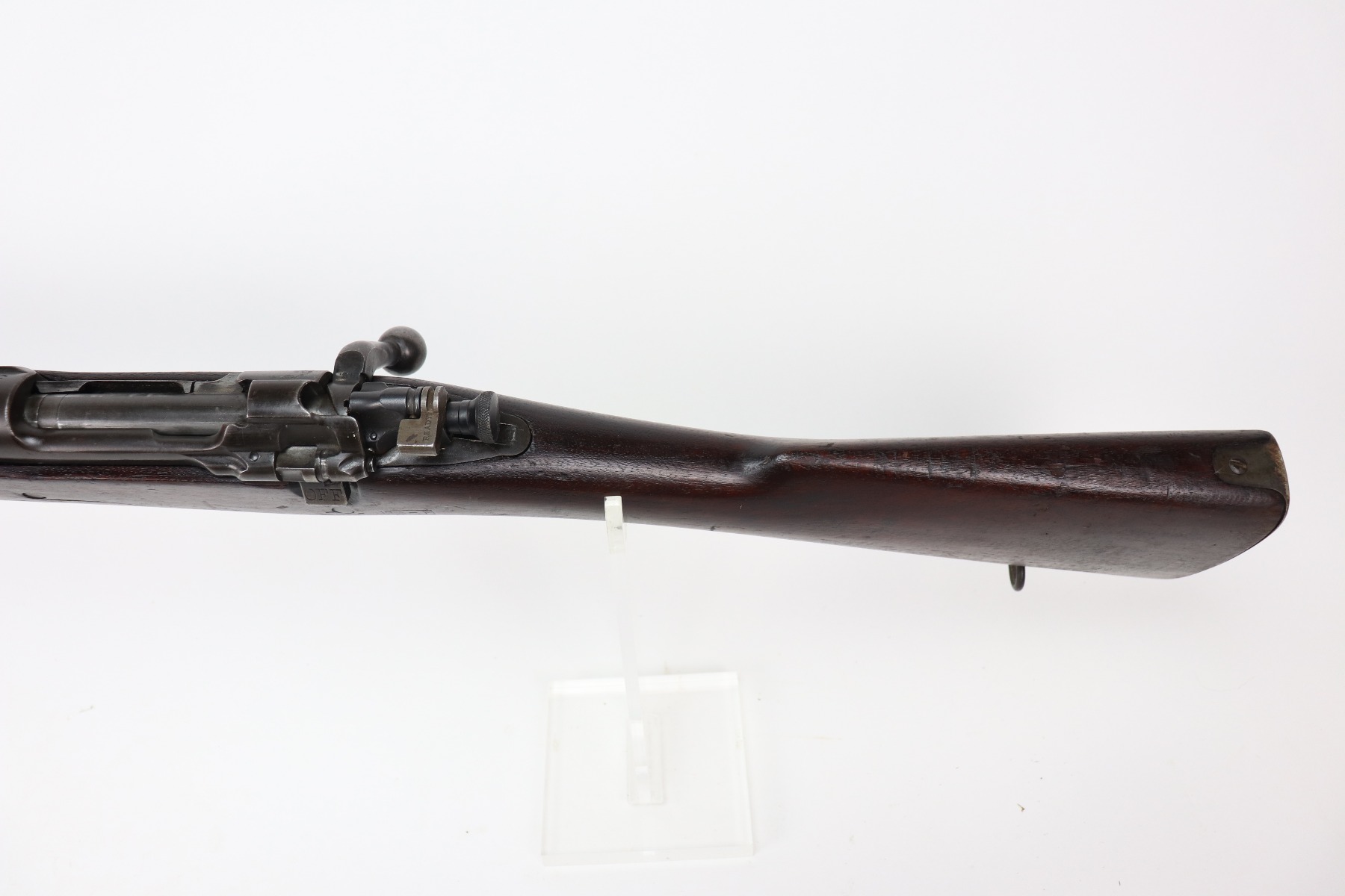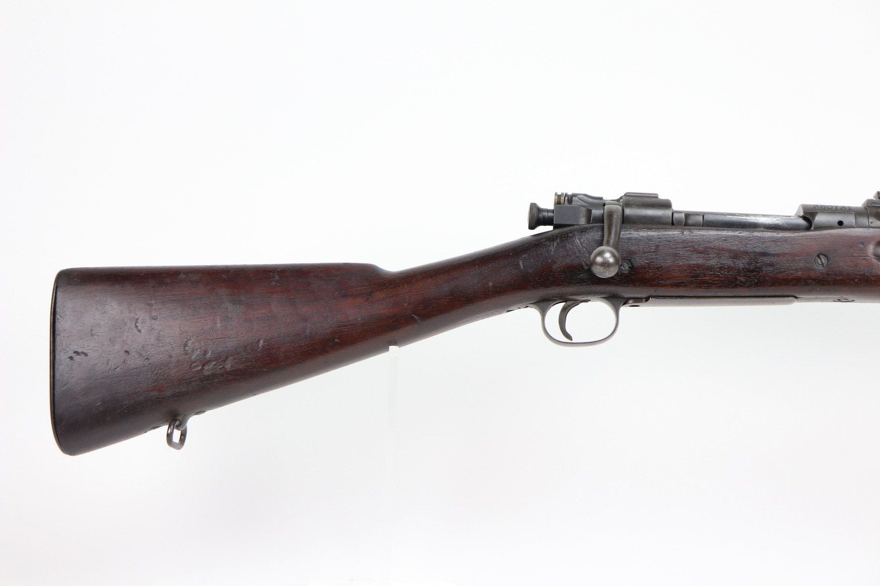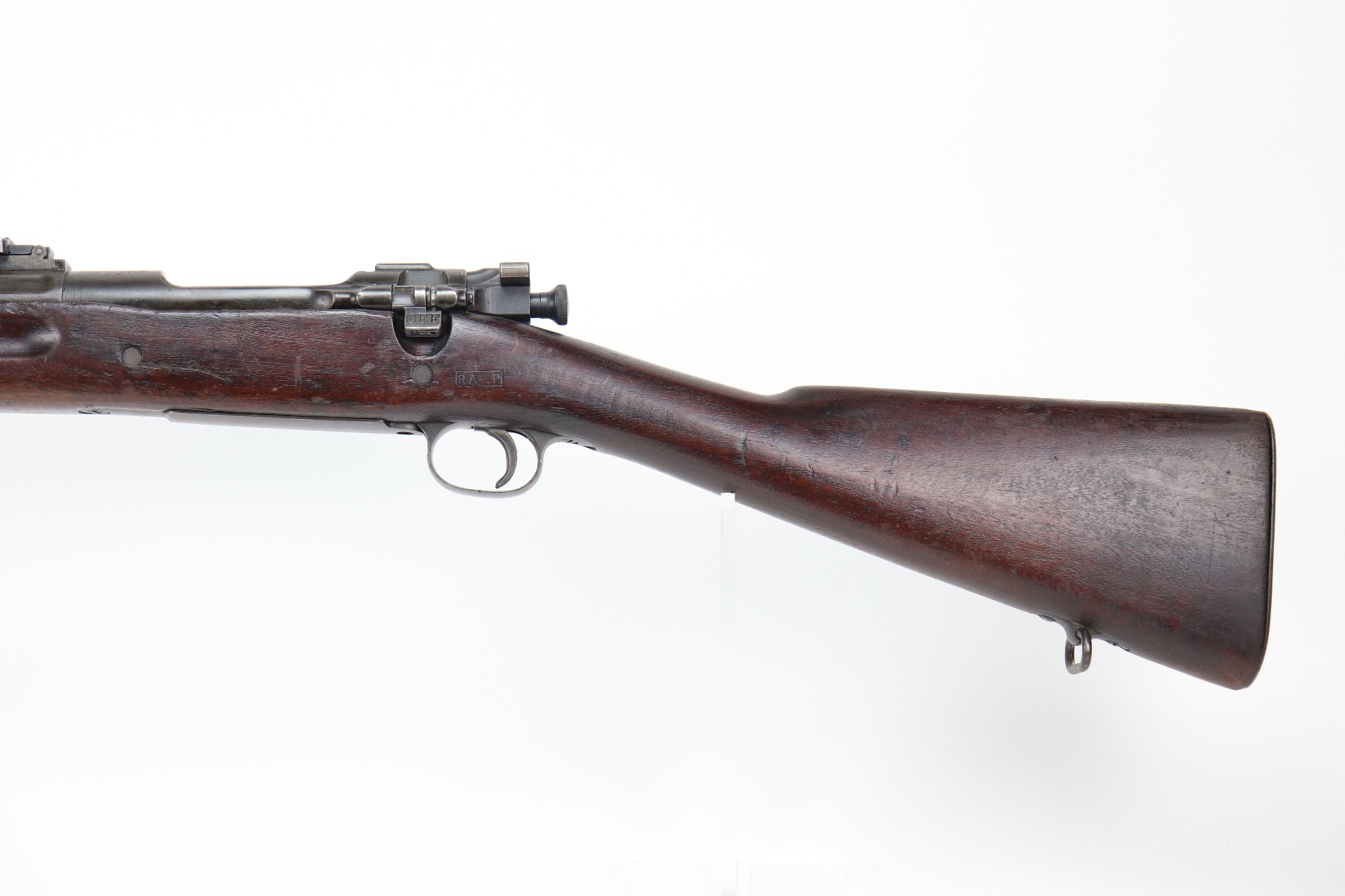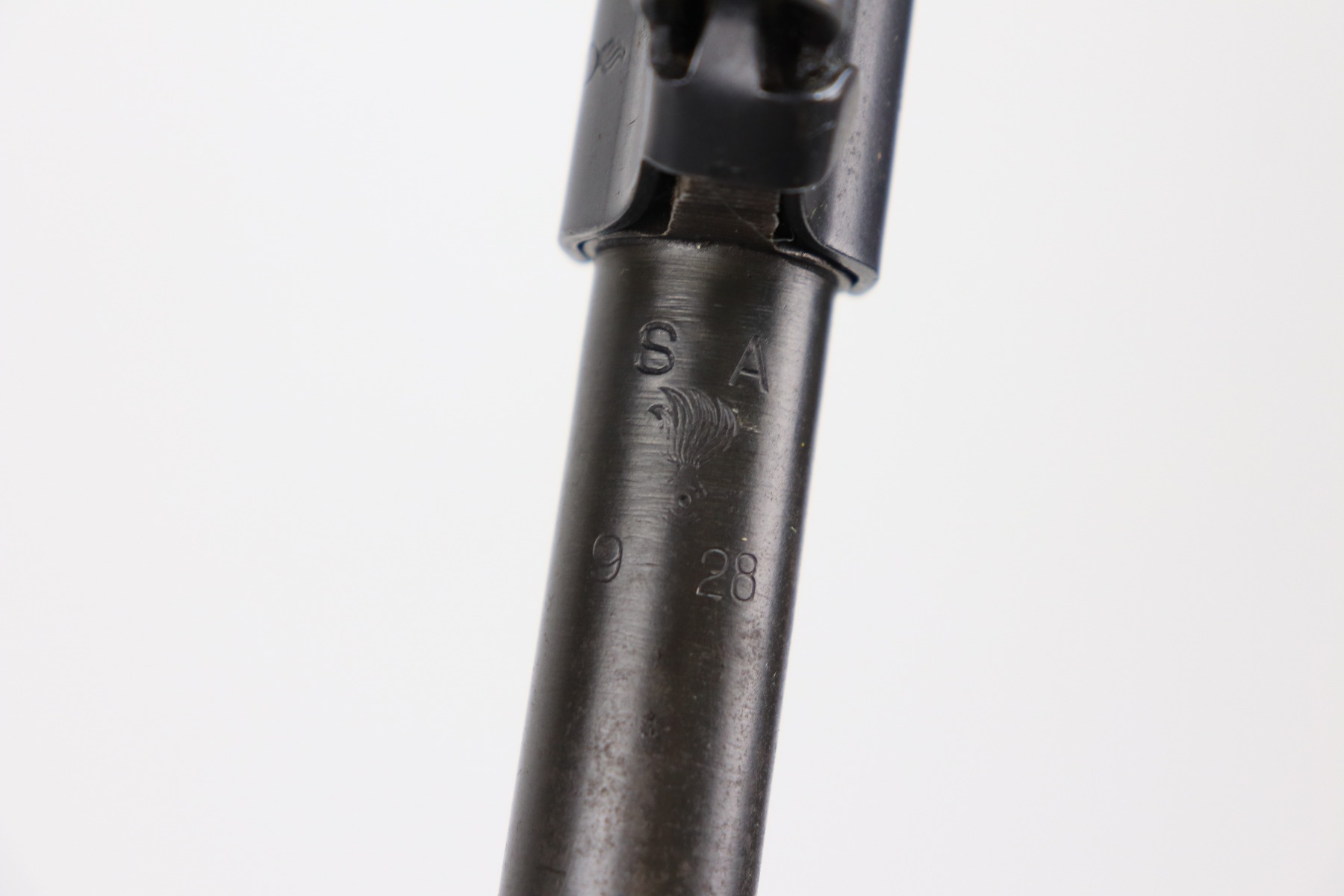 3/25/21 – This is a very nice example of a Rock Island Arsenal Model 1903 bolt action rifle. The serial on the receiver dates it to 1919. It has a Springfield barrel dated 1928. There are no proofs on the stock, but it does have a Ratan Arsenal rework mark. “US” mark and flaming bomb proof on the front sight hood. Overall, the gun is in very nice condition – just some spotty oxidation and patina here and there. The stock is nice, but there are small dings, dents, and scratches throughout. Minty bore.