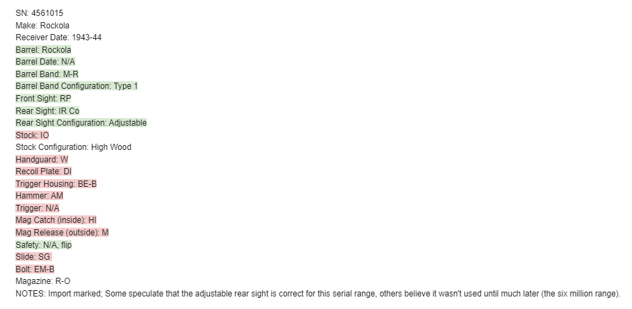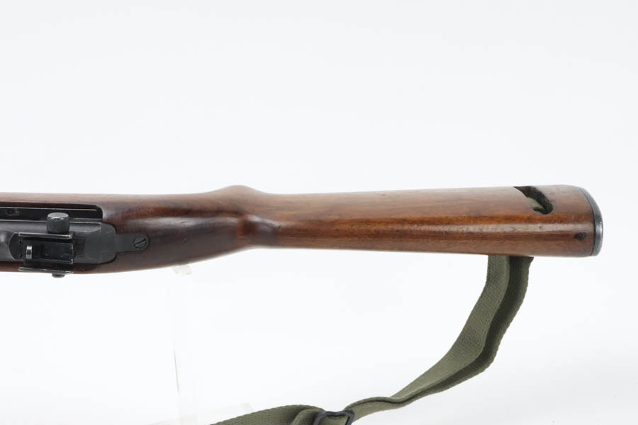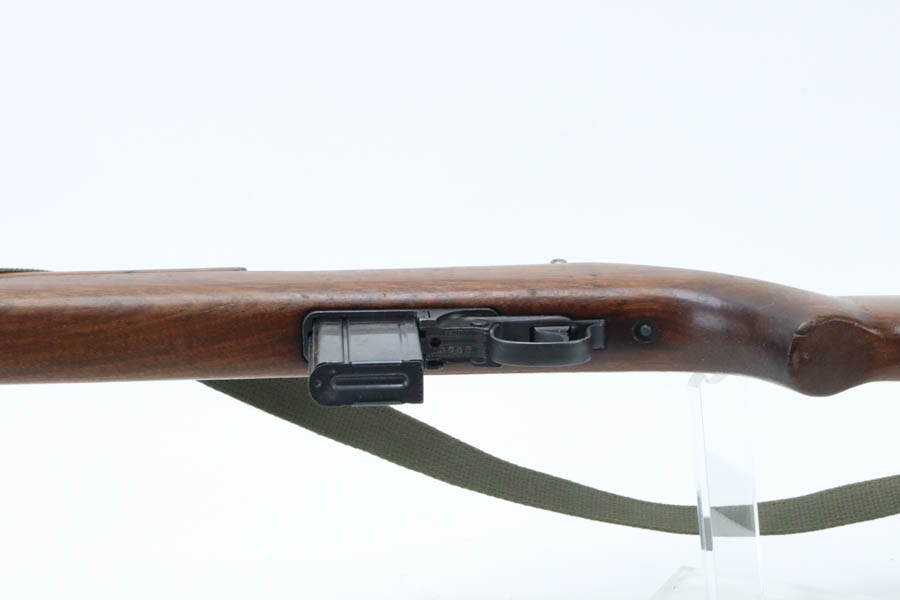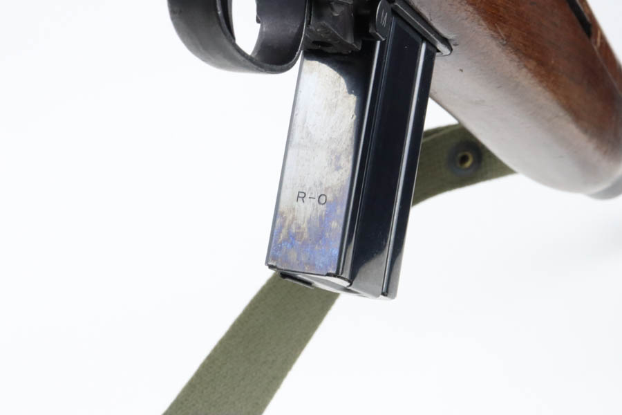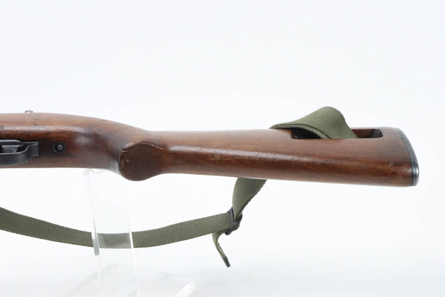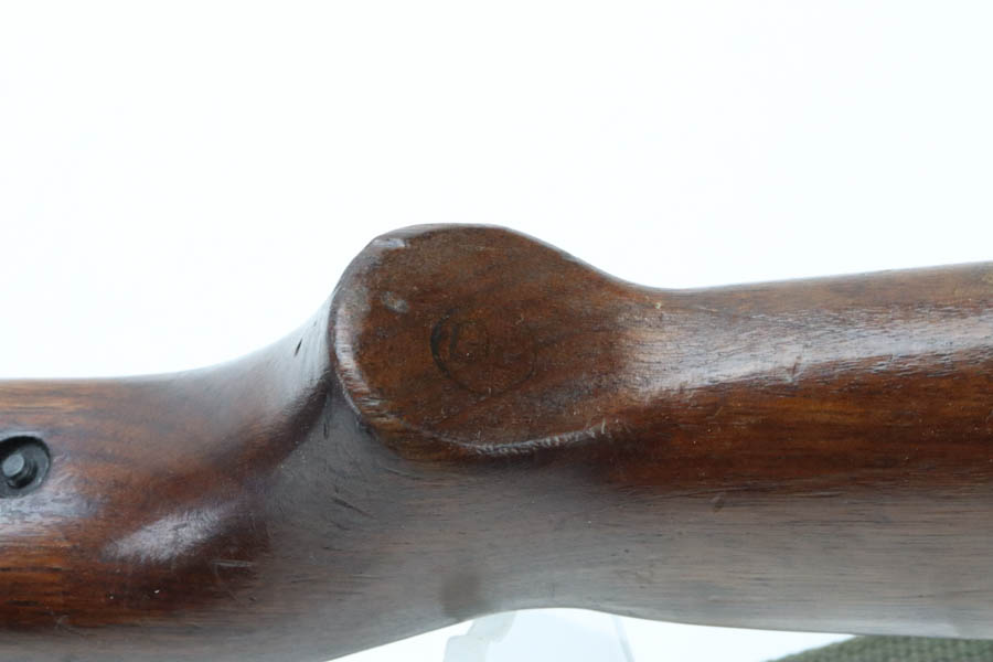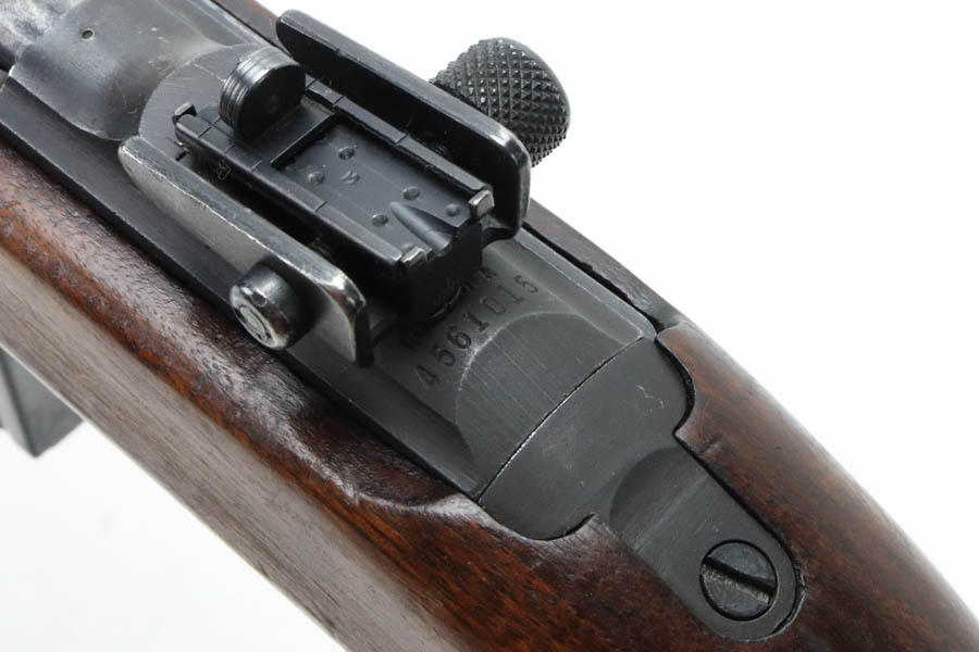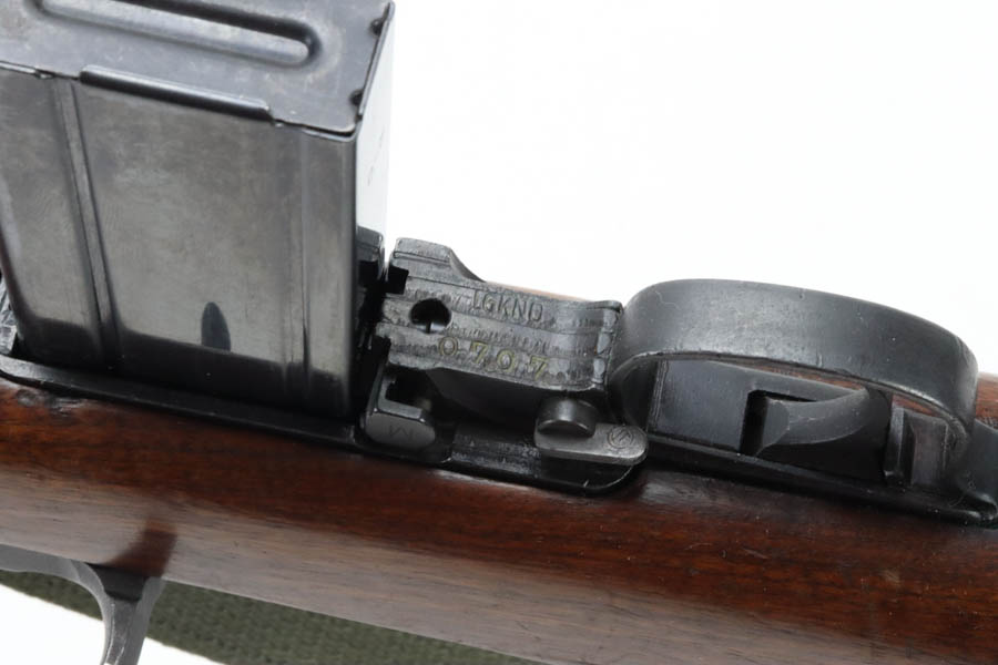 8/20/24 – This is a very nice example of a Rock-Ola M1 Carbine from 1943-44. A complete list of parts and markings is included in the photos. It is import marked on the barrel with an “IGKNO 0707” marking near the trigger guard. This one has an adjustable rear sight – Some speculate that the adjustable rear sight is correct for this serial range, others believe it wasn’t used until much later (the six million range). It has retained about 95% of its finish with general high edge wear and muzzle wear. The wood shows minor bruising and scratching throughout. A number “1015” has been stamped on most of the parts, including the stock. Mint bore. Comes with a canvas sling, oiler, and one magazine.