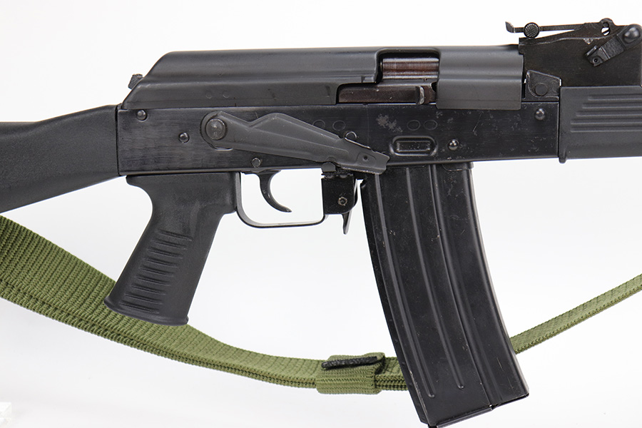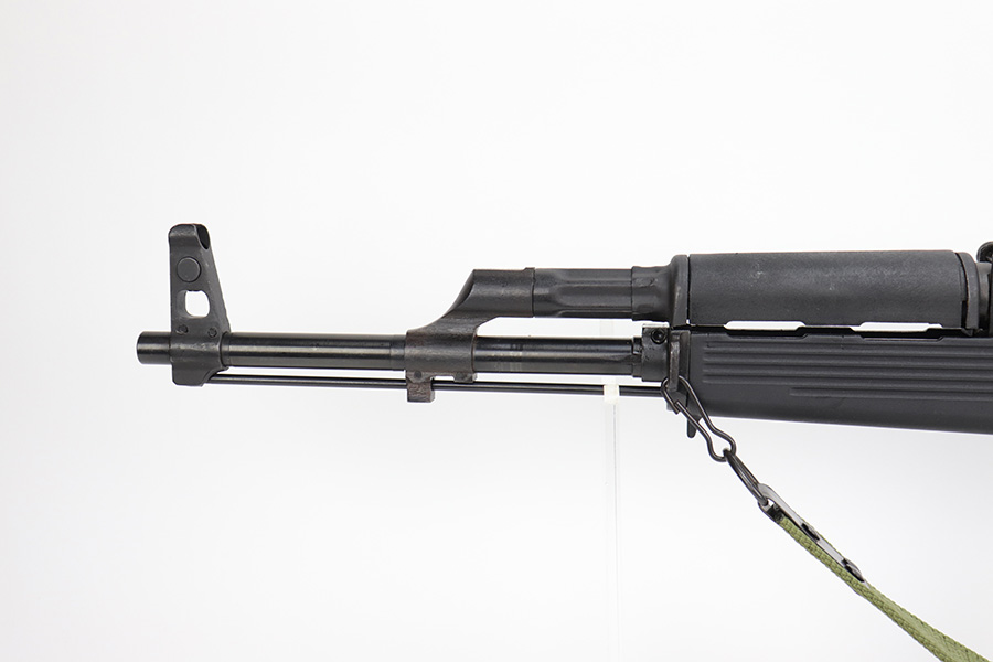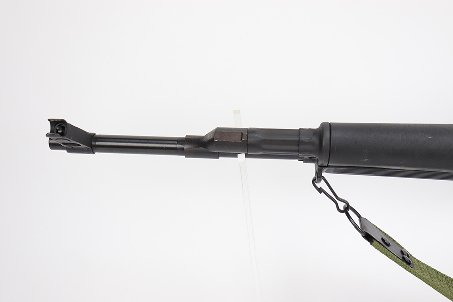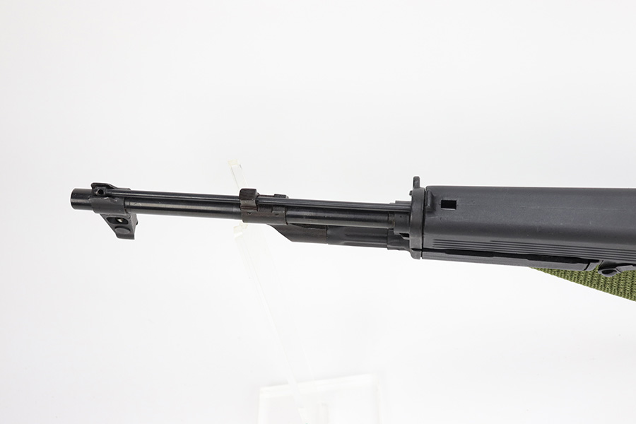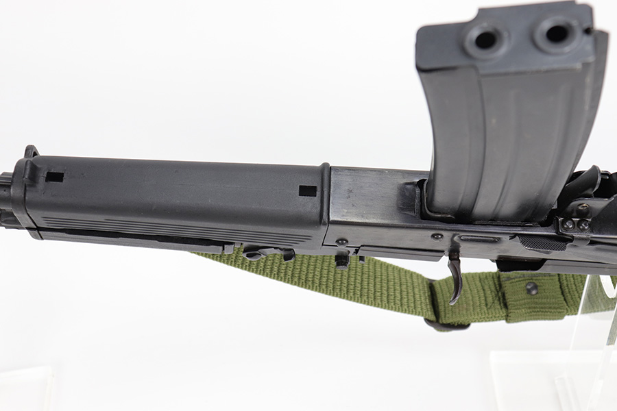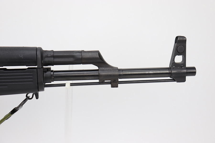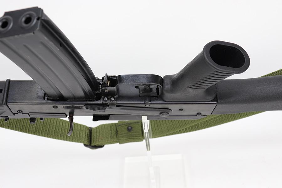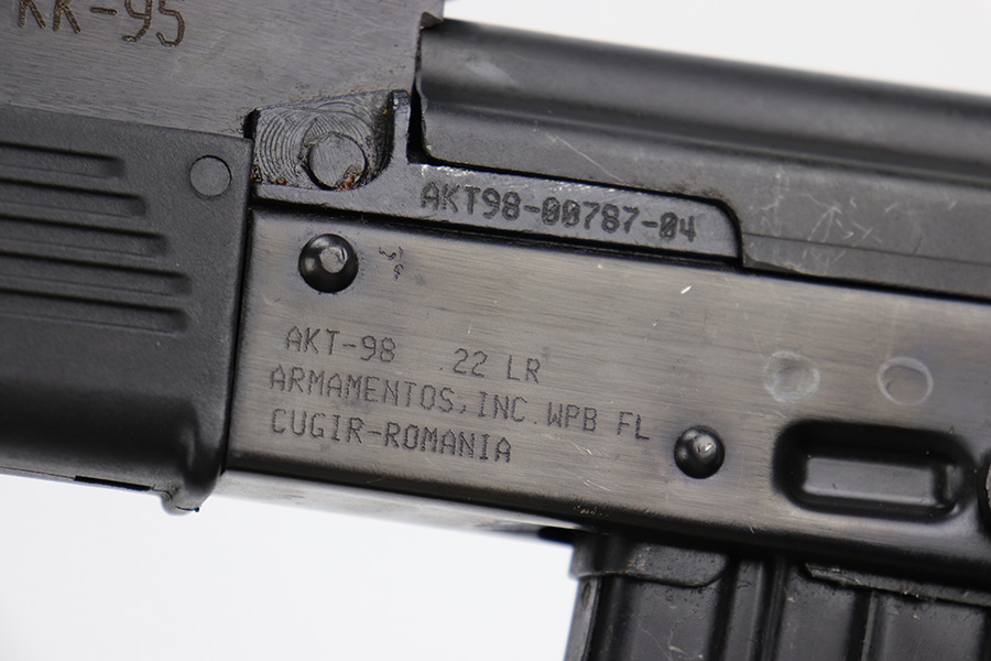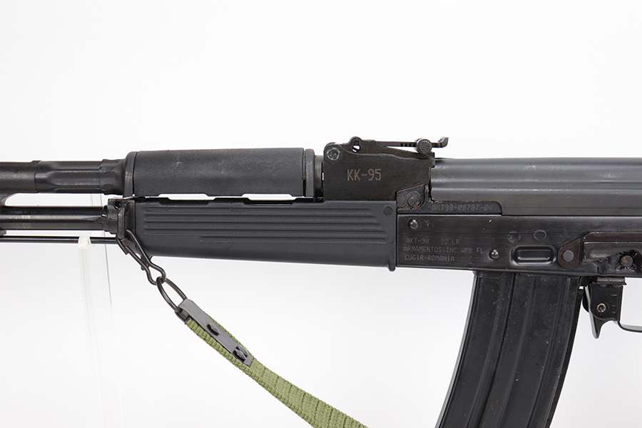 6/15/23 – This is a minty example of a Romanian Cugir AKT-98 Training Carbine, chambered in .22 LR. It is modeled after the AK-47 design. There is virtually no actual finish loss, just some minor scuffs here and there and some very light freckling on the right side of the receiver. Fitted with excellent black plastic furniture. The gun comes with a cleaning rod, green canvas sling, and one 30-round magazine. The bore is mint.