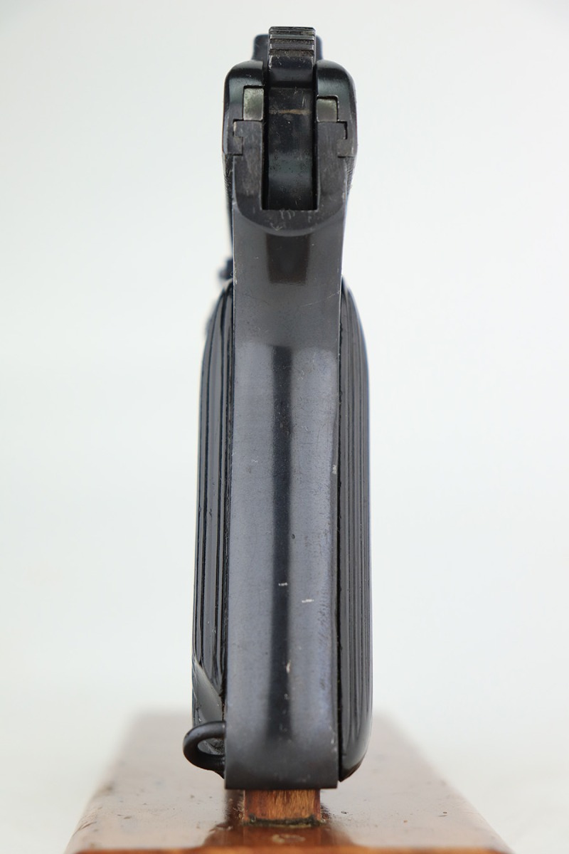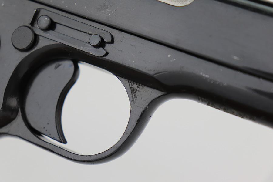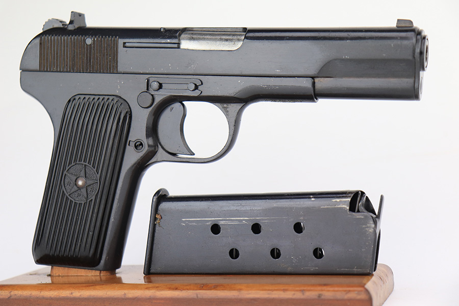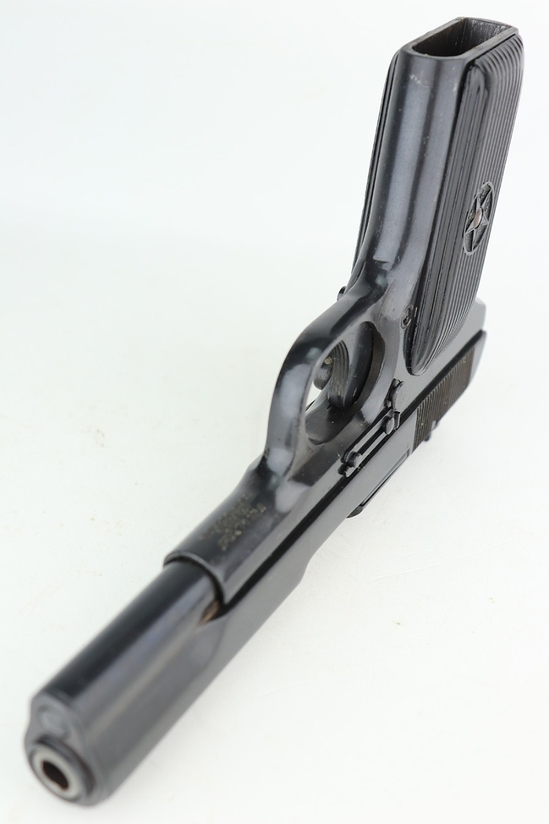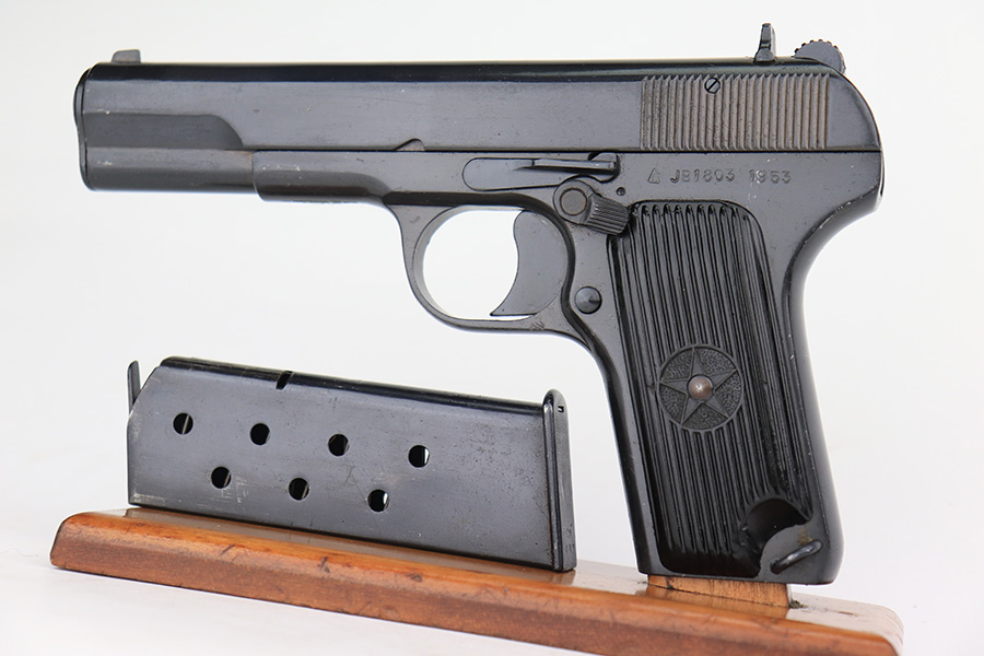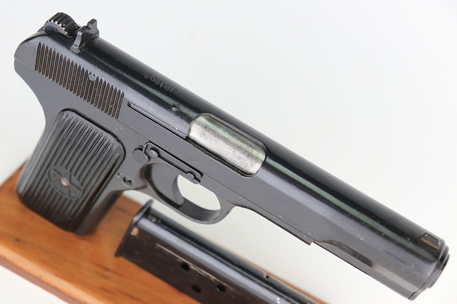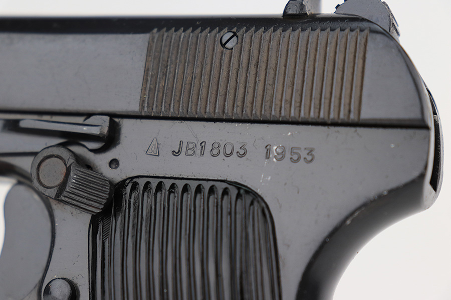 3/21/23 – This is an excellent example of a Romanian Tokarev TT-33 manufactured in 1953 and chambered in 7.62x25mm. It is all matching, but there is an import mark on the underside of the frame. The entire gun has been arsenal refurbished, so the finish is really nice. Almost no actual finish loss, just a few tiny handling marks here and there. Excellent black plastic grips. Comes with one magazine that is numbered but mismatched to the gun. The bore is shiny with strong rifling for the most part. However, there are areas of spotty oxidation and minor pitting throughout.