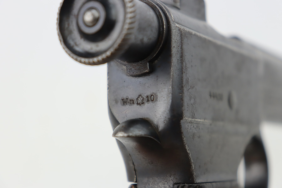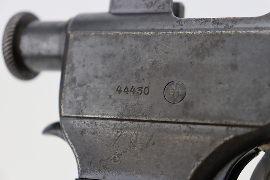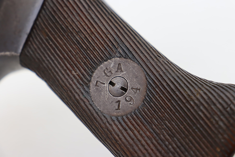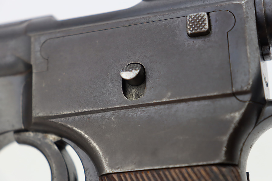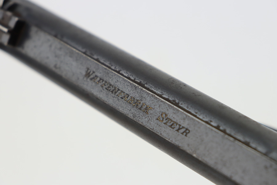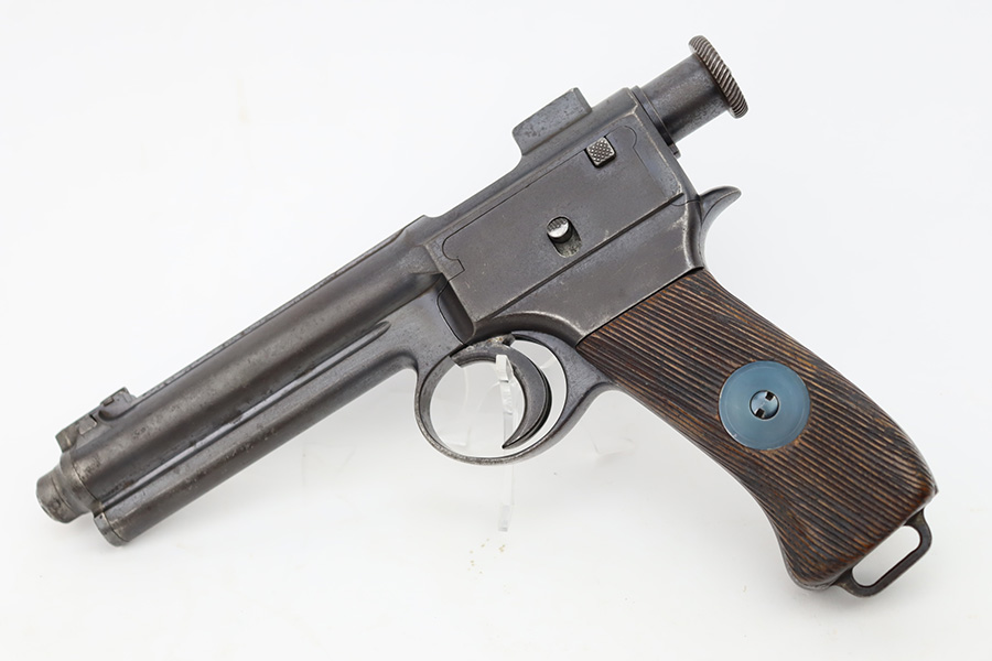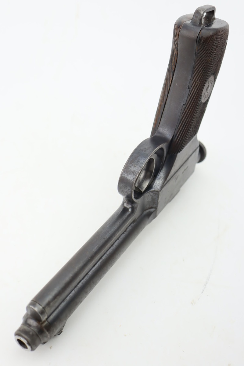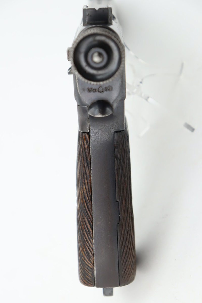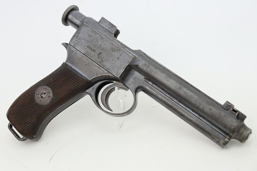 10/12/23 – This is a M1907 Roth Steyr issued to the Austro-Hungarian Army in 1910. This one is all matching, 1909-dated, and has the Austro-Hungarian eagle on the back of the pistol. The disc on the right grip panel is unit-marked “7 GA 194”. The left grip disc may have been replaced. The original finish rates about 94%. While there is very little actual finish loss, there is noticeable brown patina, dulling of the finish, and pin-pricking throughout. Fitted with period-correct wood grips. The bore has decent rifling, but there is minor pitting throughout.