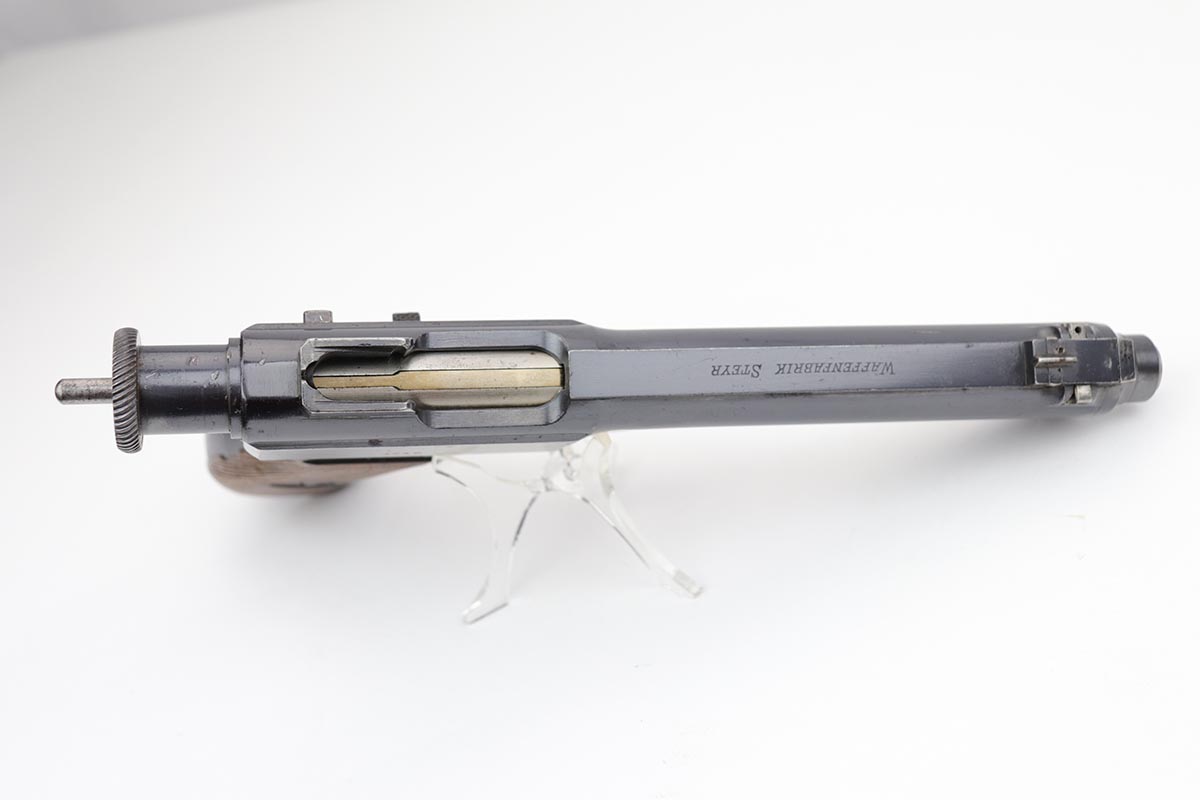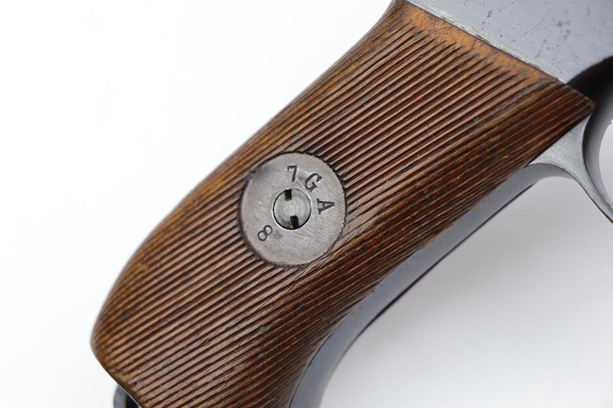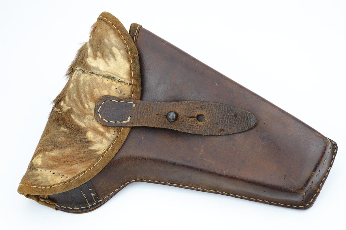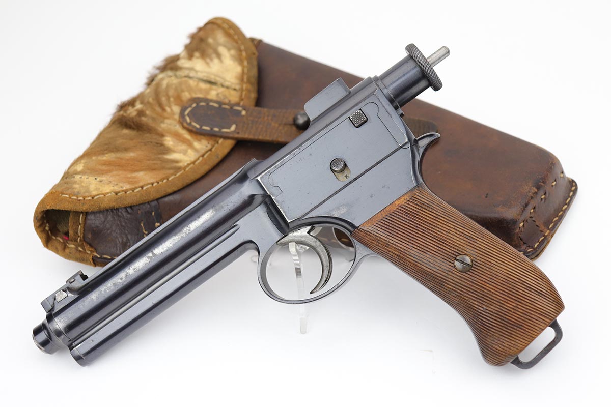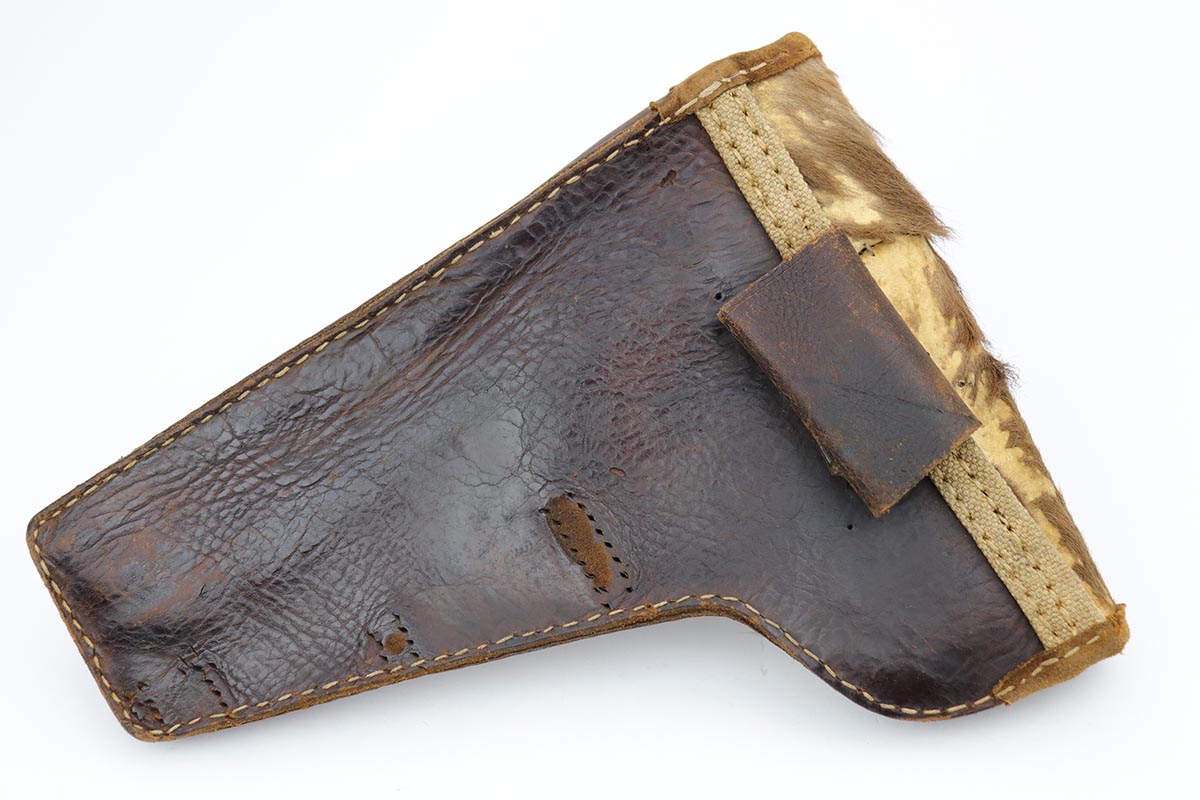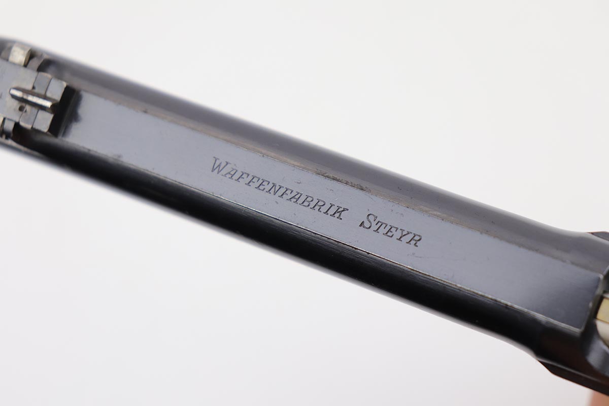 9/27/19 – This is a nice example of a Roth-Steyr M1907 pistol rig, manufactured in 1909. Adopted by the Austro-Hungarian Army in 1907 and manufactured by Osterreichische Waffenfabrik-Ges in Steyr, Austria, from 1907 to 1914. The pistol functions with a locked breech, rotating barrel action. Features a double action trigger, knurled cocking piece, fixed blade and notch sights, and the second variation frame with the disconnector pin. The top of the barrel is marked “WAFFENFABRIK STEYR,” and the rear of the frame is marked “W.n/eagle/9”. The disc in right grip panel is marked ‘7GA8’, denoting it was issued to the 7th Mountain Artillery and pistol #8 of the batch. Could be possible that this pistol fought in the Alps against Italy. The pistol is all original with about 92% high-polish blue remaining, showing most finish loss on either side of the slide. Bore is shiny with strong rifling, but there is a minor area of freckling. The pistol comes with what appears to be an original holster, as the fuzzy upper flap would appear in line with the fact that the pistol was issued to Mountain Artillery.