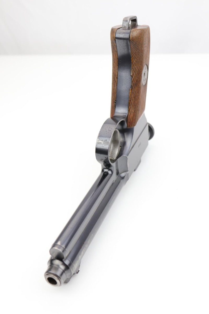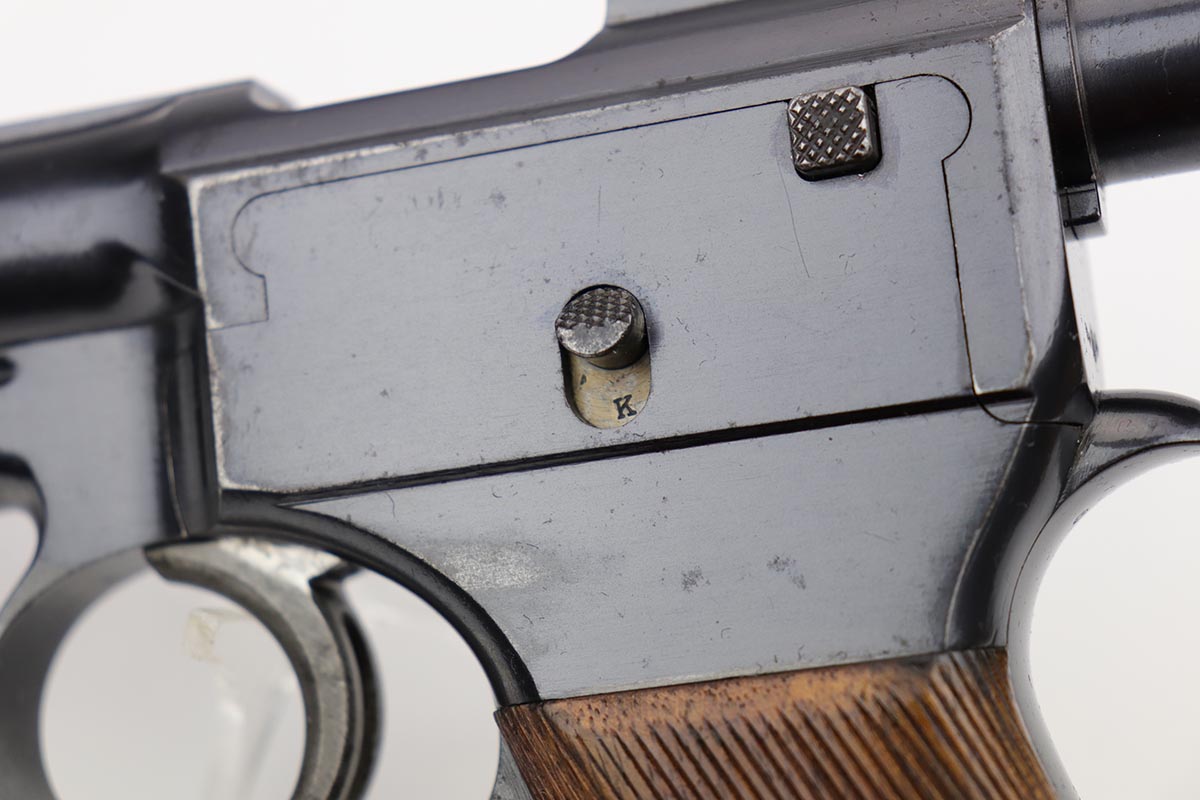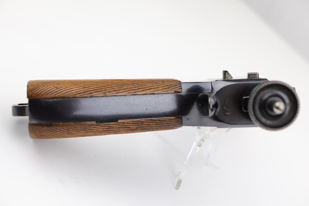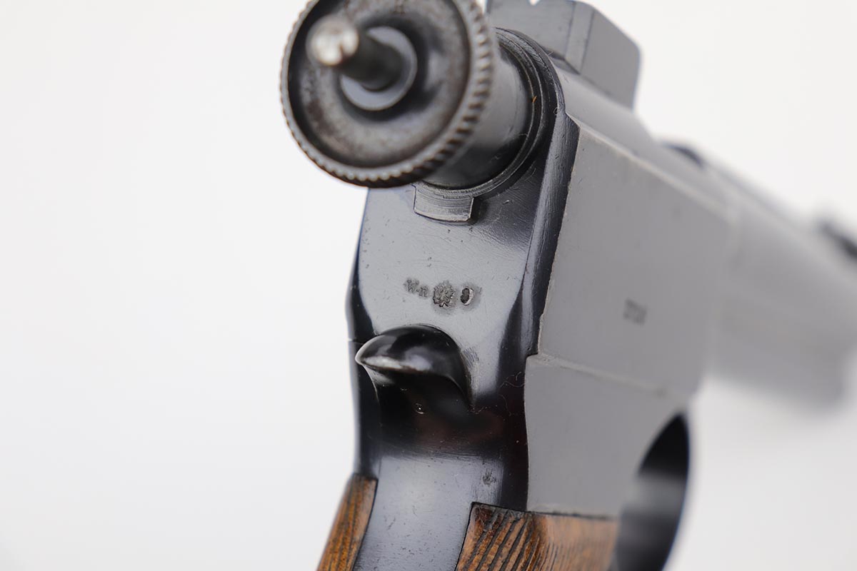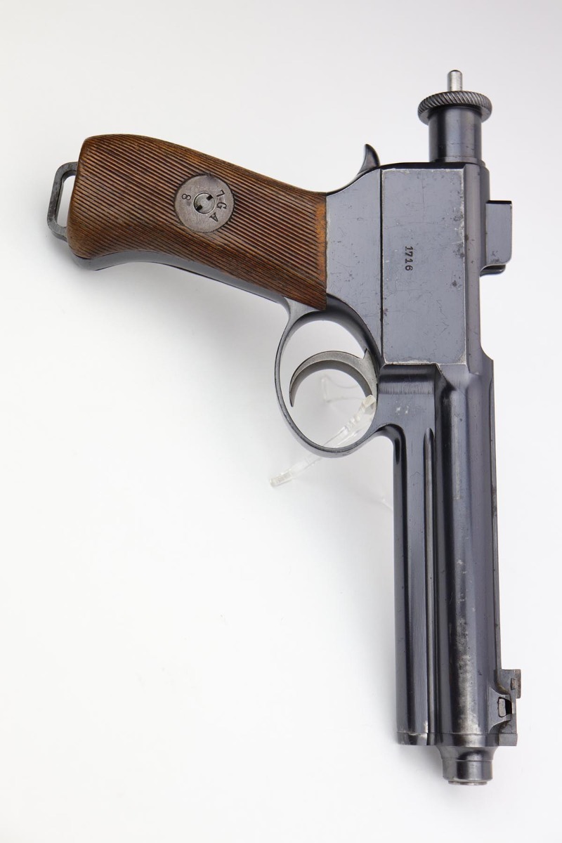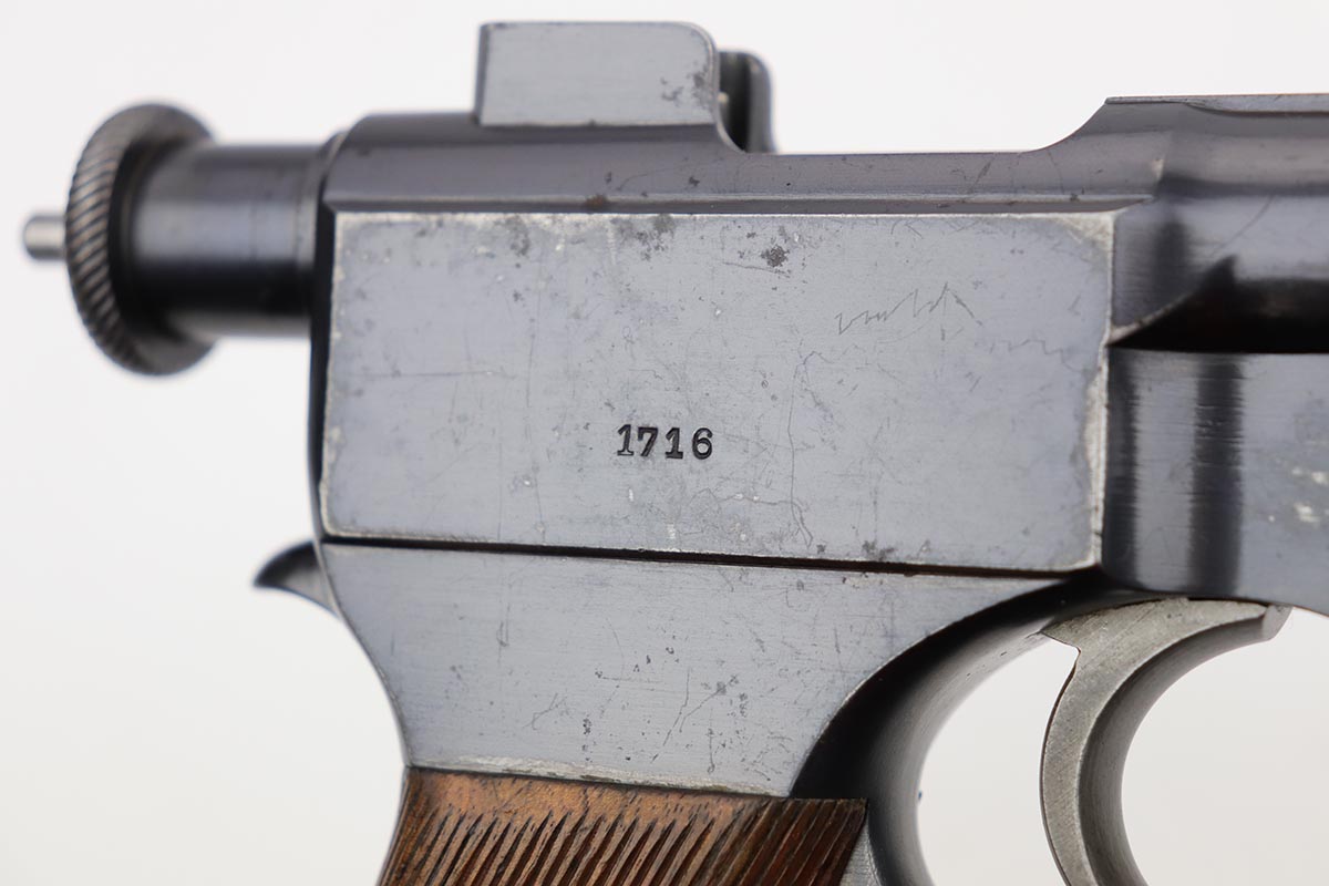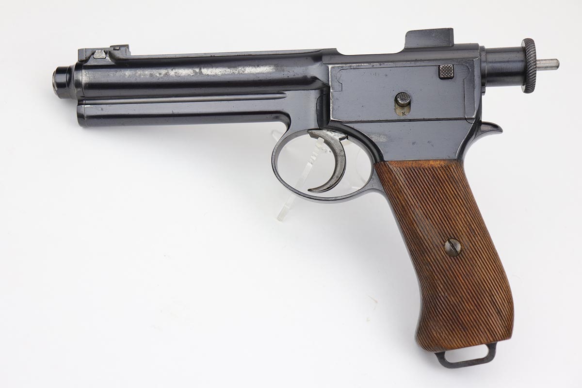 9/27/19 – This is a nice example of a Roth-Steyr M1907 pistol rig, manufactured in 1909. Adopted by the Austro-Hungarian Army in 1907 and manufactured by Osterreichische Waffenfabrik-Ges in Steyr, Austria, from 1907 to 1914. The pistol functions with a locked breech, rotating barrel action. Features a double action trigger, knurled cocking piece, fixed blade and notch sights, and the second variation frame with the disconnector pin. The top of the barrel is marked “WAFFENFABRIK STEYR,” and the rear of the frame is marked “W.n/eagle/9”. The disc in right grip panel is marked ‘7GA8’, denoting it was issued to the 7th Mountain Artillery and pistol #8 of the batch. Could be possible that this pistol fought in the Alps against Italy. The pistol is all original with about 92% high-polish blue remaining, showing most finish loss on either side of the slide. Bore is shiny with strong rifling, but there is a minor area of freckling. The pistol comes with what appears to be an original holster, as the fuzzy upper flap would appear in line with the fact that the pistol was issued to Mountain Artillery.