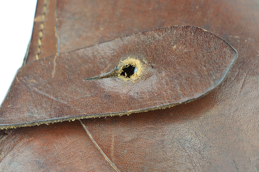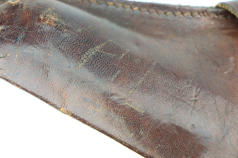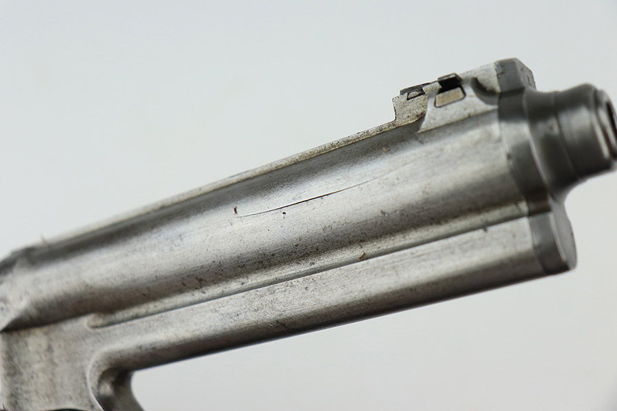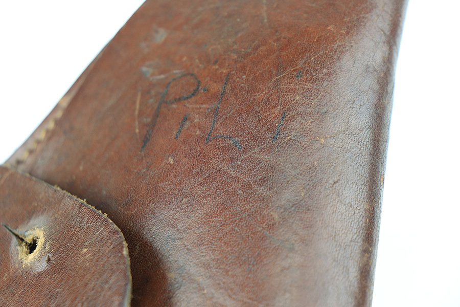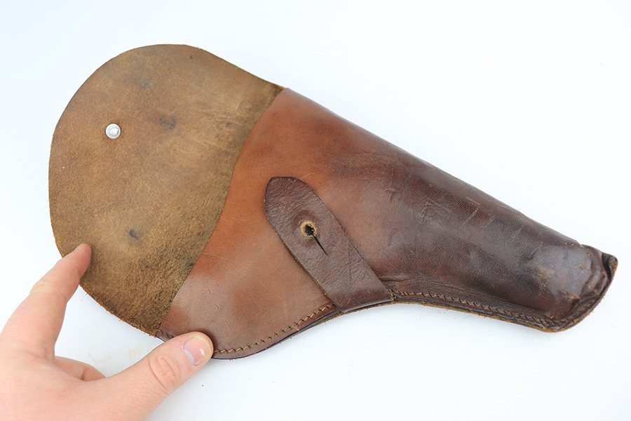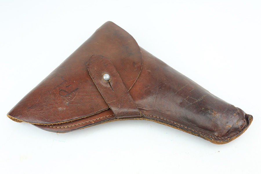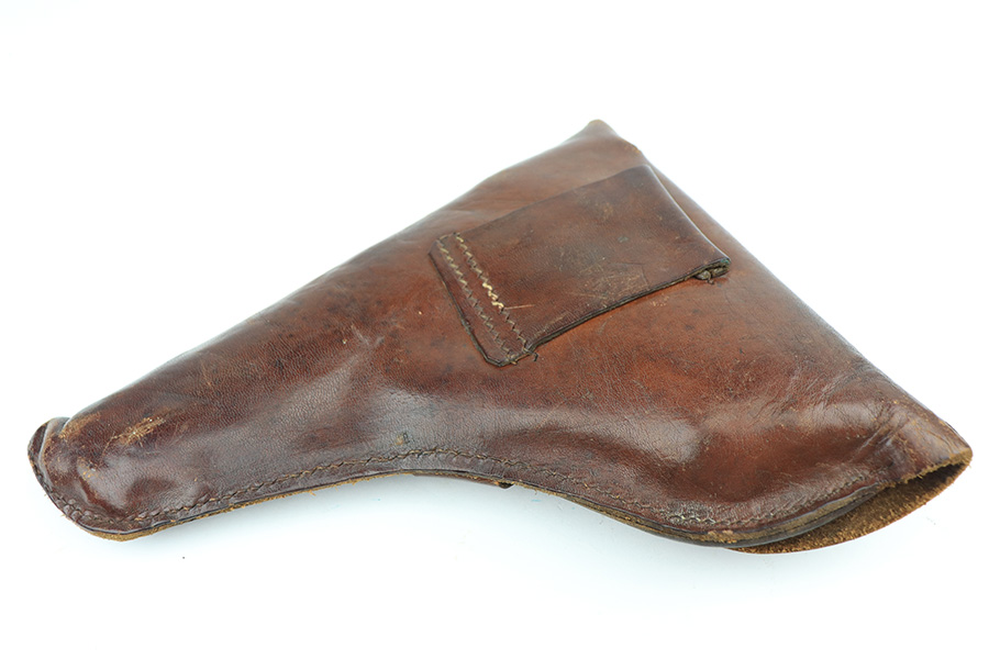 3/4/22 – This is a nice example of a Roth-Steyr Model 1907 rig made some time in the early 1900’s. We believe this gun could very well be a “tool room sample”, or a gun put together from parts directly from the factory floor. This is evidenced by the fact that the gun is completely in the white (no finish) and has no serial numbers or approval markings, other than the legend on the top of the slide. In any case, the gun has no finish, but there are tiny dots of oxidation throughout. It comes as a rig with a nice brown leather holster that fits the gun well. It has nice wood grips with minor scratches and bruises here and there. The bore is near-mint with areas of tiny pin-pricking here and there.