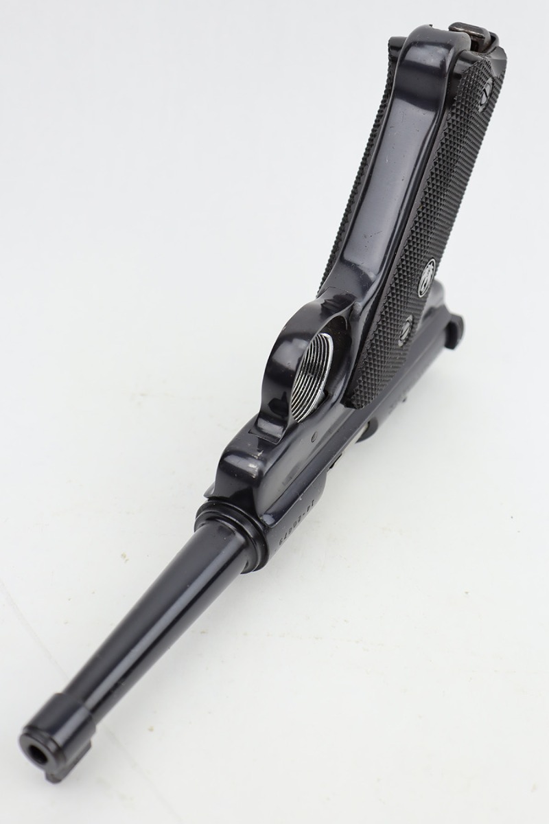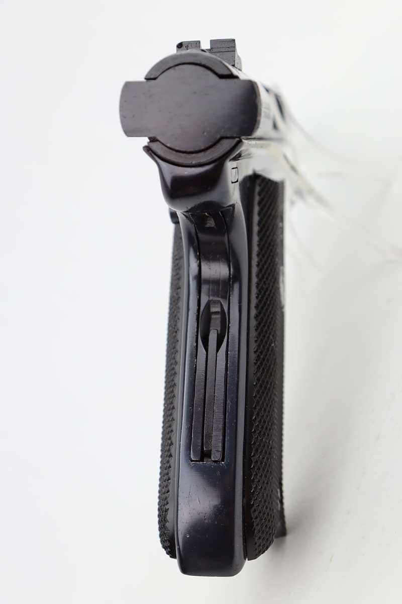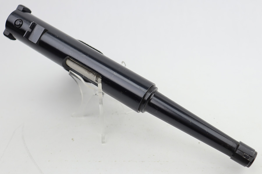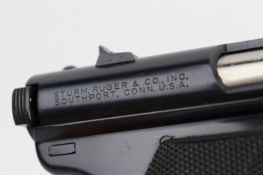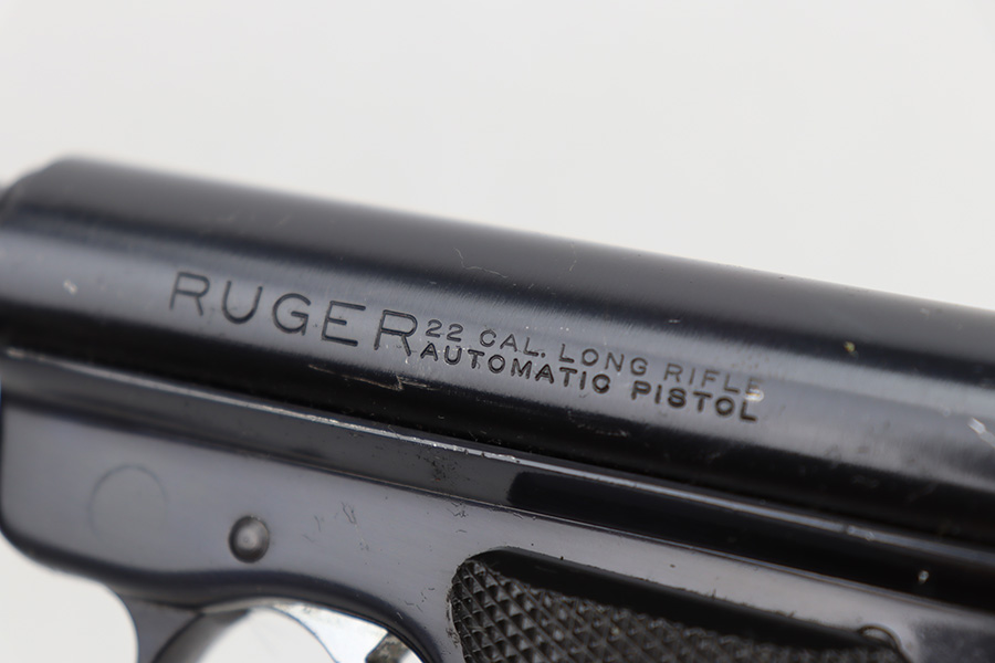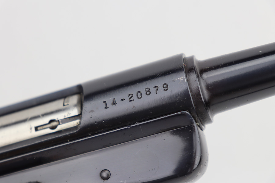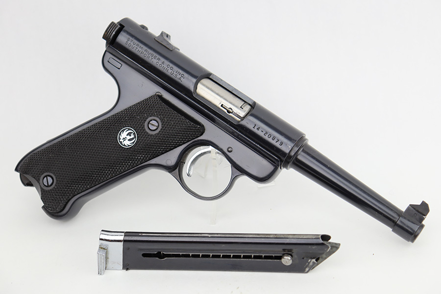 6/14/23 – This is an excellent example of a Ruger Mark I semi auto pistol, manufactured in 1979 and chambered in .22 LR. It has retained nearly all of its original bluing, but there are tiny scratches and handling marks here and there. Fitted with excellent black plastic grips and comes with one proper magazine. Near-mint bore.