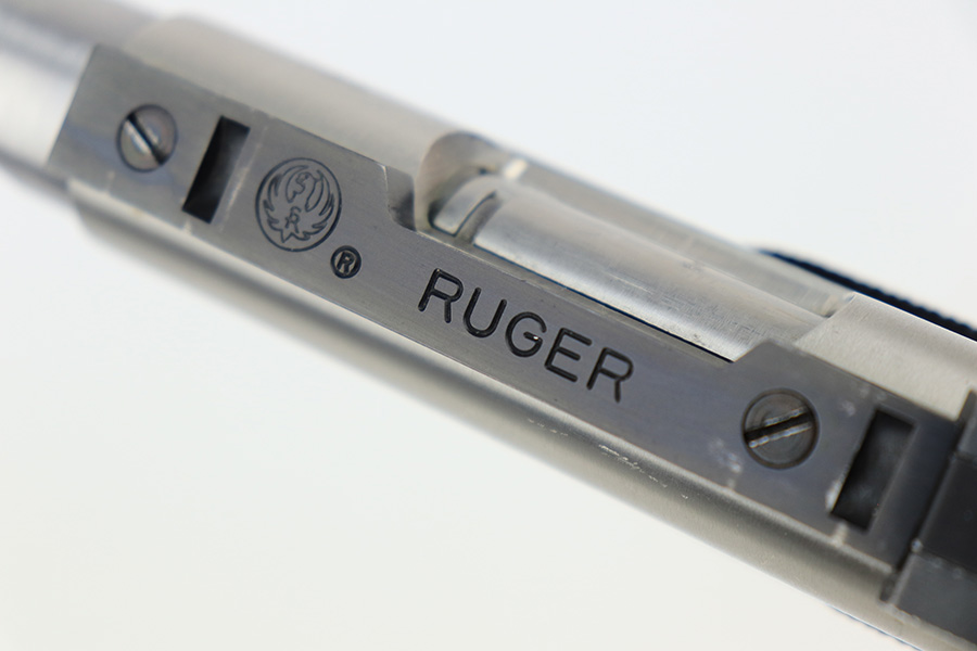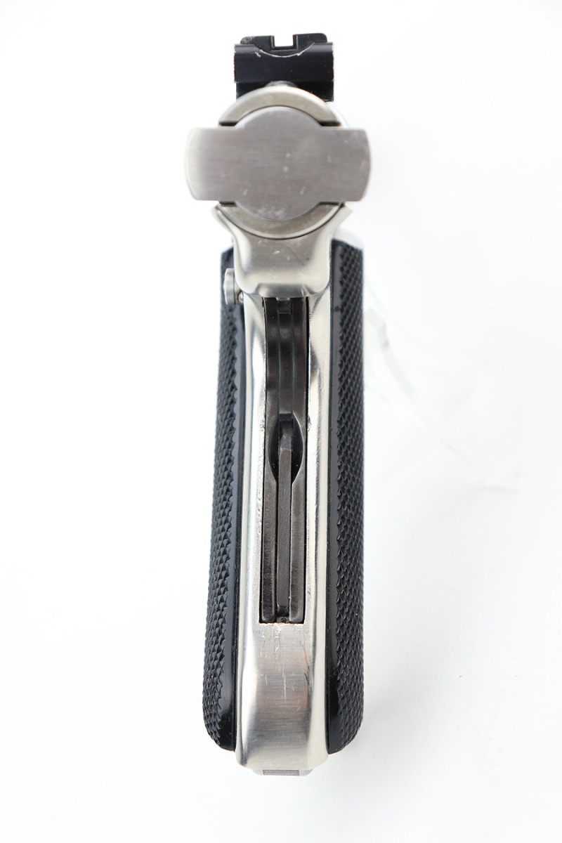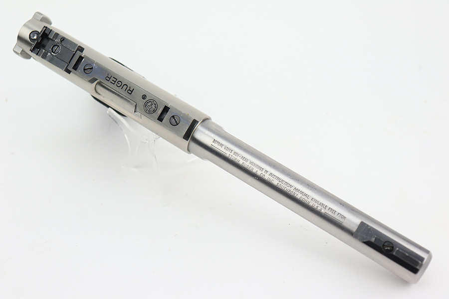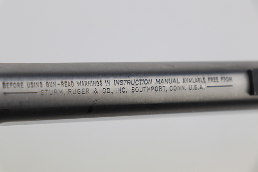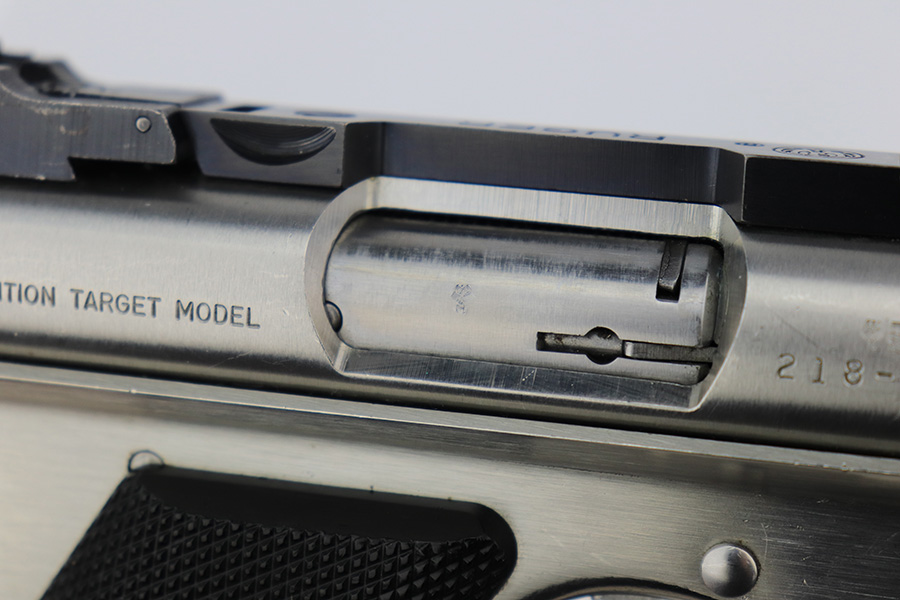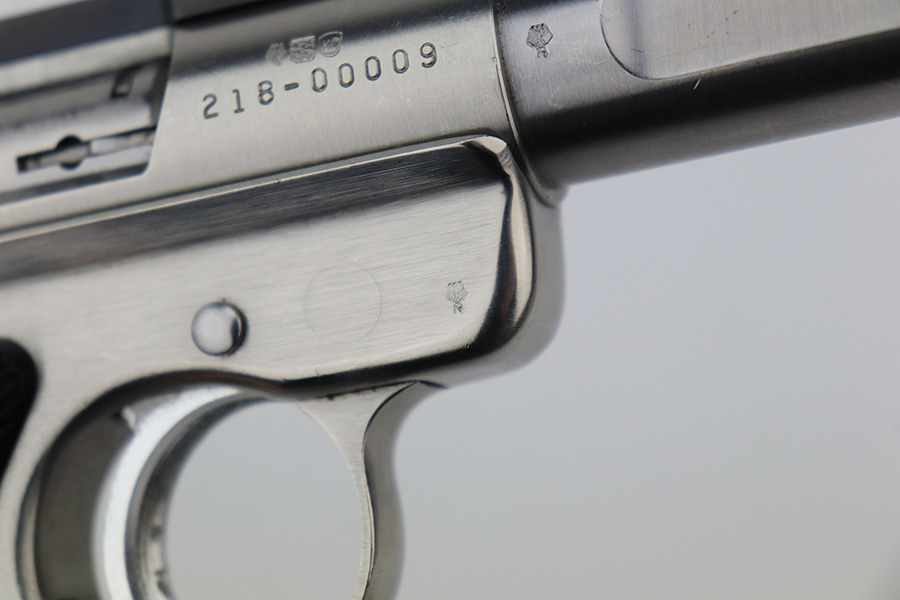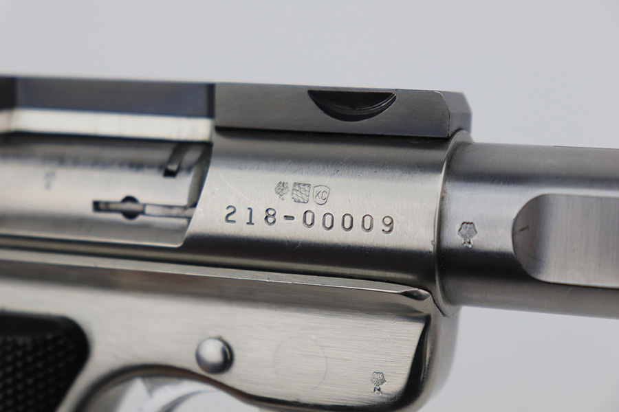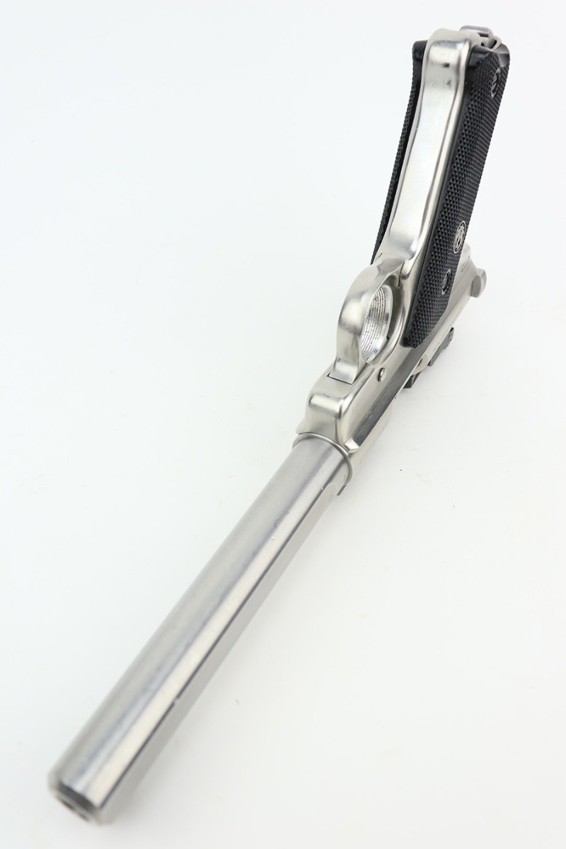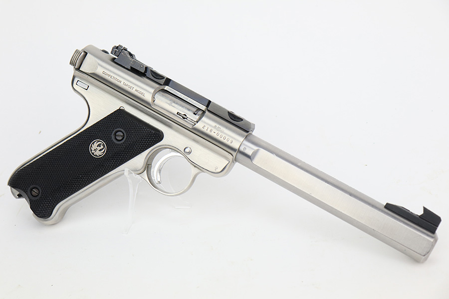 4/13/23 – This is an excellent example of a Ruger Mk II Competition Target Model, manufactured in 1992 and chambered in .22 LR . Only the 9th serial number that year. This one has a very nice stainless finish and a rare long slab side barrel. There are tiny scratches and handling marks throughout, but no major damage. Excellent black plastic grips. Comes with one proper magazine. Mint bore.
