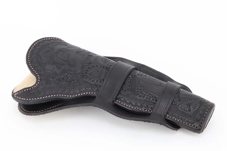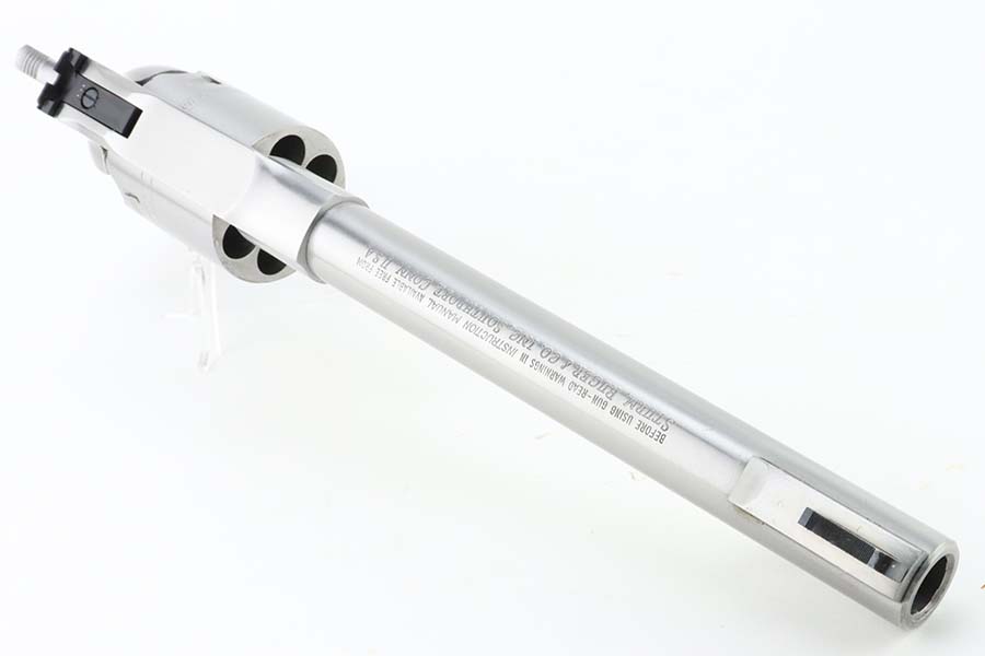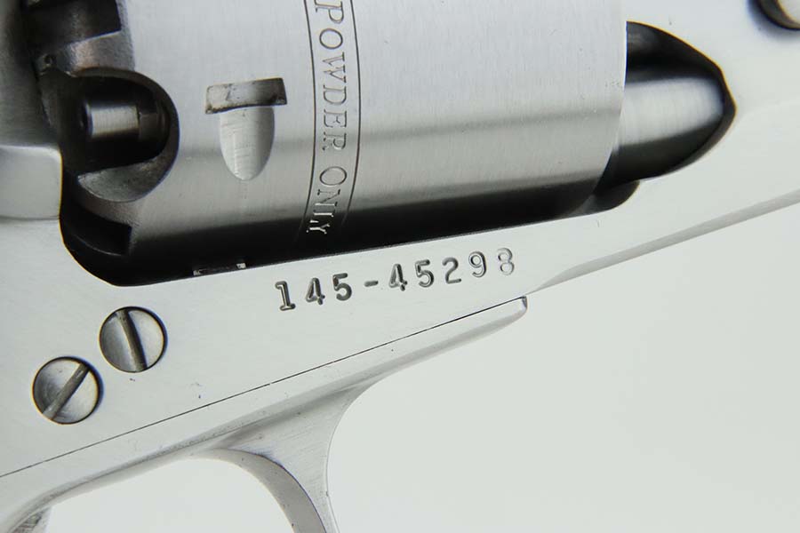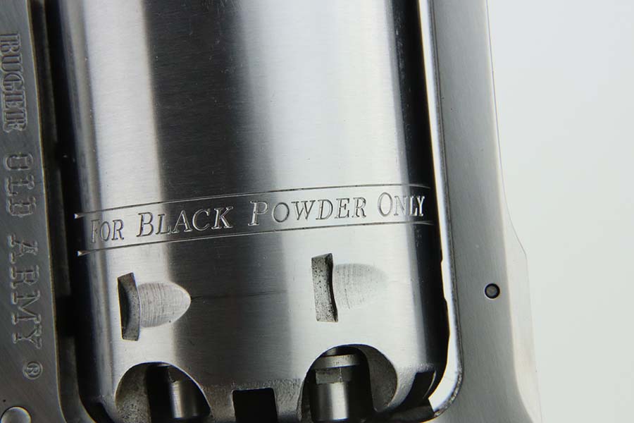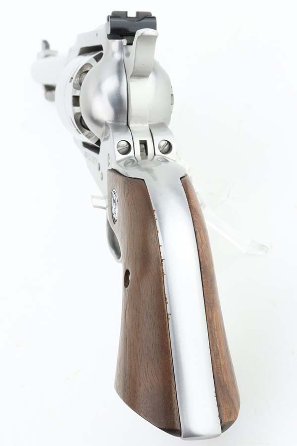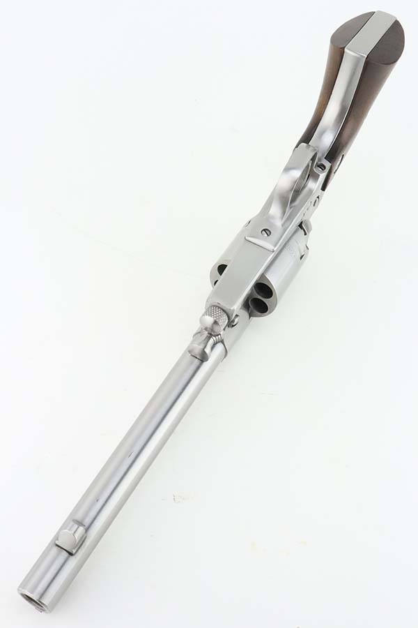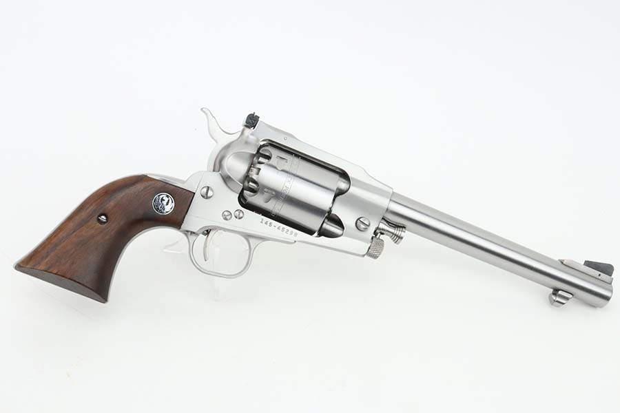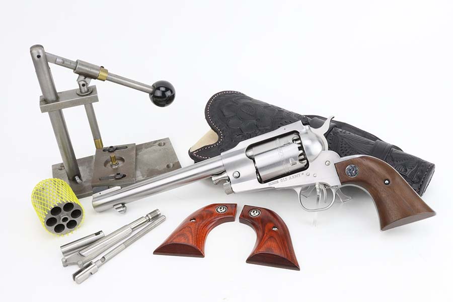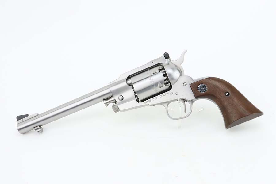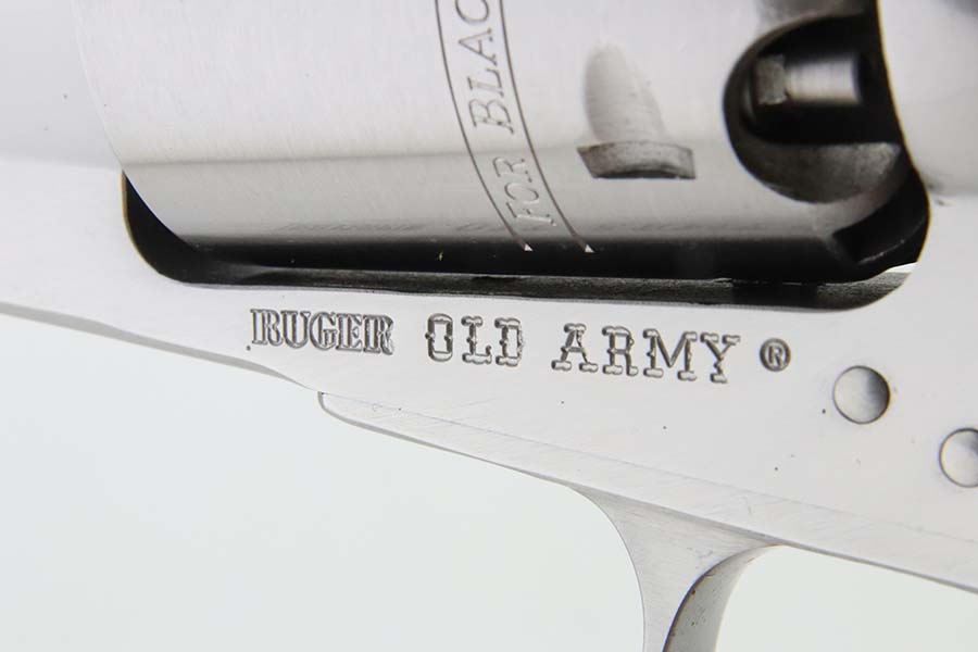 3/13/24 – This is a minty Ruger Old Army revolver, a modern black powder-only revolver, chambered in .44 Caliber. 7.5 inch barrel. This one comes with an excellent black leather holster, a spare cylinder, a spare set of grips, ejector rod, and an EZE Revolver Cylinder Loading Press. The gun has a really nice stainless finish and shows very little sign of wear or use – just a very light roll mark on the cylinder and a few tiny handling marks. Excellent wood grips. Like-new bore. Smooth action. No FFL required.