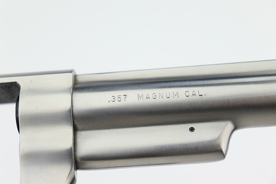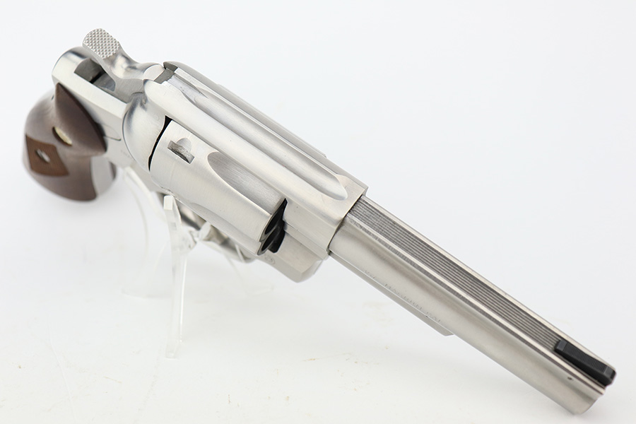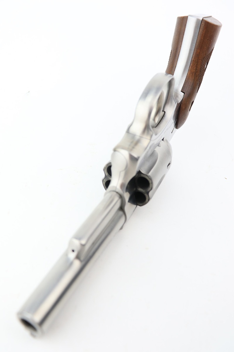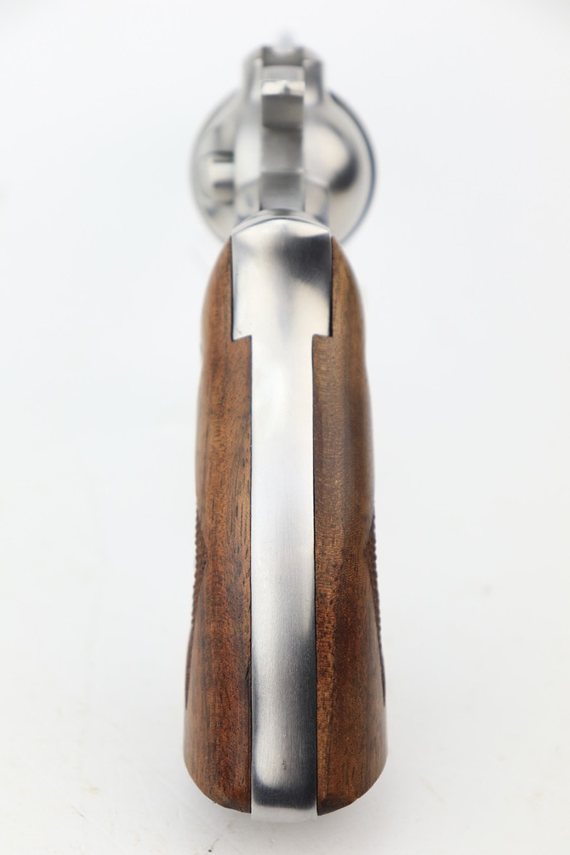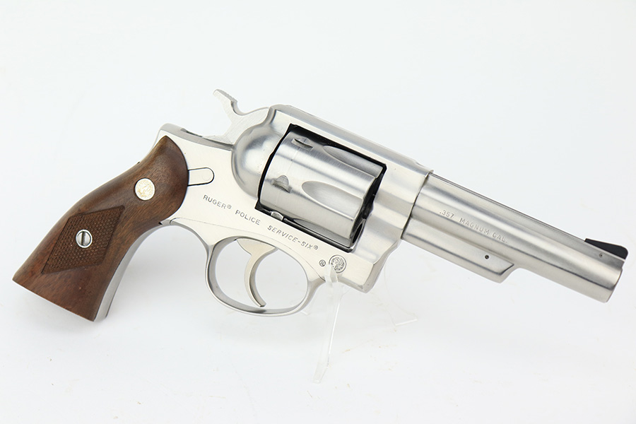 3/24/23 – This is a minty example of a Ruger Police Service-Six revolver made in 1976. Chambered in .357 Magnum with a very nice stainless steel finish. The left side of the frame is marked “Made In The 200th Year of American Liberty”. Minty condition with very little sign of use, just a few tiny scuffs here and there and a very light roll mark on the cylinder. Excellent wood grips. Mint bore.