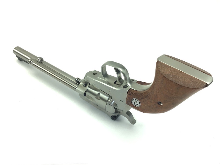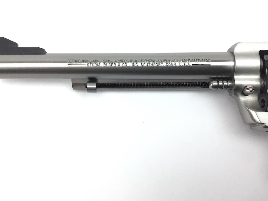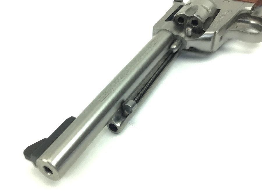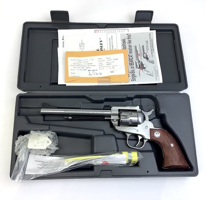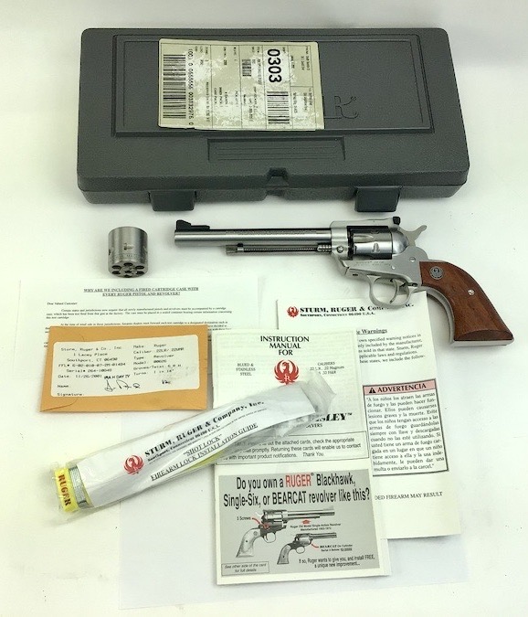 6/19/23 – This is a mint example of a Ruger Single-Six Convertible. Named as such because one cylinder is chambered in .22 LR, and the alternate cylinder is .22 Magnum. Beautiful stainless steel construction with a 6″ barrel. Includes matching numbers case, owners manual, test fire brass, 2 cylinders and safety lock. Very minor roll marks on the cylinders. Mechanically sound with smooth action and solid lock up. Features windage and elevation adjustable rear sights. Extra cylinder allows you to quickly change from shooting .22 LR to .22 WMR.