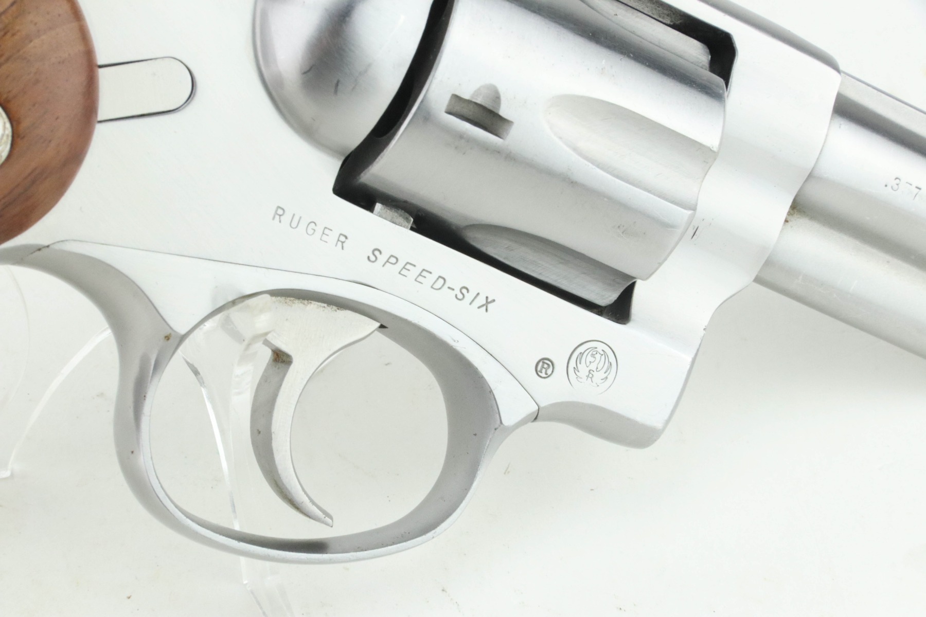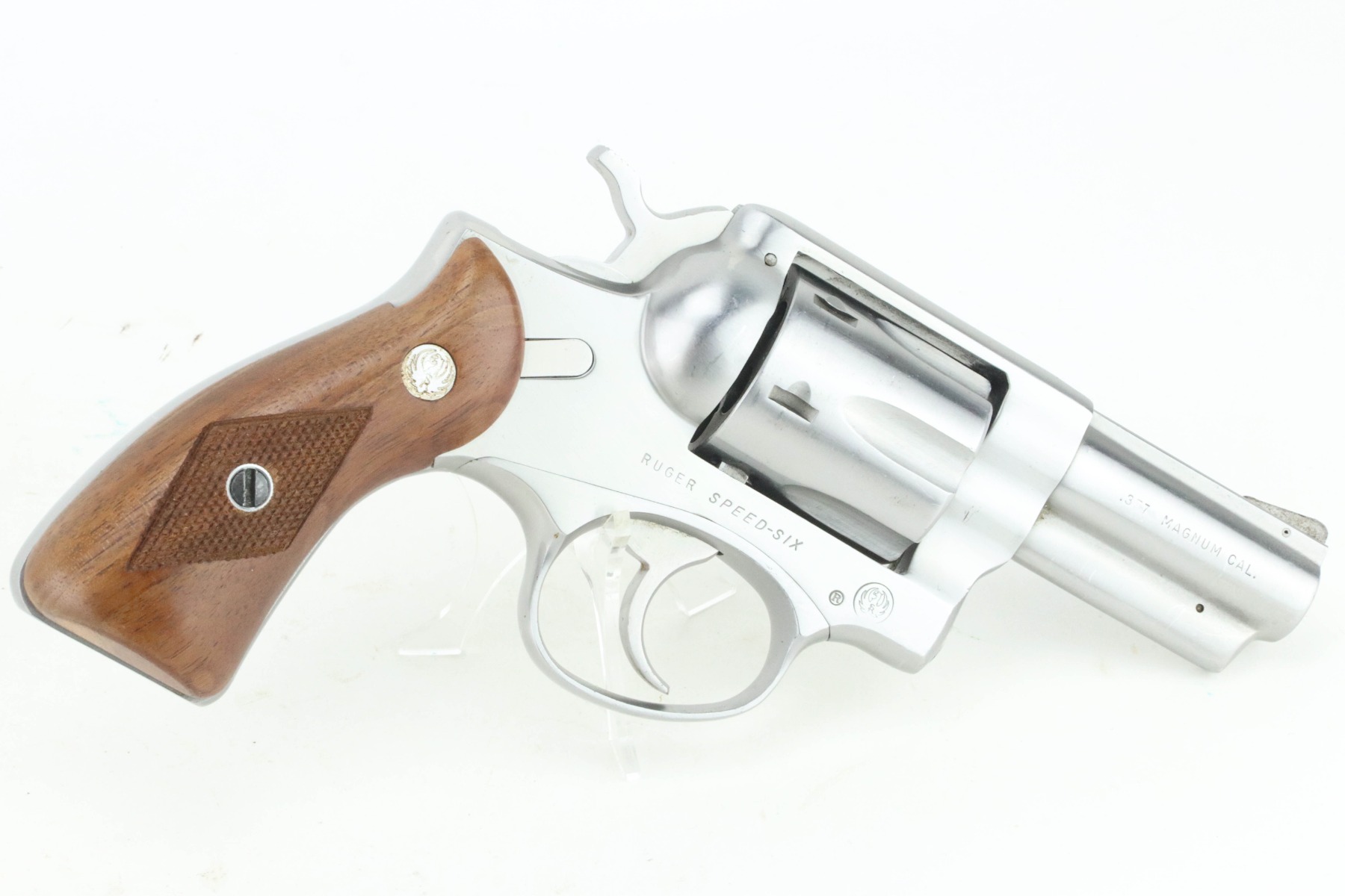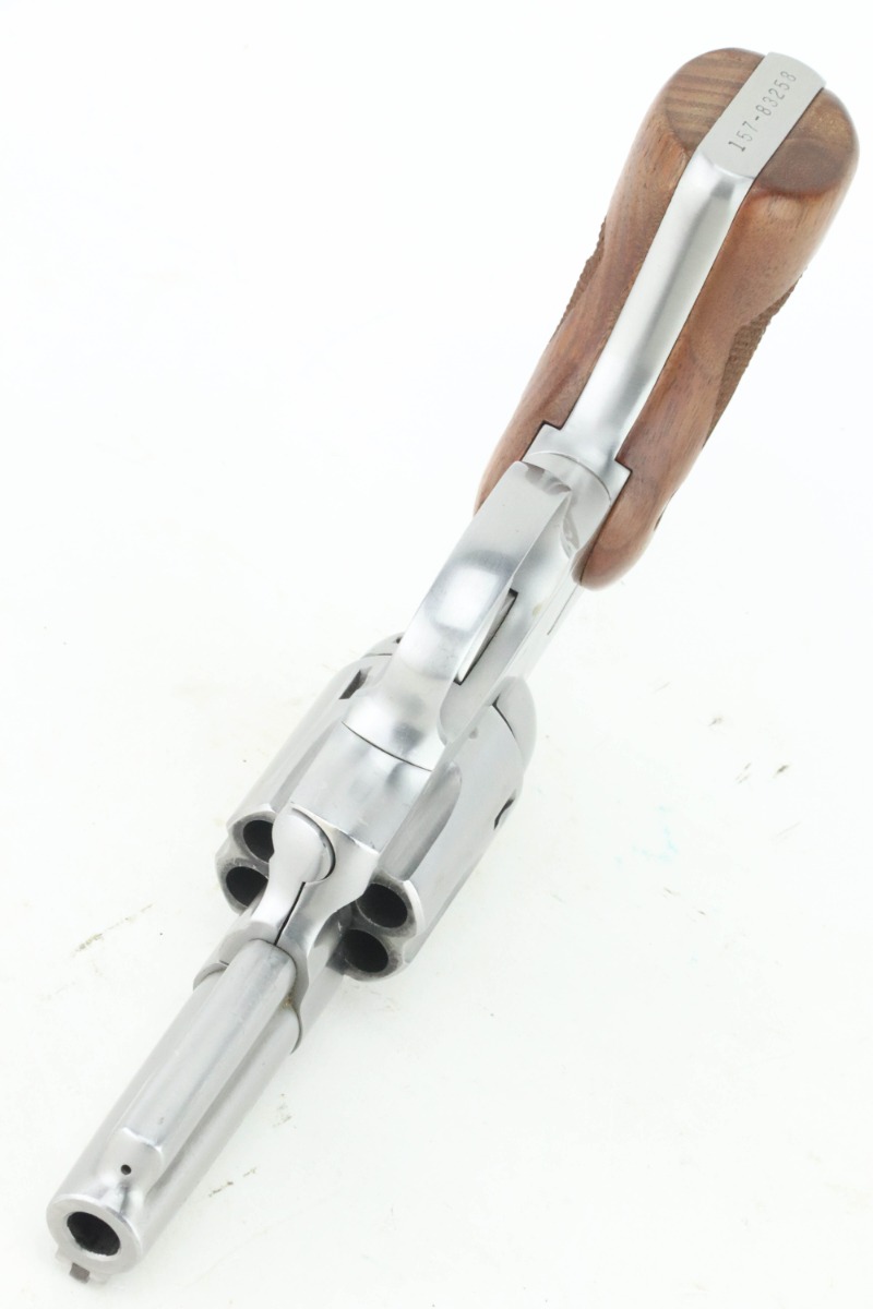 9/5/24 – This is a very nice example of a Ruger Speed-Six revolver, manufactured in 1981 and chambered in .357 Magnum. It has a nice stainless finish. There are just tiny surface scratches here and there. Fitted with excellent wood grips. The bore has strong rifling, but there is very light pin-pricking throughout.
