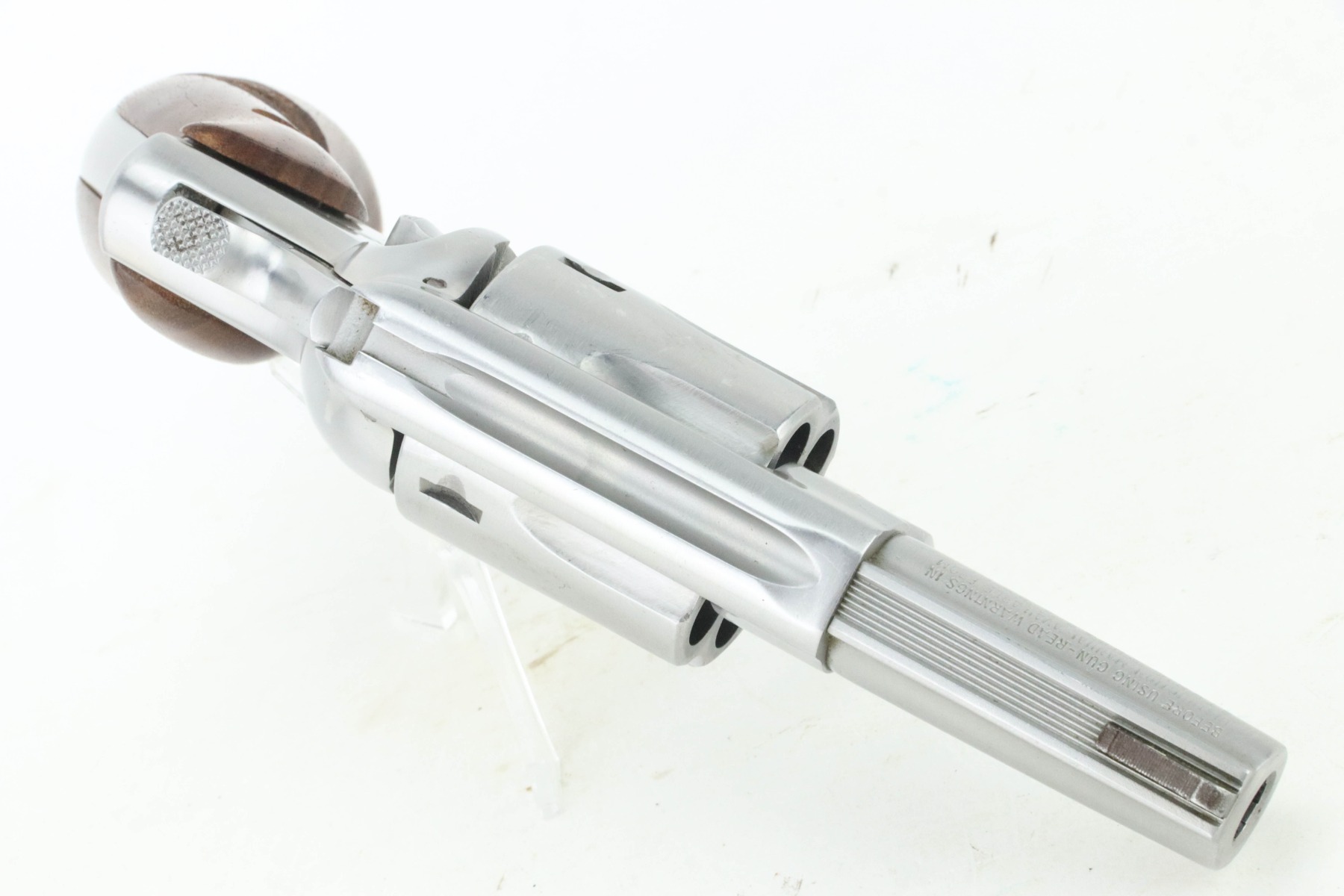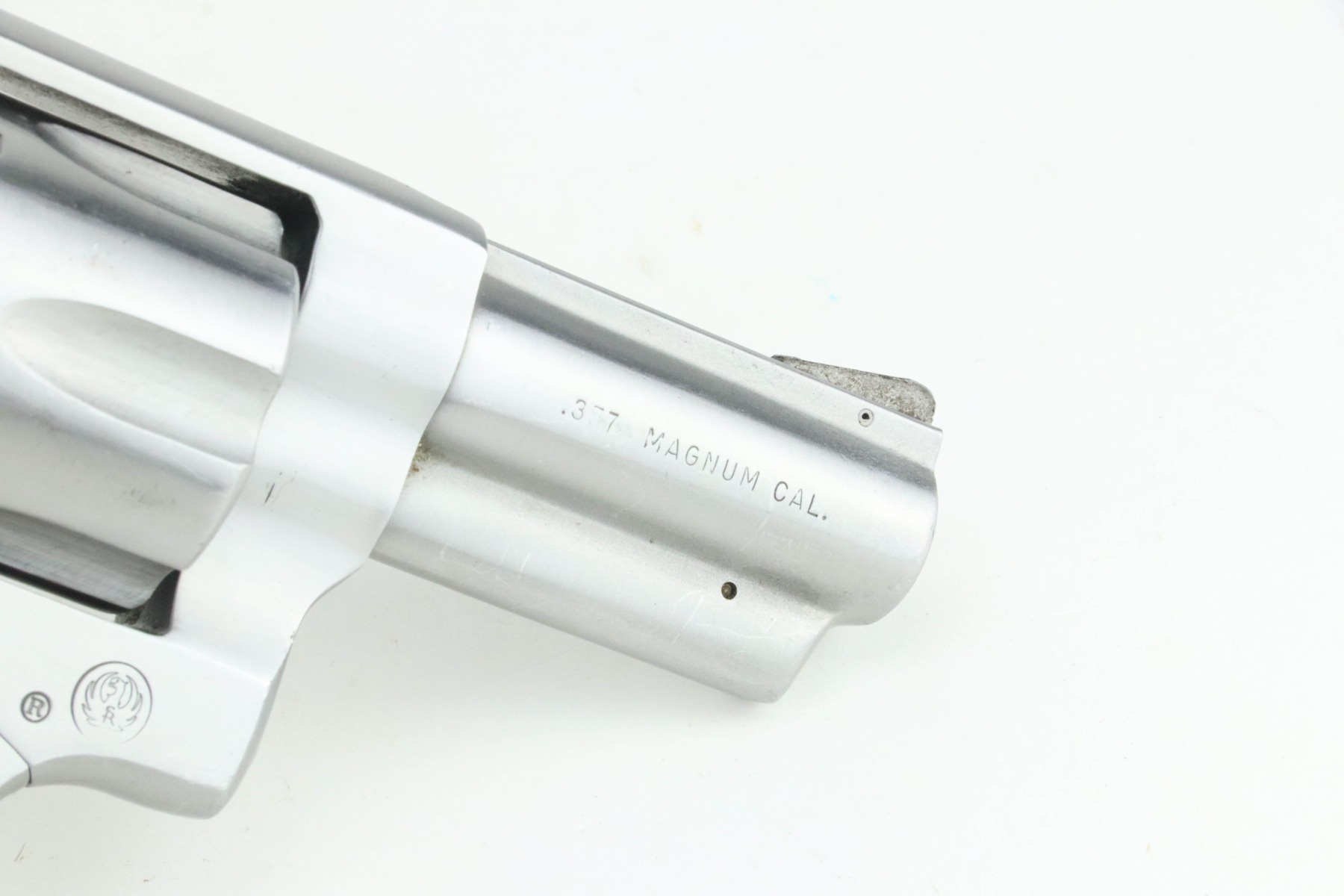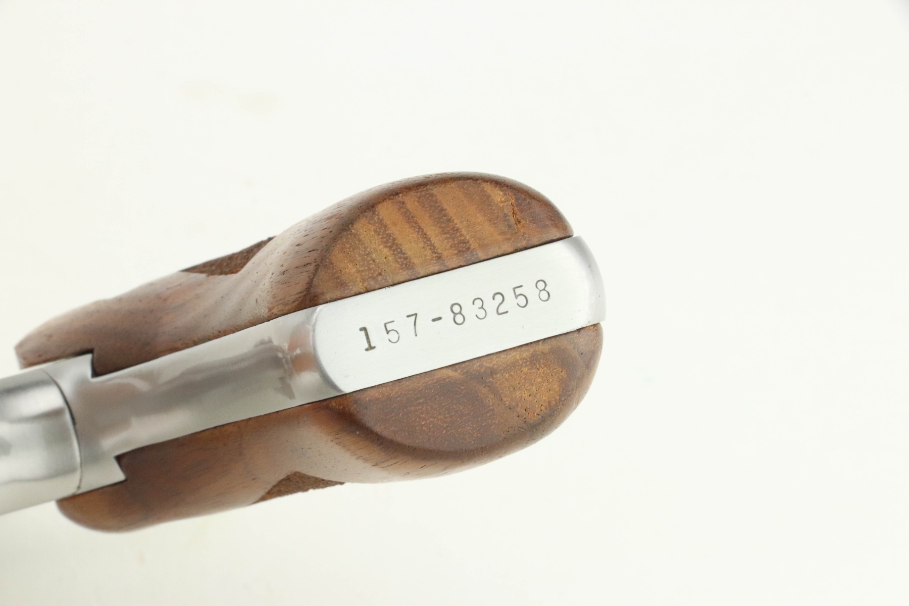 9/5/24 – This is a very nice example of a Ruger Speed-Six revolver, manufactured in 1981 and chambered in .357 Magnum. It has a nice stainless finish. There are just tiny surface scratches here and there. Fitted with excellent wood grips. The bore has strong rifling, but there is very light pin-pricking throughout.
