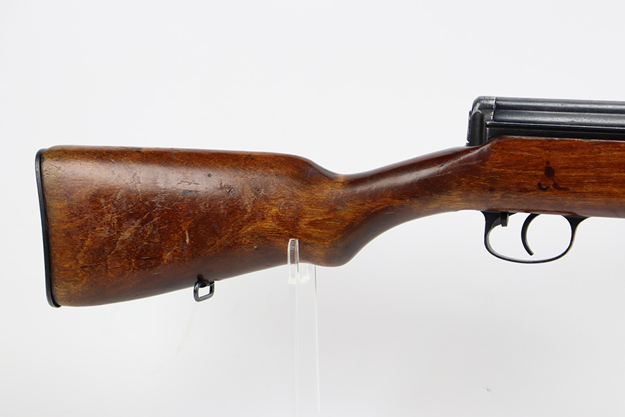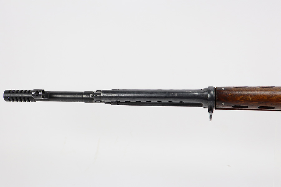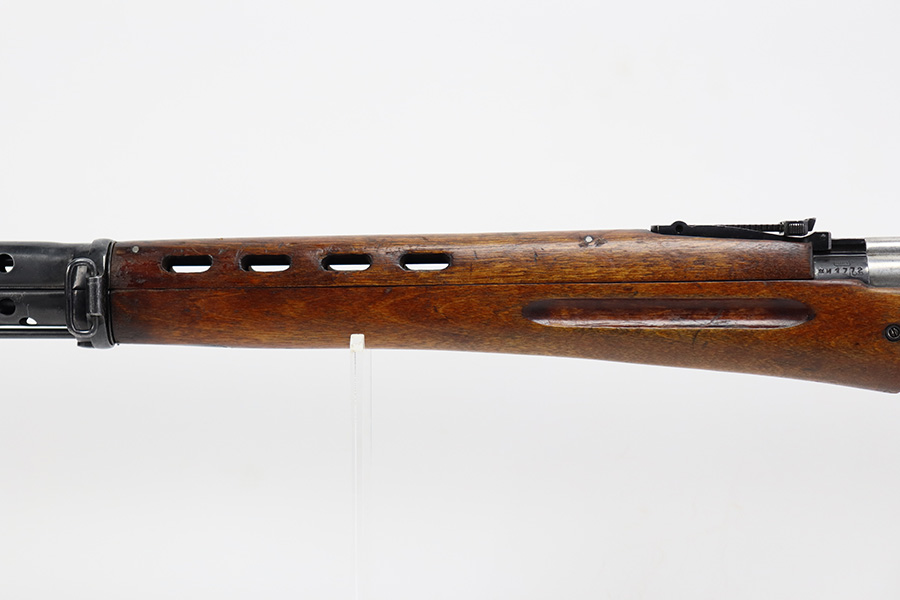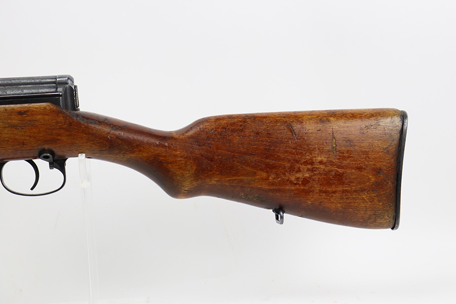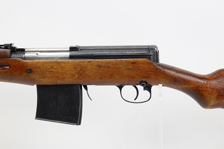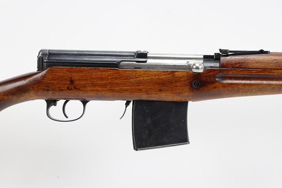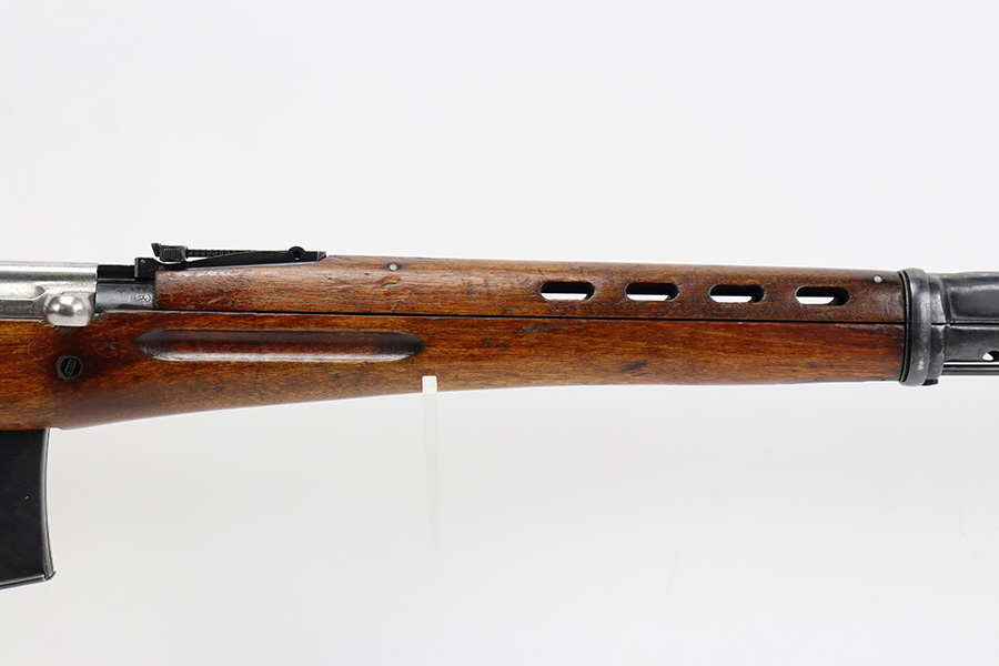 7/27/23 – This is a very nice example of a scarce Russian SVT-40. Made in 1941 at the Izhevsk factory, it’s mismatched throughout but not a refurbished or import marked example. The receiver and magazine are ‘SA’ marked, indicating Finnish capture. Not much bluing loss on the metal parts, but minor, spotty oxidation in some areas. Stock is in good condition but has some minor chips. Faint cartouches are still visible on the right face. Comes with cleaning rod. Bore has strong rifling but is frosted and very dirty, and in need of a good cleaning.