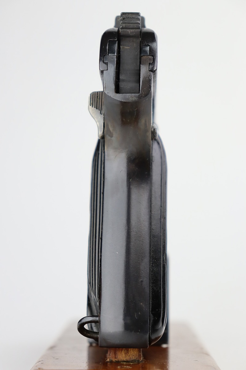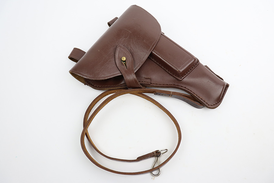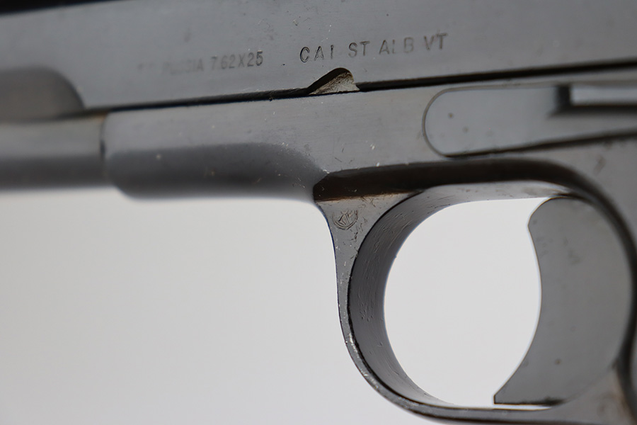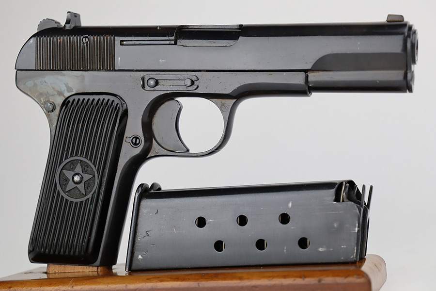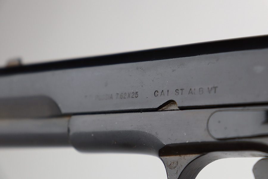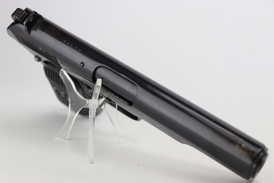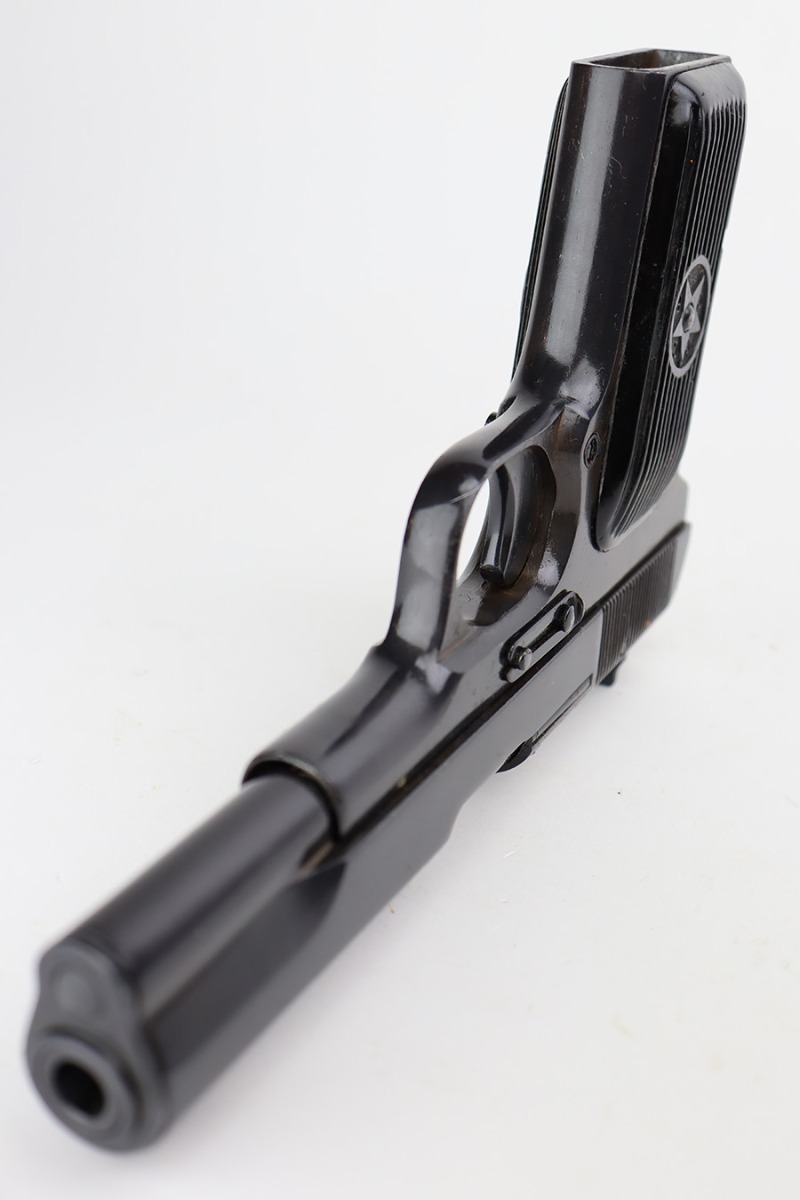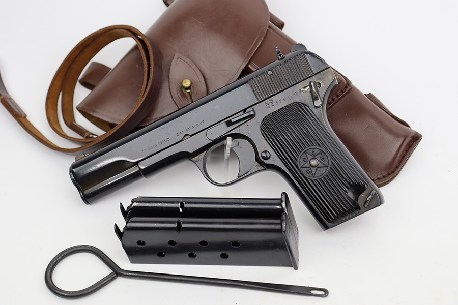 8/8/23 – This is an excellent example of a Russian Tokarev TT-33, chambered in 7.62x25mm. All matching with an import mark on the left side of the slide. An external safety lever was added at the arsenal. The date of manufacture is obscured by the milling for the safety. It comes as a rig with a mint leather holster, shoulder strap, two mismatched magazines, and a cleaning rod. The gun has been arsenal-refurbished and refinished. There is virtually no actual bluing loss, but there is some minor dulling on the grip straps and some discoloration at the back of the frame from when they added the safety lever. Fitted with black bakelite grips – a couple of tiny chips on both sides. Excellent, shiny bore with strong rifling.