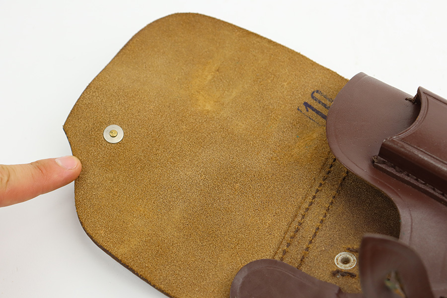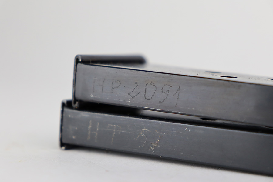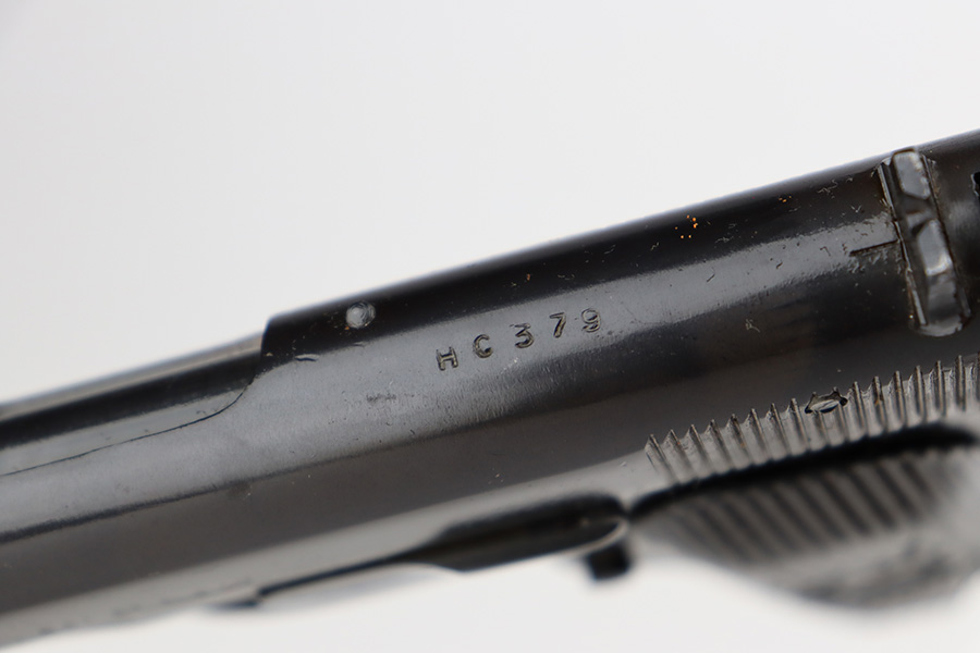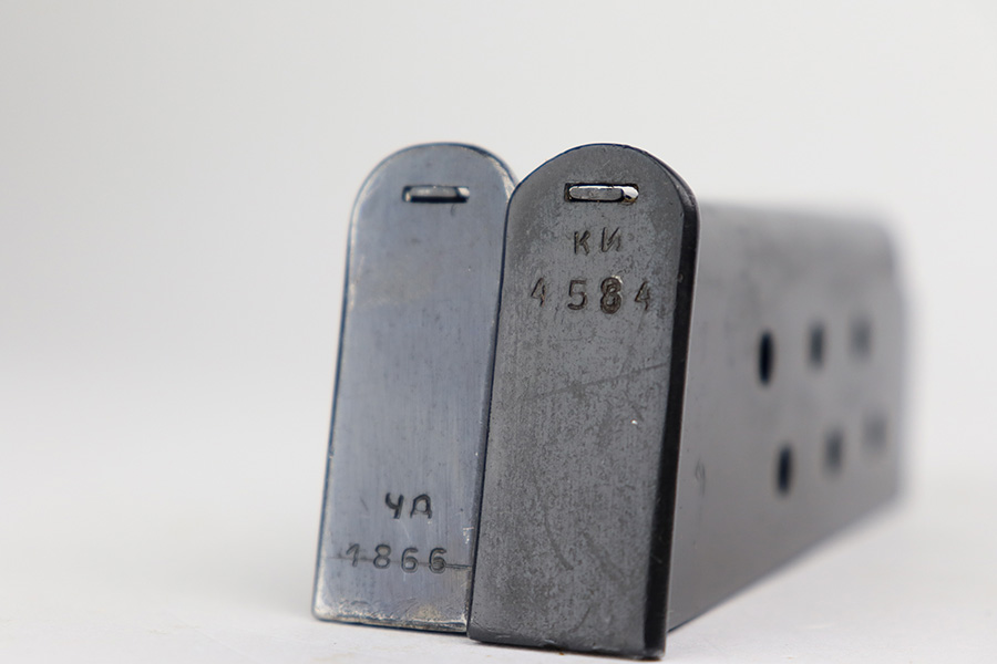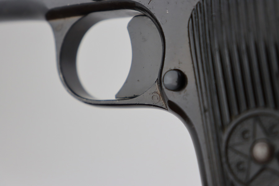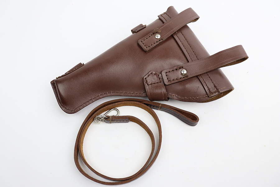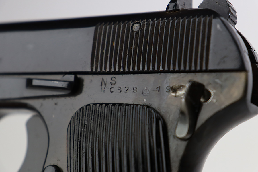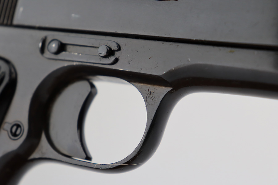 8/8/23 – This is an excellent example of a Russian Tokarev TT-33, chambered in 7.62x25mm. All matching with an import mark on the left side of the slide. An external safety lever was added at the arsenal. The date of manufacture is obscured by the milling for the safety. It comes as a rig with a mint leather holster, shoulder strap, two mismatched magazines, and a cleaning rod. The gun has been arsenal-refurbished and refinished. There is virtually no actual bluing loss, but there is some minor dulling on the grip straps and some discoloration at the back of the frame from when they added the safety lever. Fitted with black bakelite grips – a couple of tiny chips on both sides. Excellent, shiny bore with strong rifling.