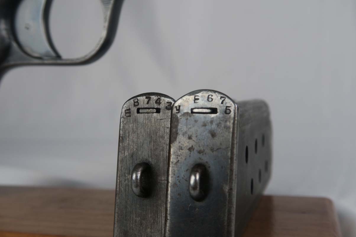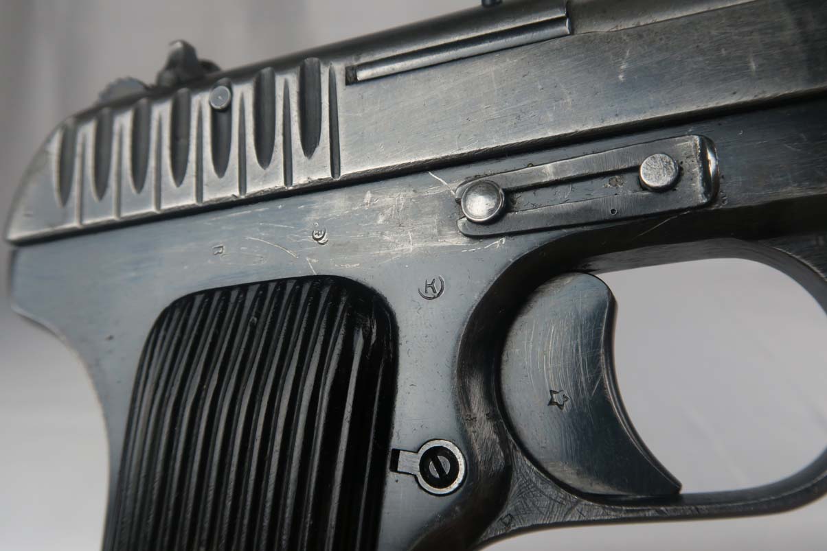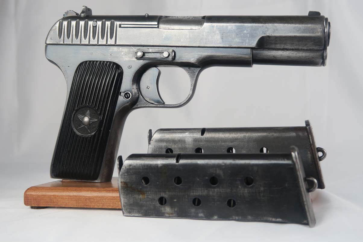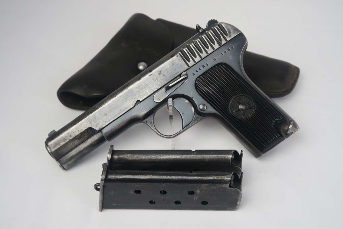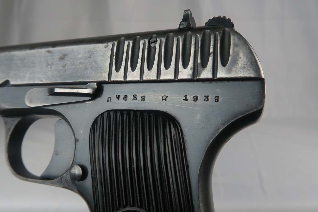 3/7/17 – This is a vet bring back Russian WWII TT33 complete rig, made in 1939. This is an honest gun in 75-80% original condition with holster wear as per pictures but no pitting.  It is all matching with very good bore (slightly frosted) and grips and 2 correct wartime non-matched mags and a holster.  The barrel and trigger assembly are also numbered and matching to the gun.  It was made at the Tula factory and is profusely proofed with the “five pointed star” proof on most parts. This rugged gun, chambered in hard-hitting 7.62 Tok caliber, went through five years of war and still functions like it was made yesterday.  A great, honest, complete WWII rig!