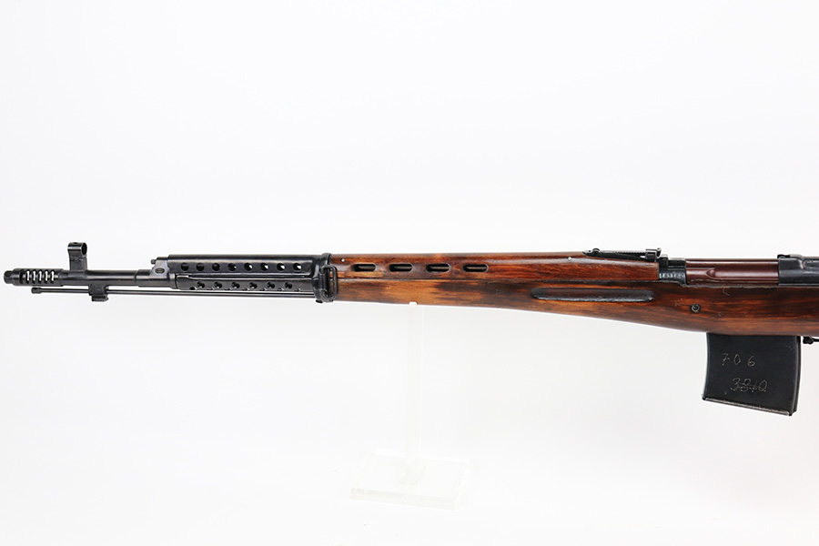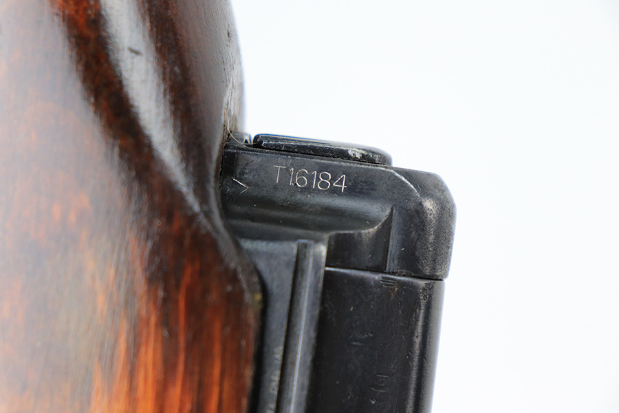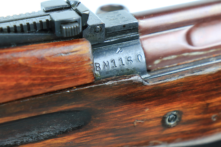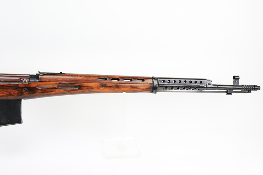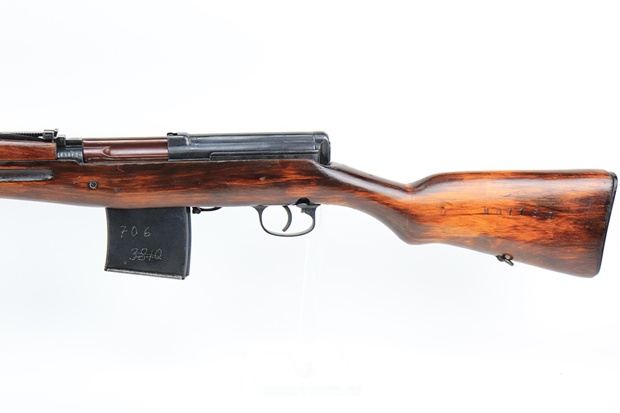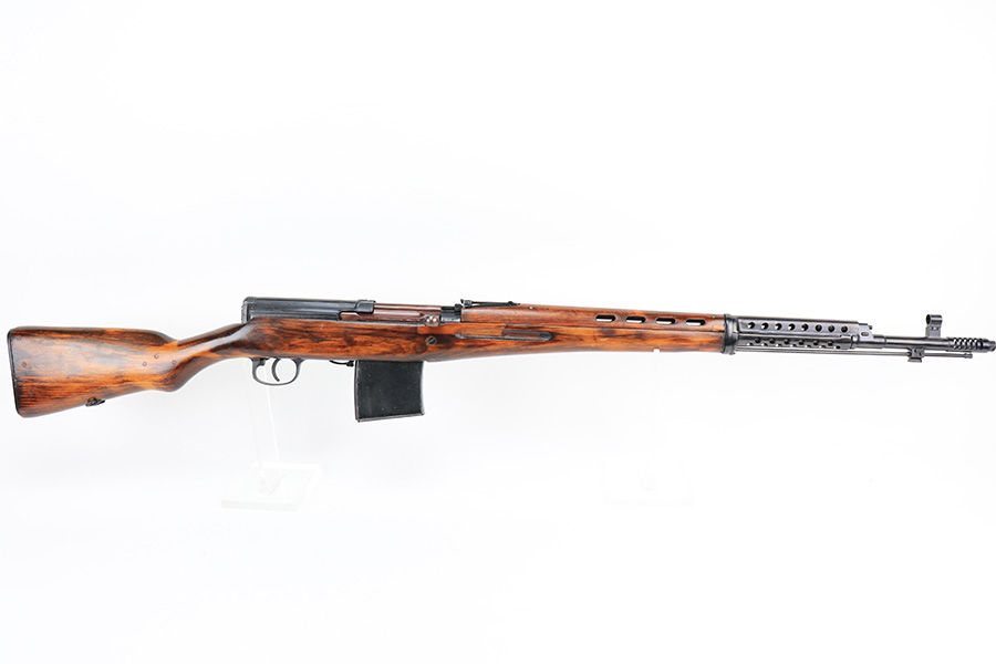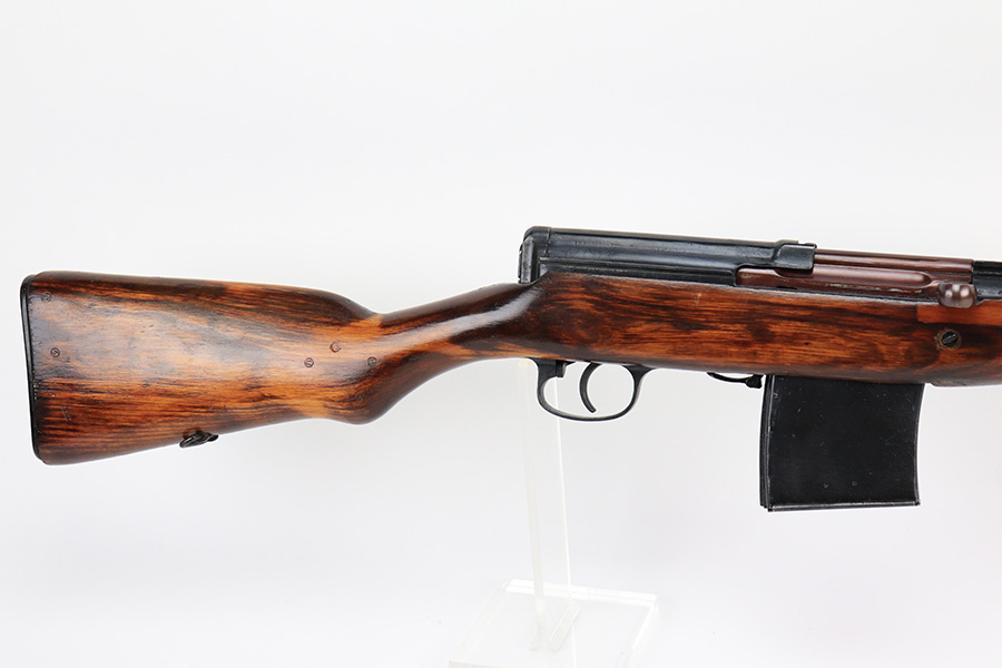 4/21/22 – This is a excellent example of a scarce Russian SVT-40. Made in 1941 at the Tula factory, it’s arsenal refurbished with etched serial on bolt handle but matching numbers are present on the receiver, bolt, trigger guard and stock. Excellent condition throughout – no wear to the bluing of the refinish. Bore has some frost throughout but strong rifling. Stock is in terrific condition and has several small Russian proofs on the right side. Small import mark on right side of receiver. Includes a cleaning rod.