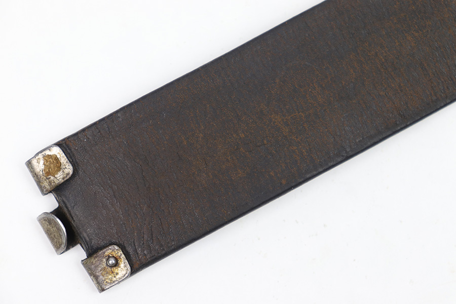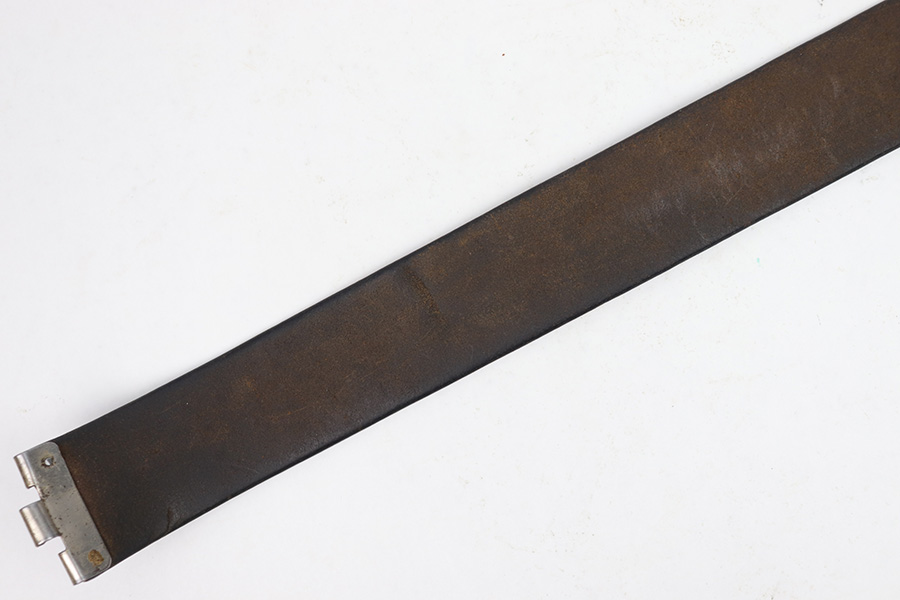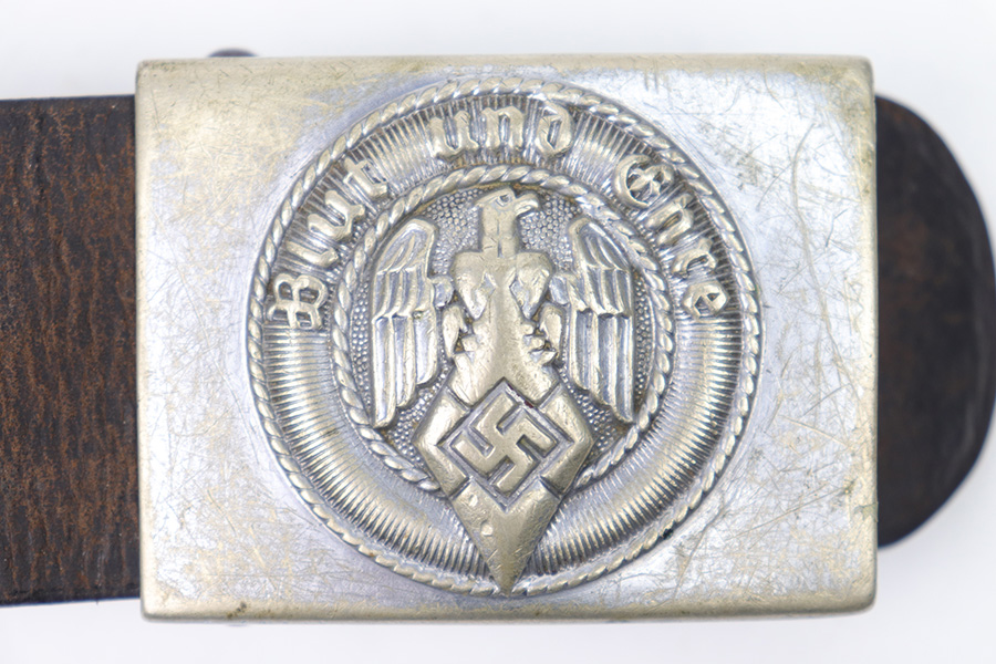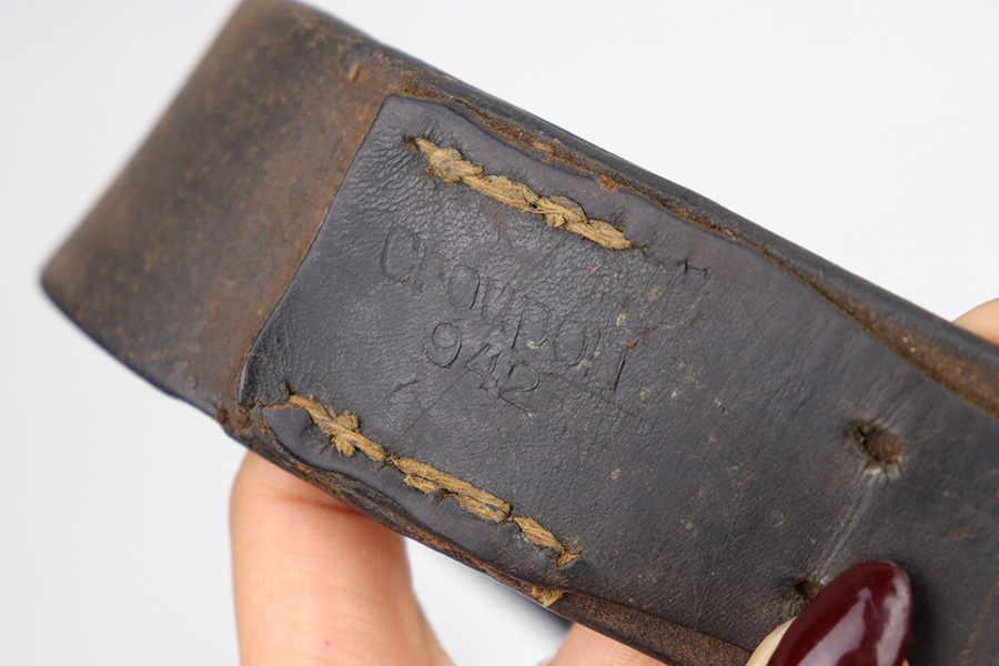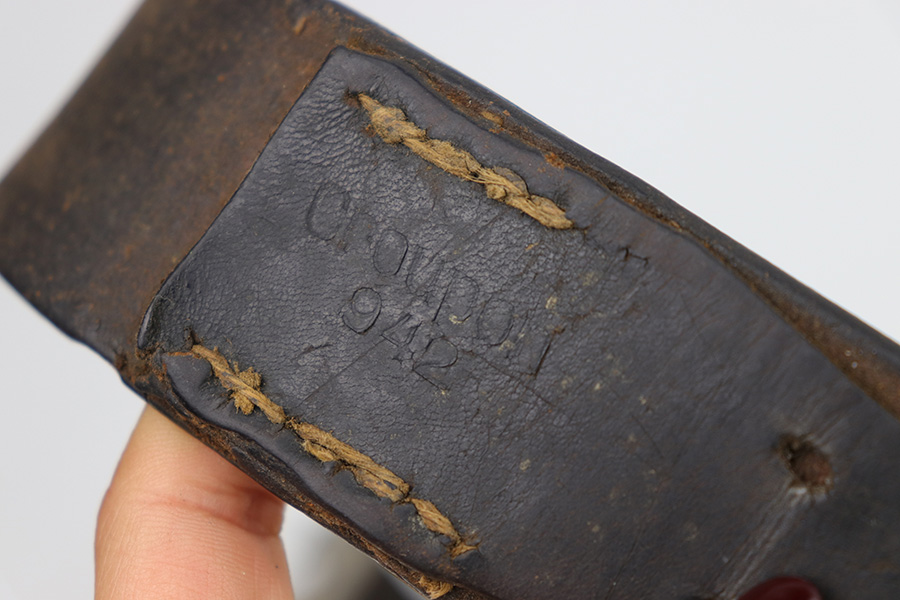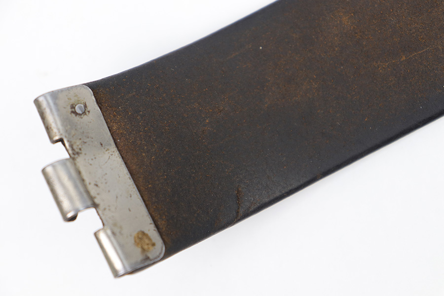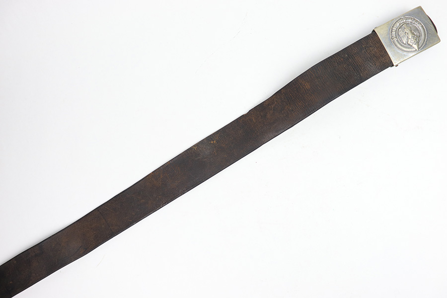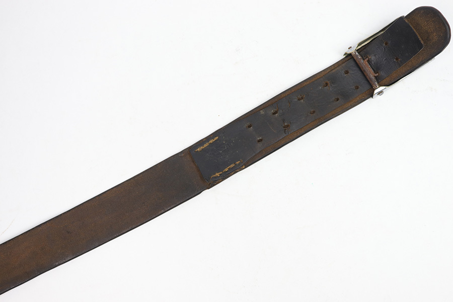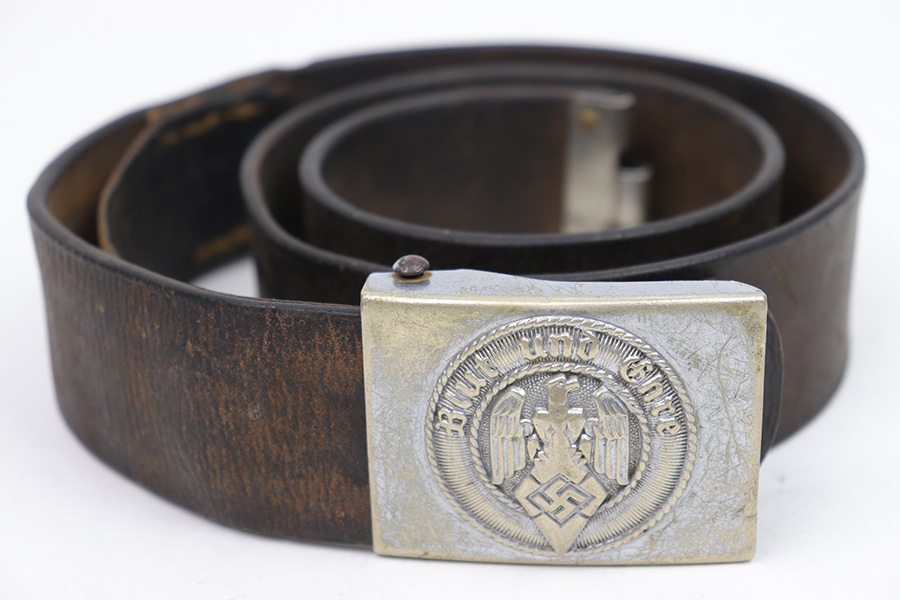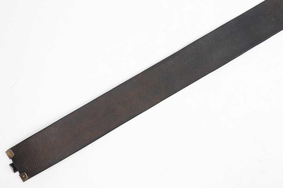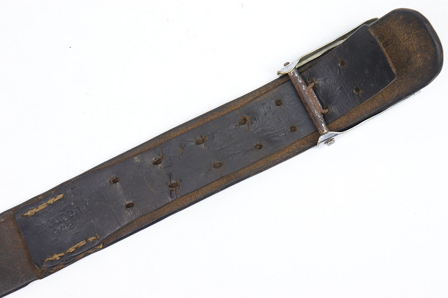 1/10/23 – This is an original WW2 production Hitler Youth belt buckle with an original leather belt. The buckle is in very good condition but has some mild surface wear which is mostly scuffs and surface patina throughout the front of the buckle. The interior of the buckle is well marked with a RZM stamp as well as “KHM 4/49” and a small circular maker symbol of some sort. The leather belt has surface wear and aging throughout, leaving the leather soft and pliable but still completely intact with no major cracks or issues. The interior leather of the belt is stamped “croupon 942” but we’re not sure if this is an original or post-factory stamp.
