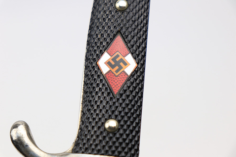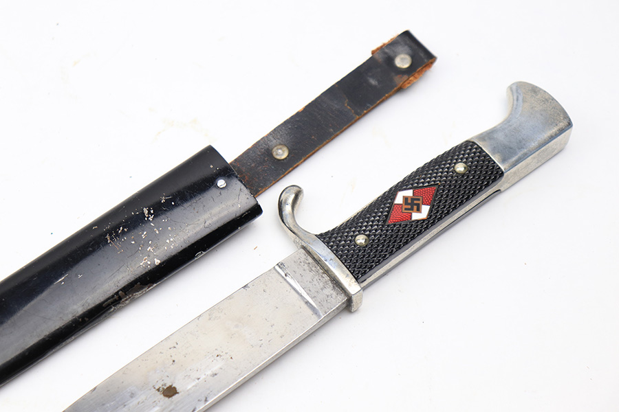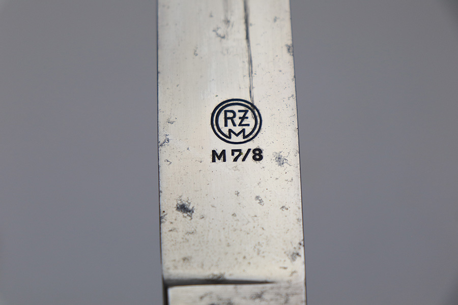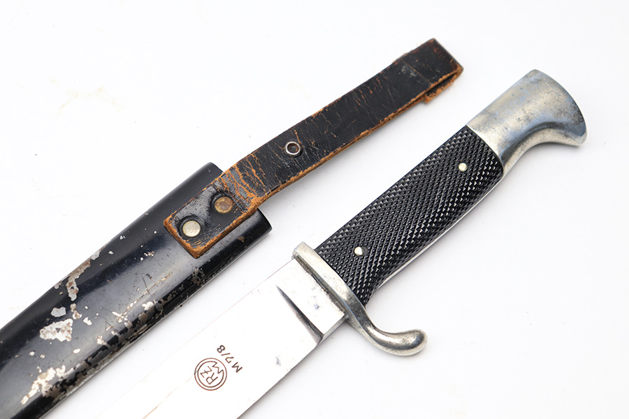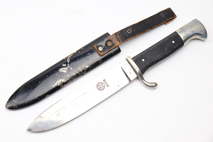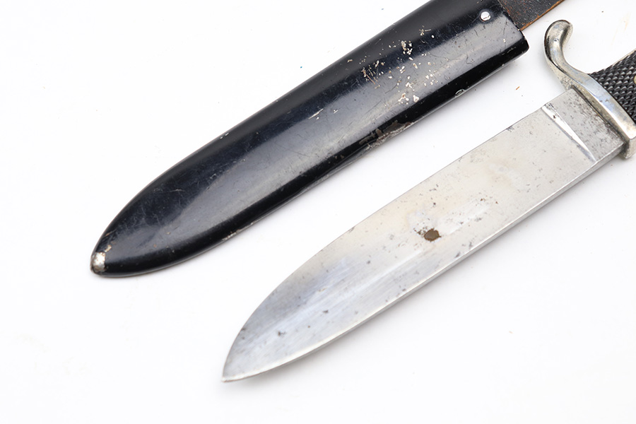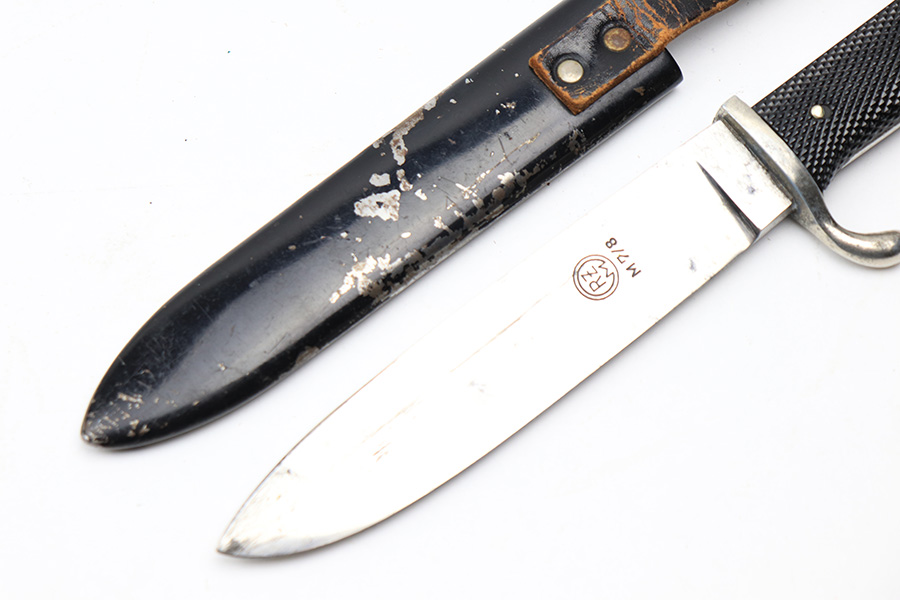 3/11/22 – This is an original WW2 Hitler Youth Knife. The knife has a fairly clean blade, despite a few spots of dark discoloration and normal oxidation. The edge shows no signs of sharpening. One side of the blade is maker stamped with an RZM logo. The handle is in excellent condition with no cracks or chips. The metal pommel and hand guard have light surface patina but no major issues. The scabbard has no dents but there is some light paint loss, and the leather securing loop is missing from the frog.